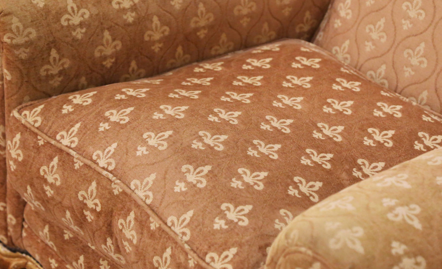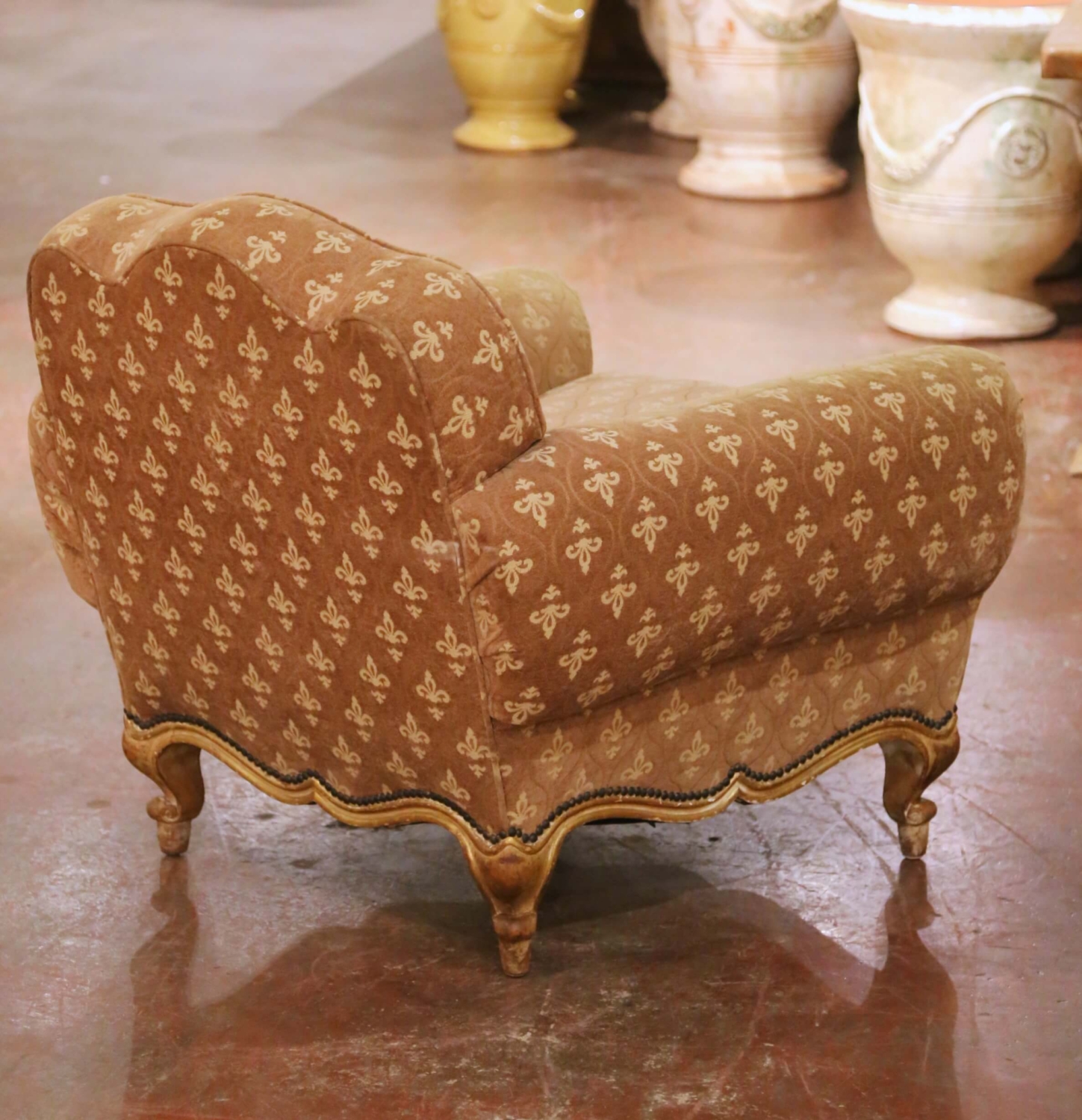 This antique French Louis XV style club armchair, crafted circa 1870, features a generous, deeply comfortable form with wide rounded arms and a pitched back crowned by a scalloped crest. The carved wood frame stands on scrolled feet over a scalloped apron and retains a soft white washed painted finish accented with touches of gilt. The chair is upholstered in a warm tan fabric decorated with classic Fleur-de-Lys motifs and finished with decorative brass nailhead trim along the lower rail. A loose down seat cushion provides excellent comfort and inviting depth, making the chair ideal for everyday use as well as display. Well suited for a study, library, or living room, this antique French club armchair offers both comfort and strong decorative presence. The chair is in excellent commensurate with age and use, with light wear consistent with its history. Measures: 37″ W x 38″ D x 34″ H. Seat Height: 20.5″H