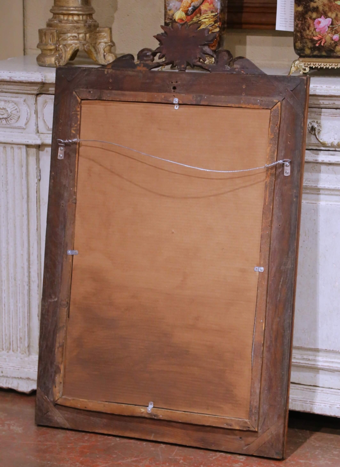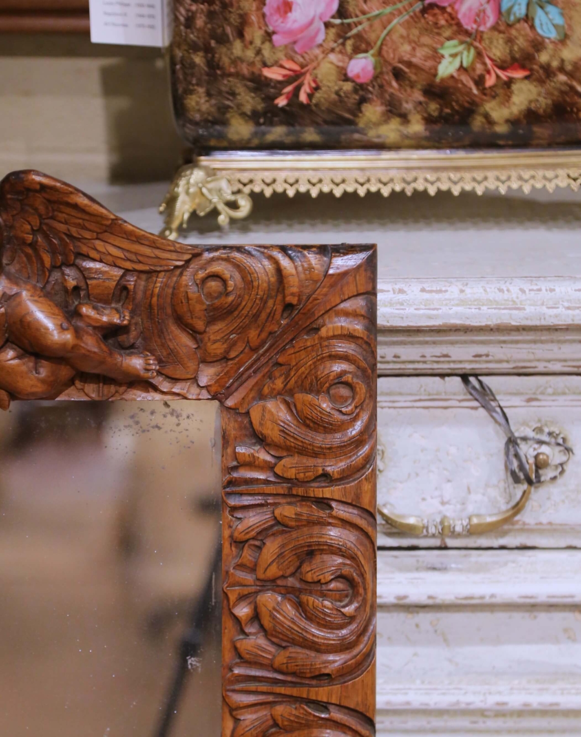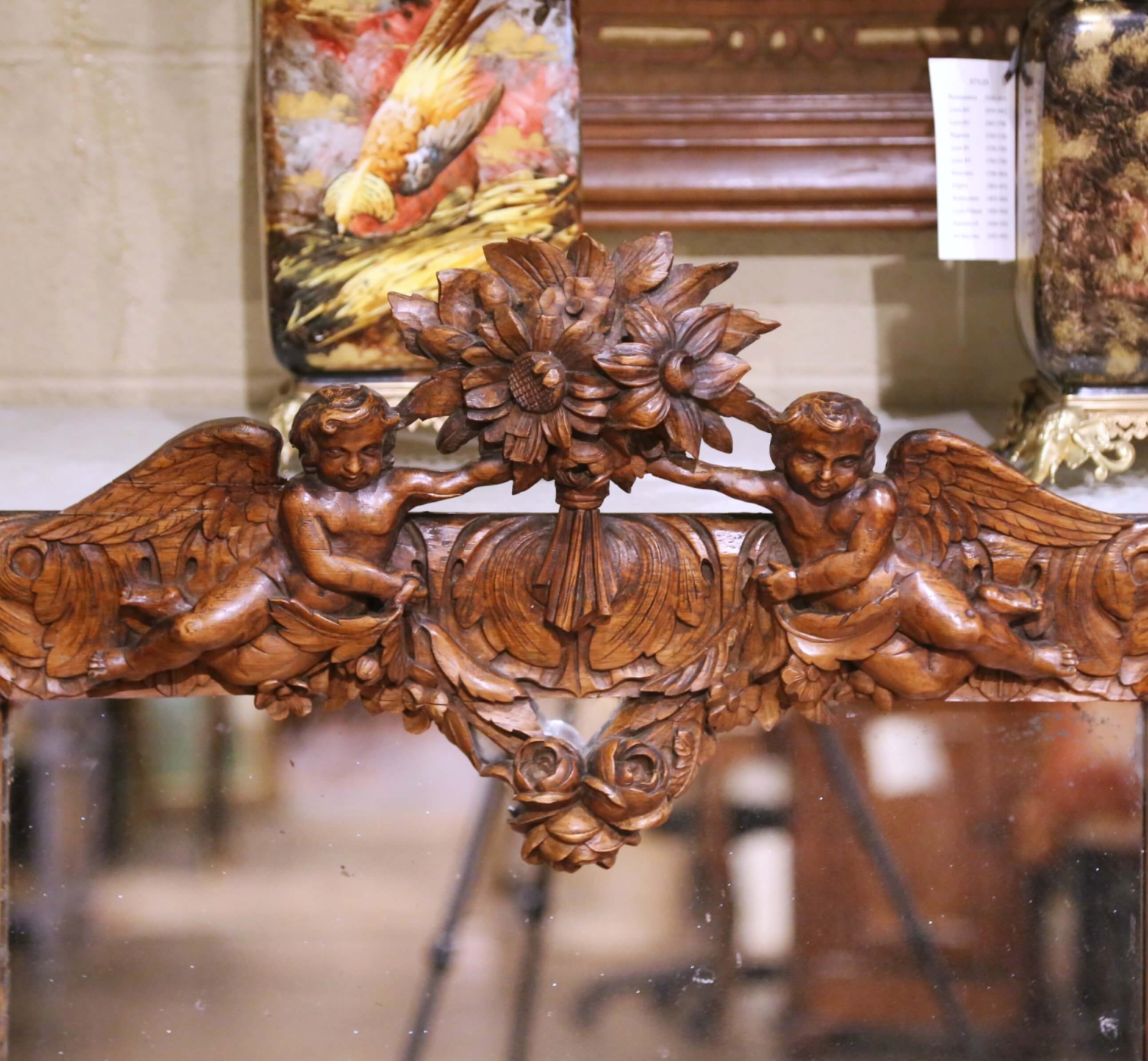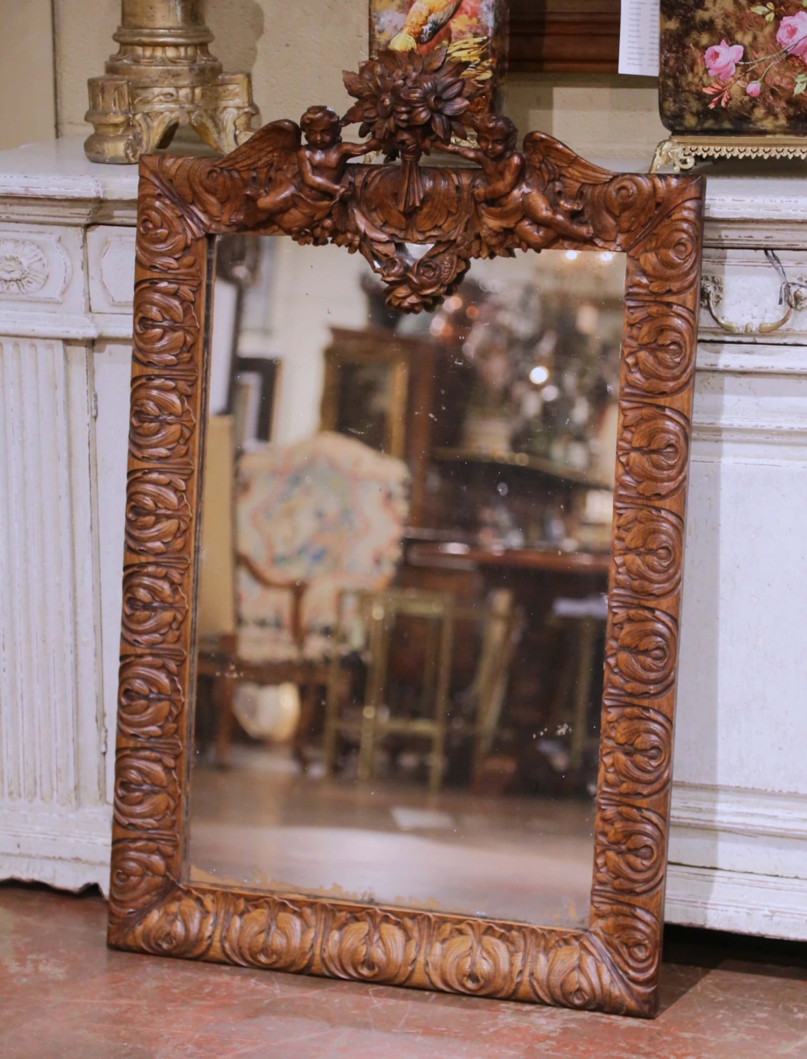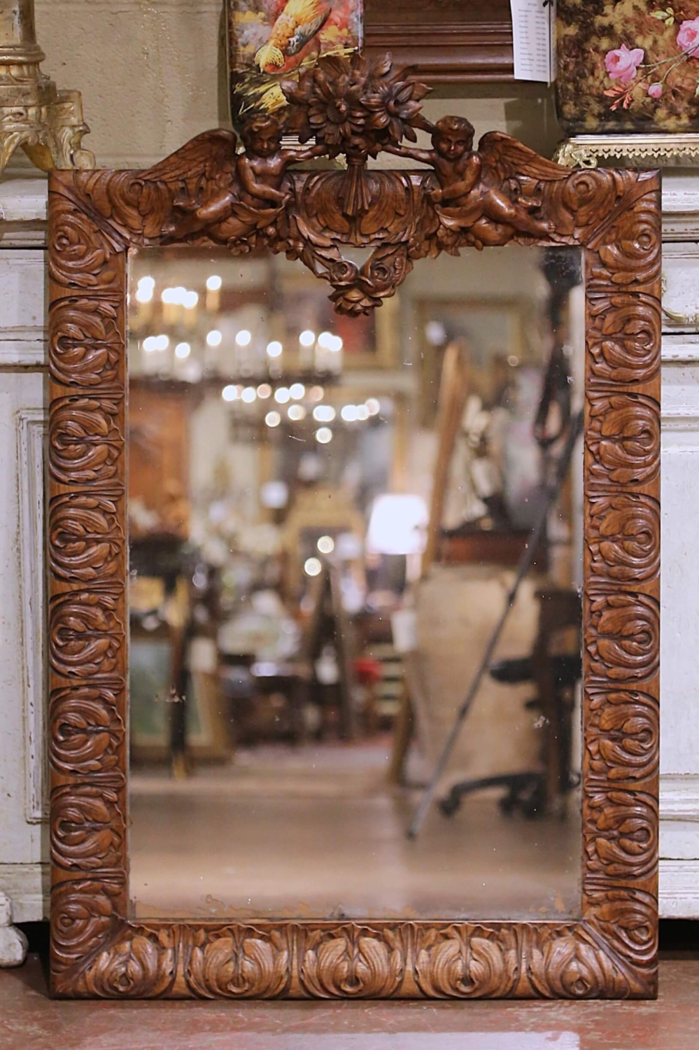 This elegant antique French wall mirror was crafted in solid oak circa 1860 and reflects the refined ornamental language of the Louis XV style during the mid-19th century Rococo Revival period. The deeply carved rectangular frame is richly decorated with scrolling acanthus foliage, animated volutes, and a dramatic sculptural crest centered by a lush floral bouquet flanked by two finely modeled winged cherubs rendered in high relief. The carving displays excellent depth and craftsmanship, with expressive facial features, detailed wings, and fluid movement throughout the composition. The mirror retains its original glass plate, showing authentic age-related foxing and light spotting consistent with its period, which enhances its antique character while remaining fully functional. The oak surface presents a warm and richly developed patina, highlighting the natural grain and quality of the wood. The original wood backing remains intact, and the mirror is ready for wall mounting. A striking decorative statement, ideal for an entry, powder room, living room, or layered into a salon-style wall, this antique mirror offers strong architectural presence and classic French elegance. Excellent condition commensurate with age and use. Dimensions: 30.5″W x 46.75″H