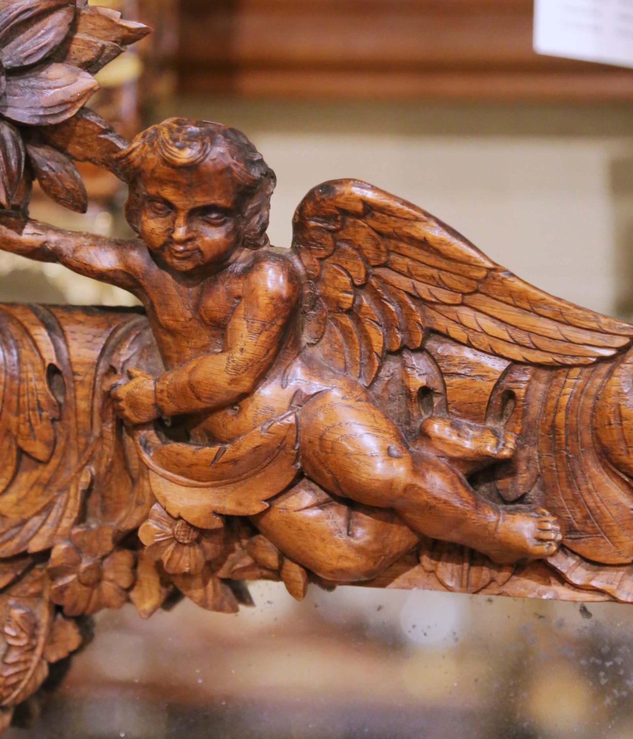 19th Century French Louis XV Carved Oak Wall Mirror with Cherub and Floral Decor