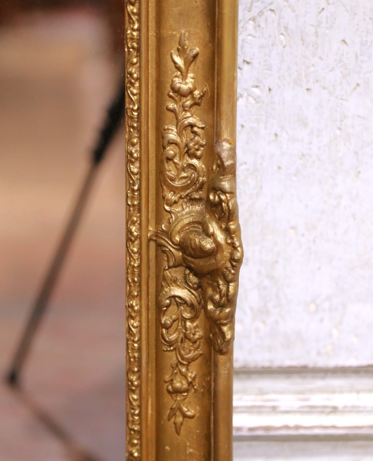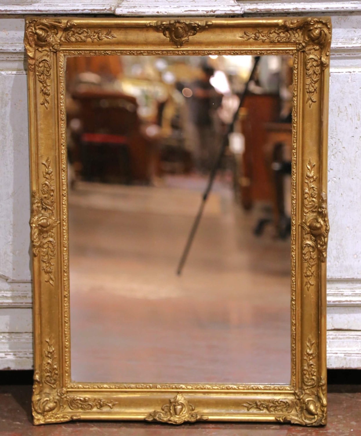 Elevate an entryway, dressing room, or hallway with this elegant antique giltwood mirror crafted in France circa 1880 and shaped in the Louis XV style. The rectangular frame features richly carved Rococo motifs inspired by the period, including scrolling acanthus leaves, floral sprays, and stylized cartouches placed at each corner and along the lower apron. The original gold leaf finish presents a warm, beautifully aged patina that highlights the depth and texture of the carving. The mirror plate is clear and bright with only minimal character marks appropriate to its period. The frame remains in excellent condition commensurate with age and use, offering both decorative impact and the graceful curves typical of Louis XV design. This versatile piece may be hung vertically or styled leaning against a wall for a relaxed yet refined presentation. Measures: 23″ wide, 2.5″ deep, 31.25″ high.