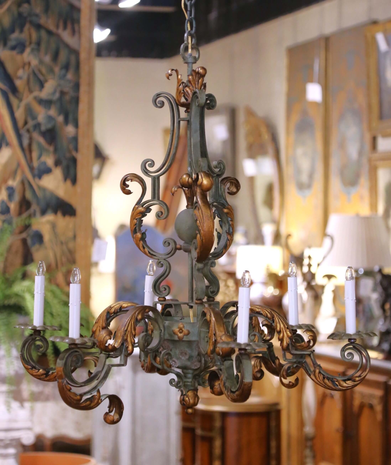 This elegant antique chandelier was crafted in France circa 1890 in the Louis XV style. Forged from hand-wrought iron, the six-light fixture features a verdigris painted finish richly contrasted with scrolling gilt acanthus leaves and foliate embellishments. The central stem is decorated with a round finial and Fleur-de-Lis flourishes, while the arms extend in graceful scrolls terminating in candle-form sockets. Further adorned with delicate glass rosettes around the basket-form body, the chandelier gains a subtle sparkle that enhances the depth of the verdigris patina. Newly wired to US standards, the six perimeter lights are fitted with candle-style sleeves, making it fully functional for contemporary use while retaining its Old World charm. Measuring 34 inches in diameter and 36 inches in height, this striking piece is the ideal size to suspend above a dining table, in a breakfast room, entryway, or even a bedroom. The chandelier is in excellent condition commensurate with age and use, with a warm, aged patina that underscores its antique character. Included: a canopy, loop and chain, each color-matched to the fixture.