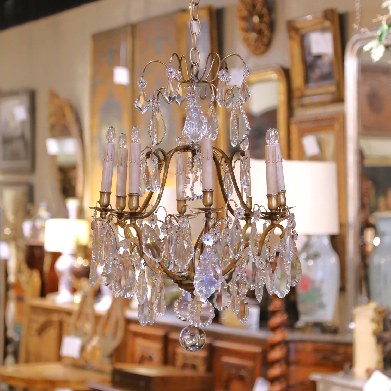 Add a touch of timeless elegance to your home with this refined antique chandelier. Crafted in France circa 1880, the fixture features an ornate bronze frame adorned with cascading cut-glass pendants, faceted prisms, and rosettes that beautifully refract the light. The chandelier’s eight curved arms support candle-style lights with realistic wax-form sleeves, enhancing its romantic Louis XV-inspired design. A central crystal baluster and a large faceted ball finial complete the piece with sophistication and sparkle. Newly wired to U.S. standards and ready for installation, this exquisite luminaire is in excellent condition with a rich, aged patina and original crystal clarity. Perfect for a dining room, entryway, or bedroom seeking authentic 19th-century French charm. Included: a canopy, loop, and chain, each color-matched to the fixture. Measures: 21″ diameter x 26″ height.