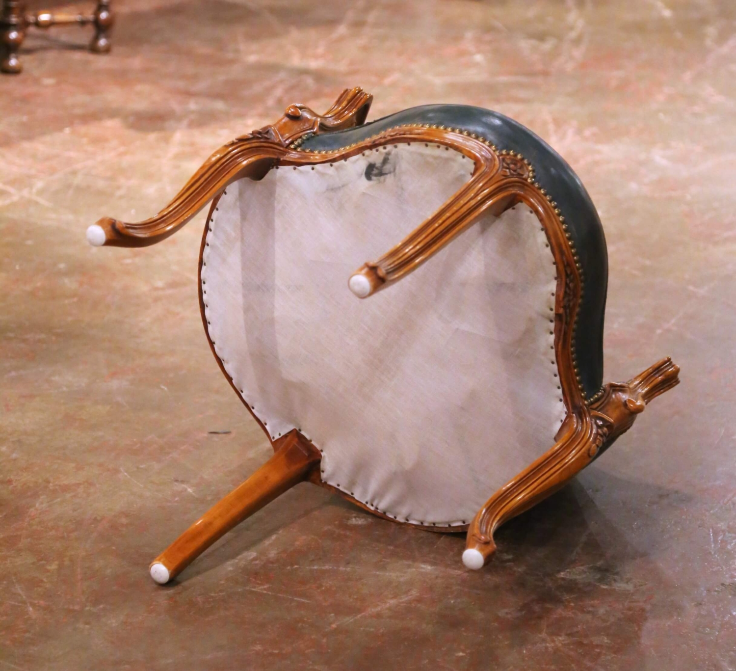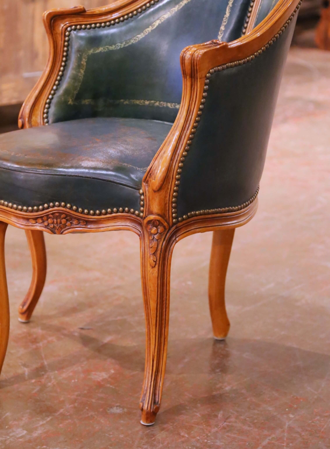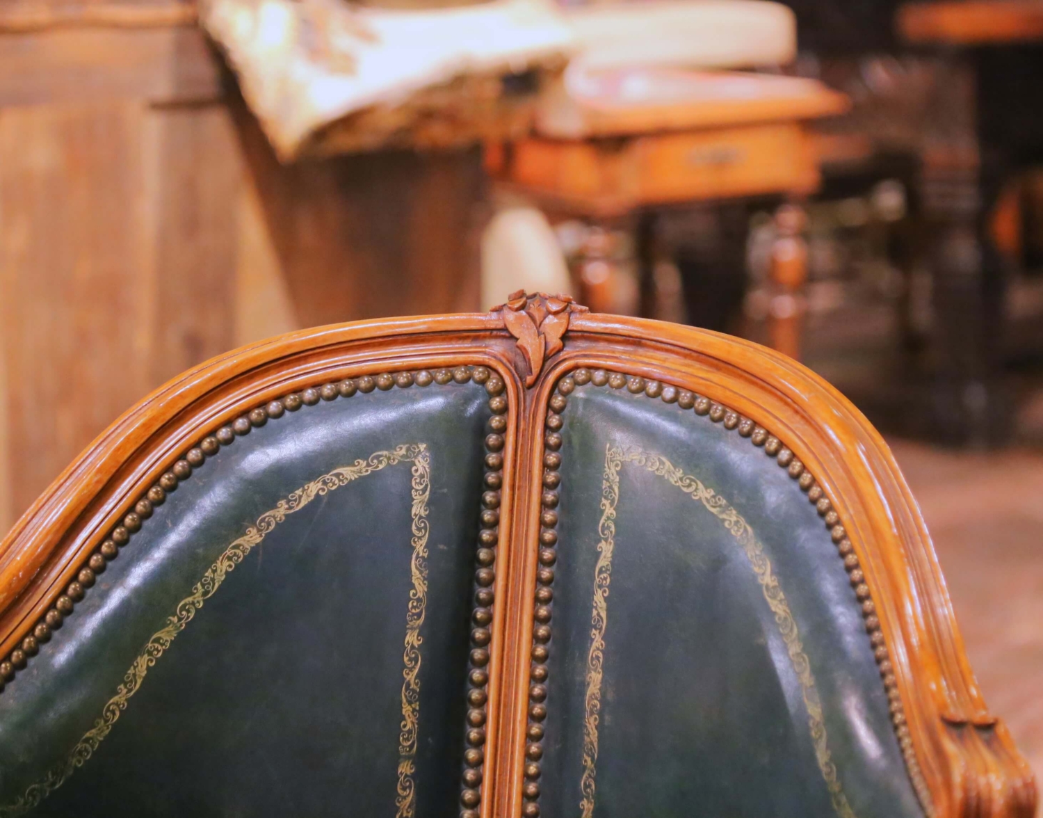 19th Century French Louis XV Walnut Desk Armchair with Green Tooled Leather