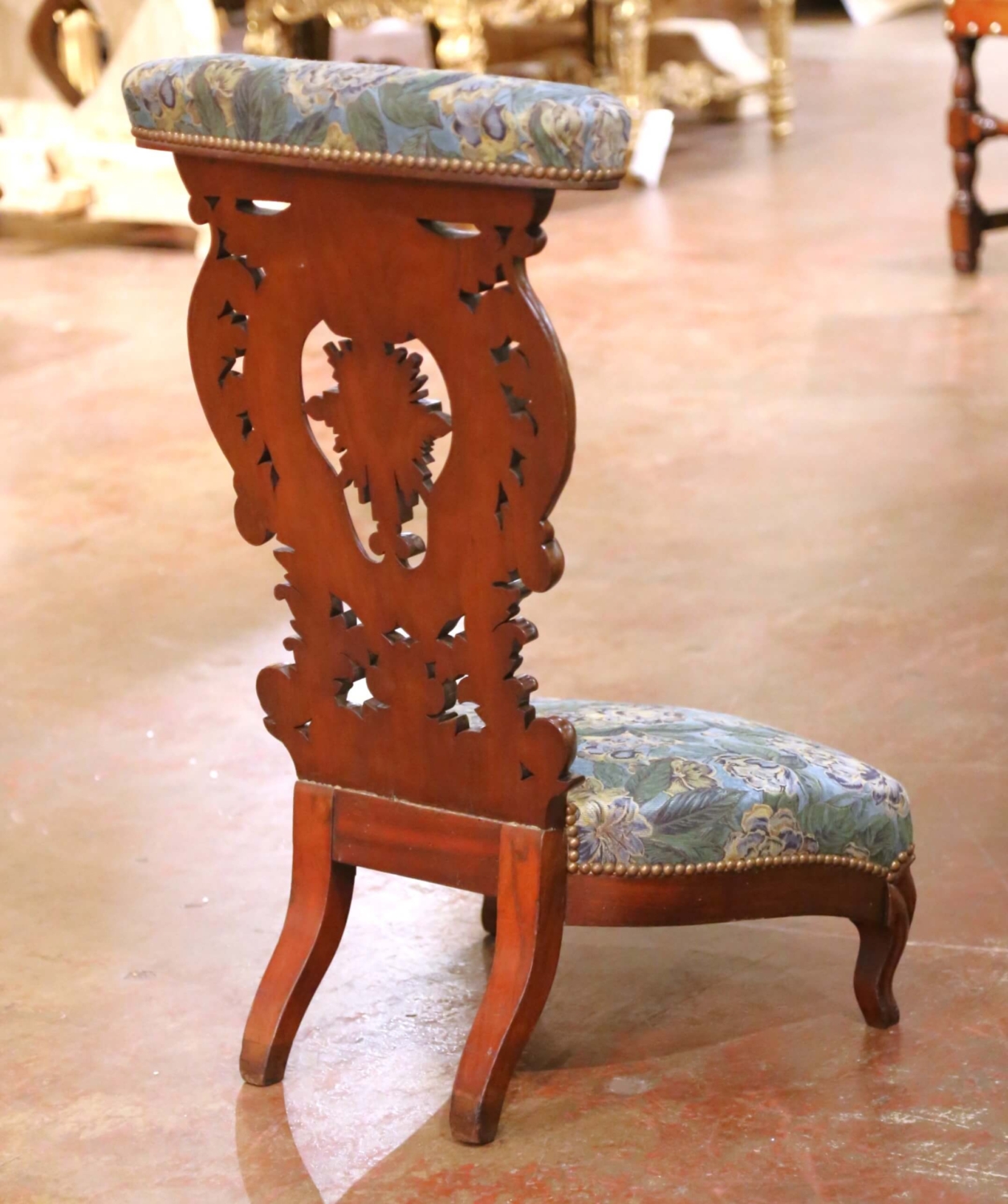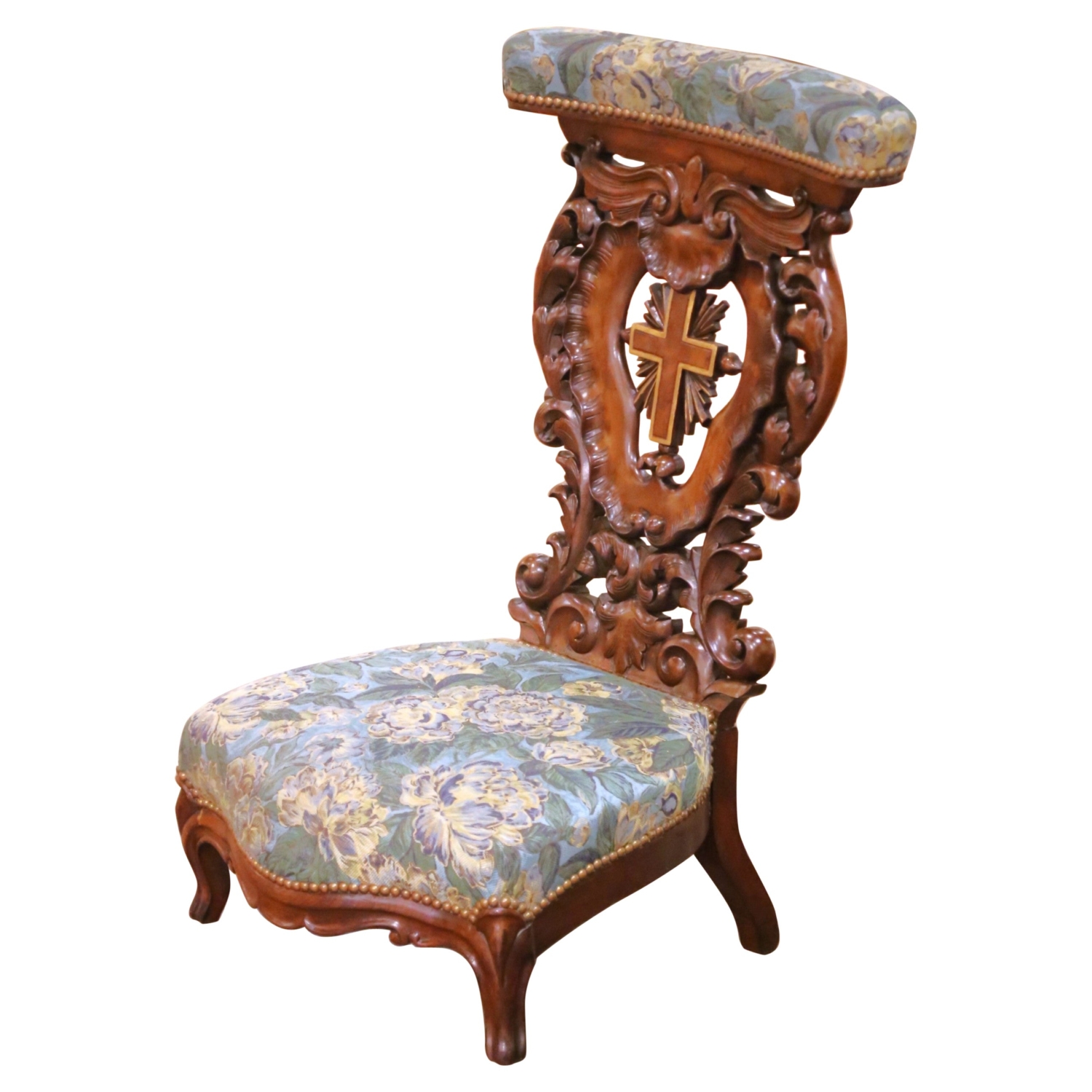Dress a bedroom, chapel corner, or private study with this refined devotional antique kneeler crafted in France circa 1870 and shaped in the graceful Louis XV taste. Fashioned from richly toned walnut, the prayer chair features an intricately carved back panel centered by a pierced cartouche framing a raised gilt-accented cross, surrounded by deeply sculpted acanthus scrolls and rocaille motifs that highlight the exceptional workmanship of the period. The seat and top rail are upholstered in later floral tapestry fabric secured with decorative brass nailhead trim, complementing the serpentine apron and cabriole-style legs. The walnut frame displays a warm, well-preserved patina that enhances the crisp, expressive carvings and lends the piece its enduring devotional charm. In very good condition consistent with age and gentle use, this ecclesiastical furnishing would make an evocative addition to a quiet reading nook, meditation space, or personal altar. Measures: 34″ H x 20″ W x 21″ D.