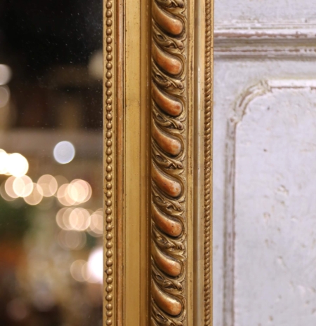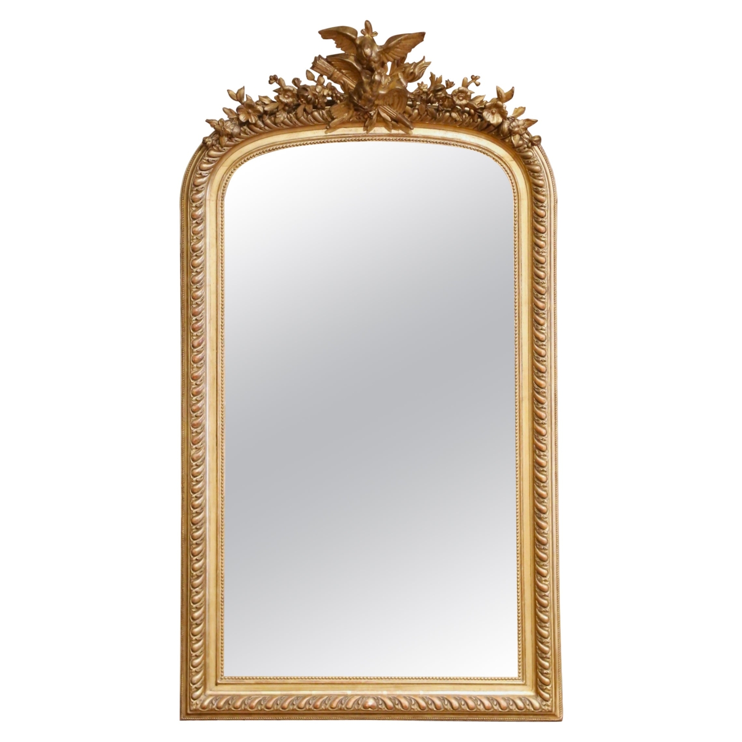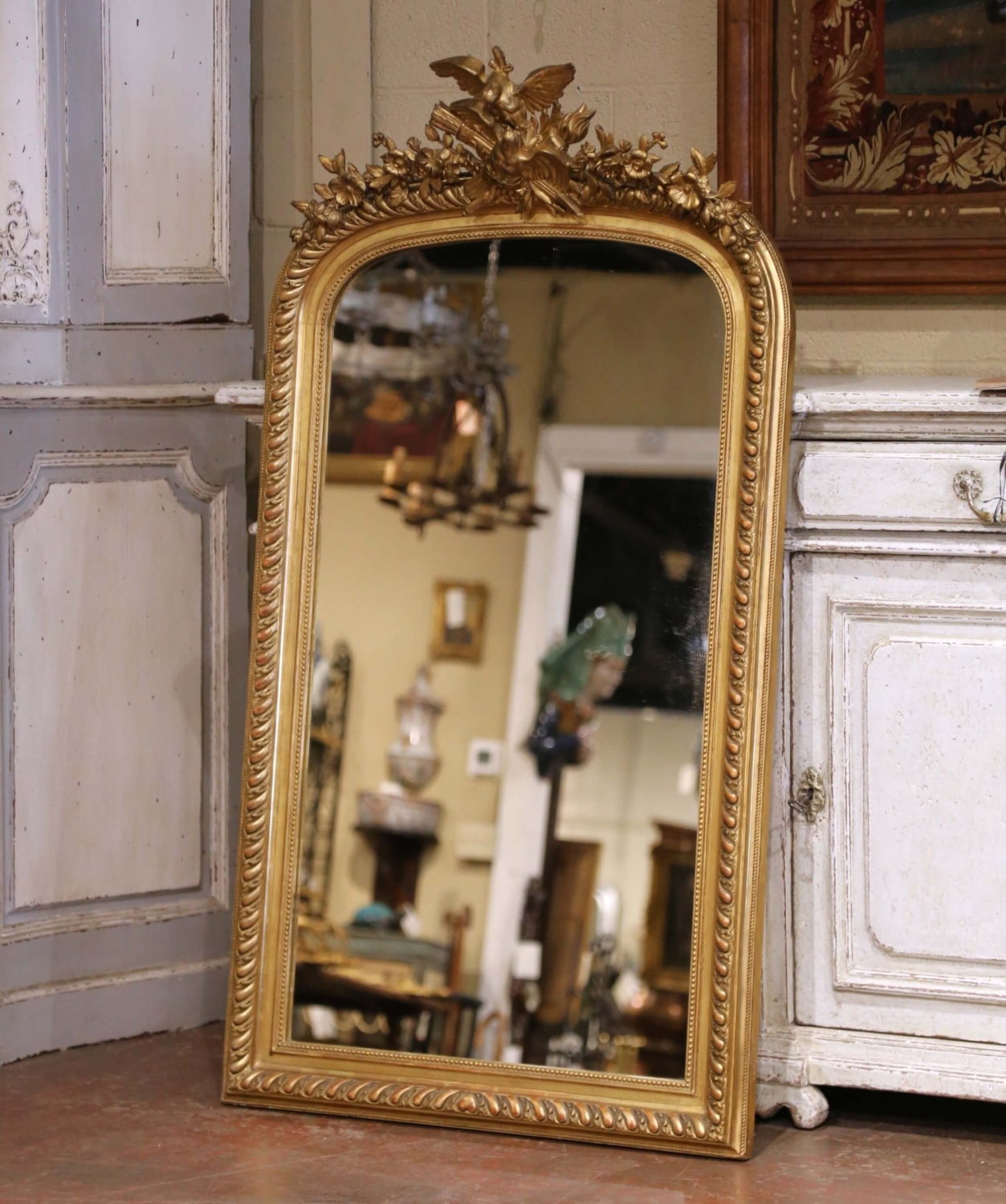 Bring warmth and romance to any space with this exquisite French giltwood wall mirror. Crafted in France circa 1870, the antique piece features a gracefully arched frame, hand-carved with twisted ribbon moldings and a delicate beaded inner trim. The richly detailed crest showcases a pair of lovebirds nestled among flowering branches and wheat sheaves, a charming symbol of abundance and harmony, all highlighted by a beautifully aged gold leaf patina. Standing nearly five feet tall, this generously scaled mirror is ideal for placing over a mantel, in an entryway, or as a dramatic focal point in a powder room or bedroom. The original wood-paneled back and antique mercury glass add authenticity and depth, with gentle signs of age that enhance its storied character. This Louis XVI-style mirror is in excellent condition commensurate with age and use and adorns a rich gilt finish. Measures: 31.5″ W x 58″ H