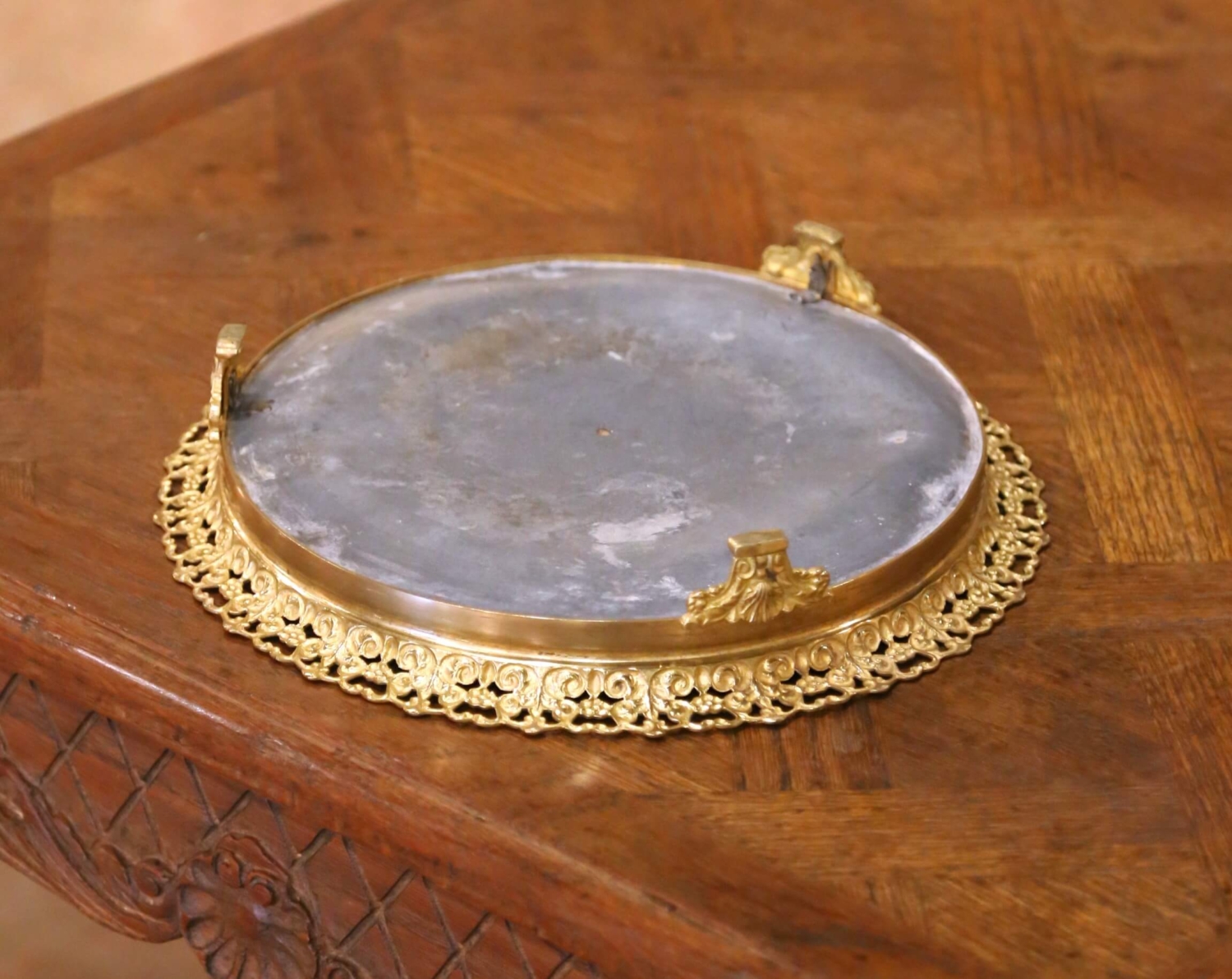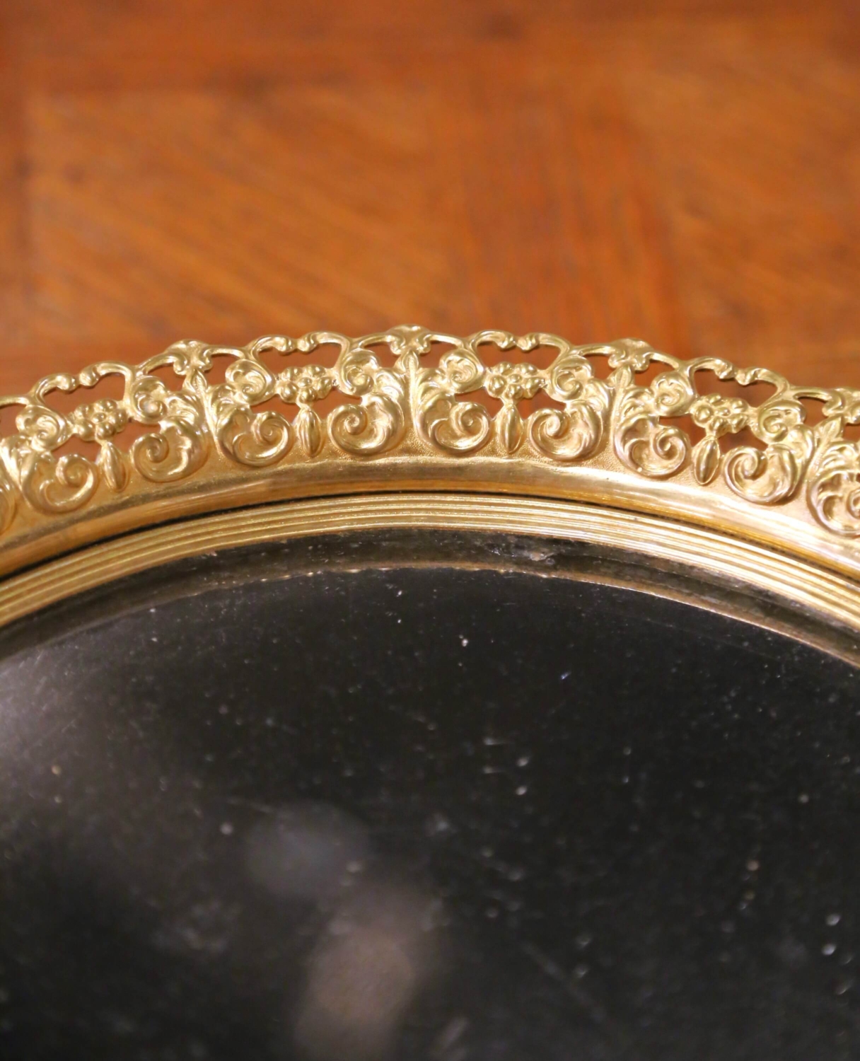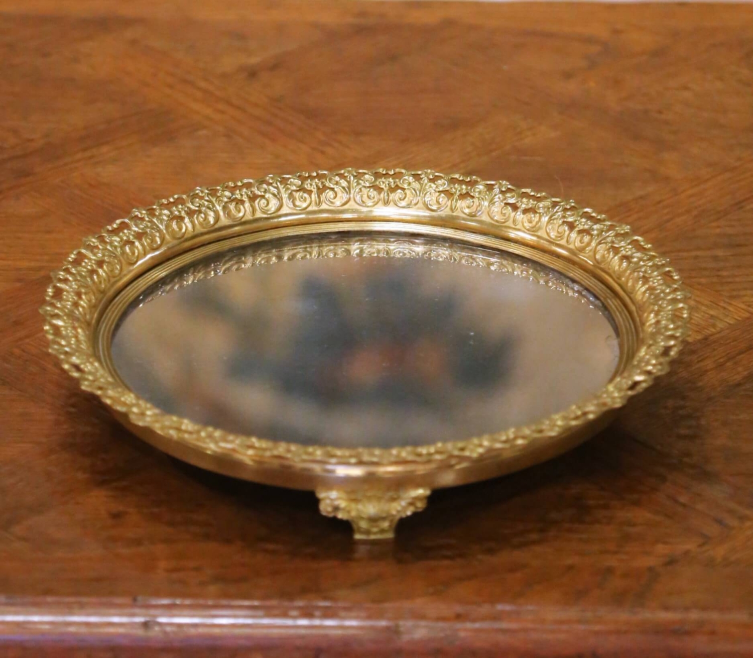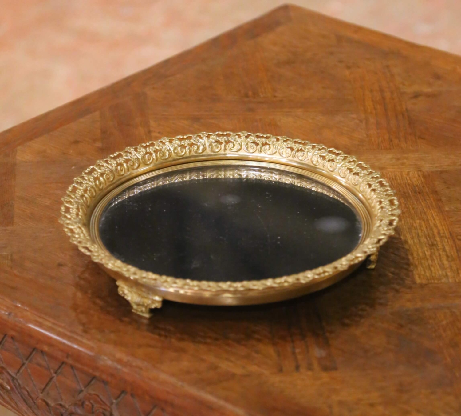 Elevate a vanity, console, or dining table with this refined French mirrored plateau crafted circa 1880. Designed in the Louis XVI style, the piece features a beautifully cast bronze gallery with delicate openwork scrolling foliage and floral motifs, creating an elegant neoclassical frame around the mercury glass mirror. Resting on three finely modeled bronze feet shaped as stylized acanthus brackets, the plateau has a light, elevated presence that enhances any object displayed upon it. The mercury glass surface shows gentle age and soft mottling consistent with its 19th-century origin, adding depth, shimmer, and authentic antique character. Perfect for presenting candlesticks, perfume bottles, or a “surtout de table” or centerpiece arrangement, this sophisticated plateau brings timeless French refinement to any interior. Some scratches on the glass. See detailed images. Dimensions: 11.75″ diameter x 2.25″ H.