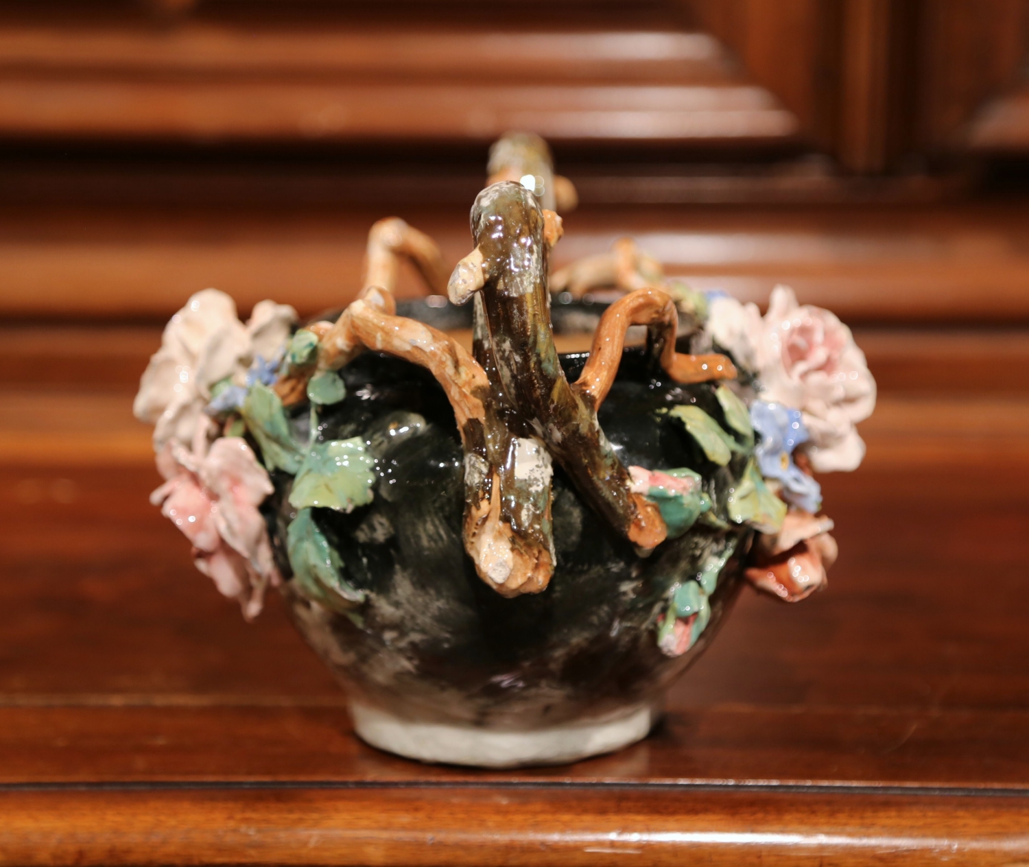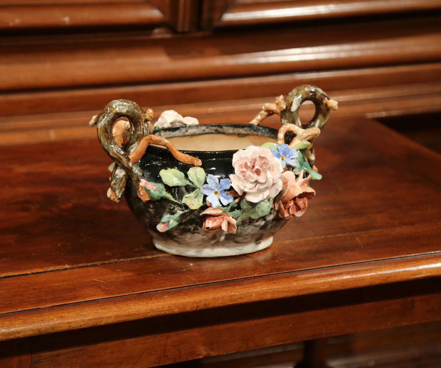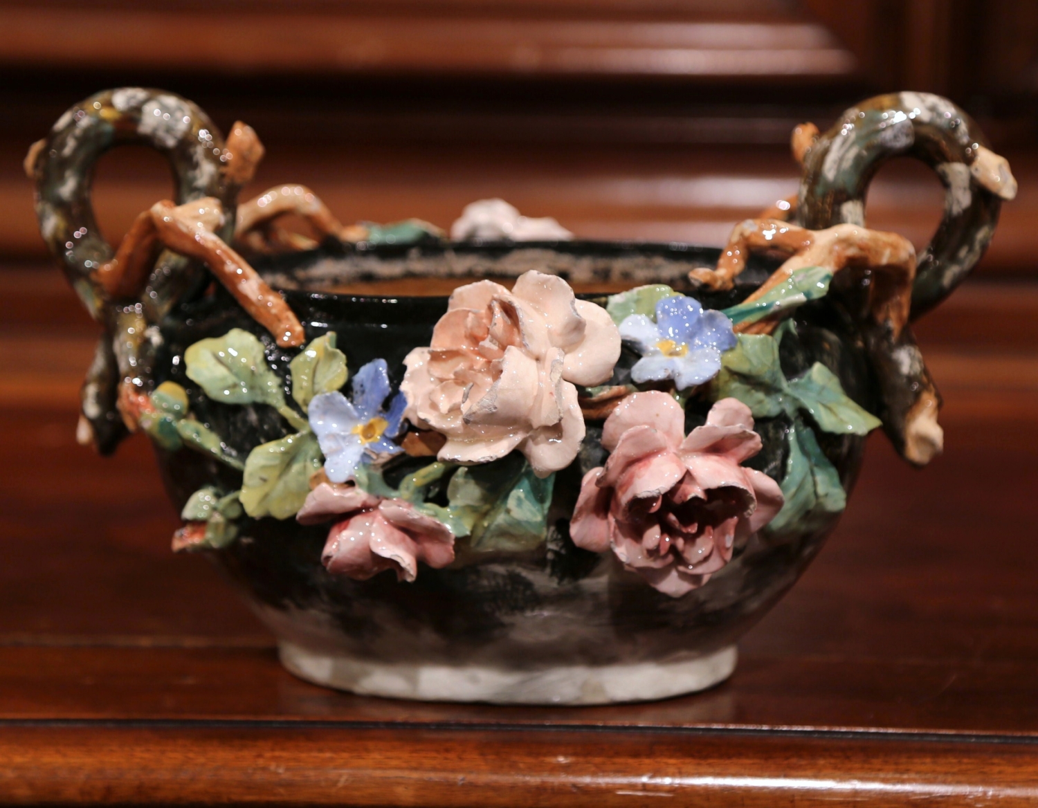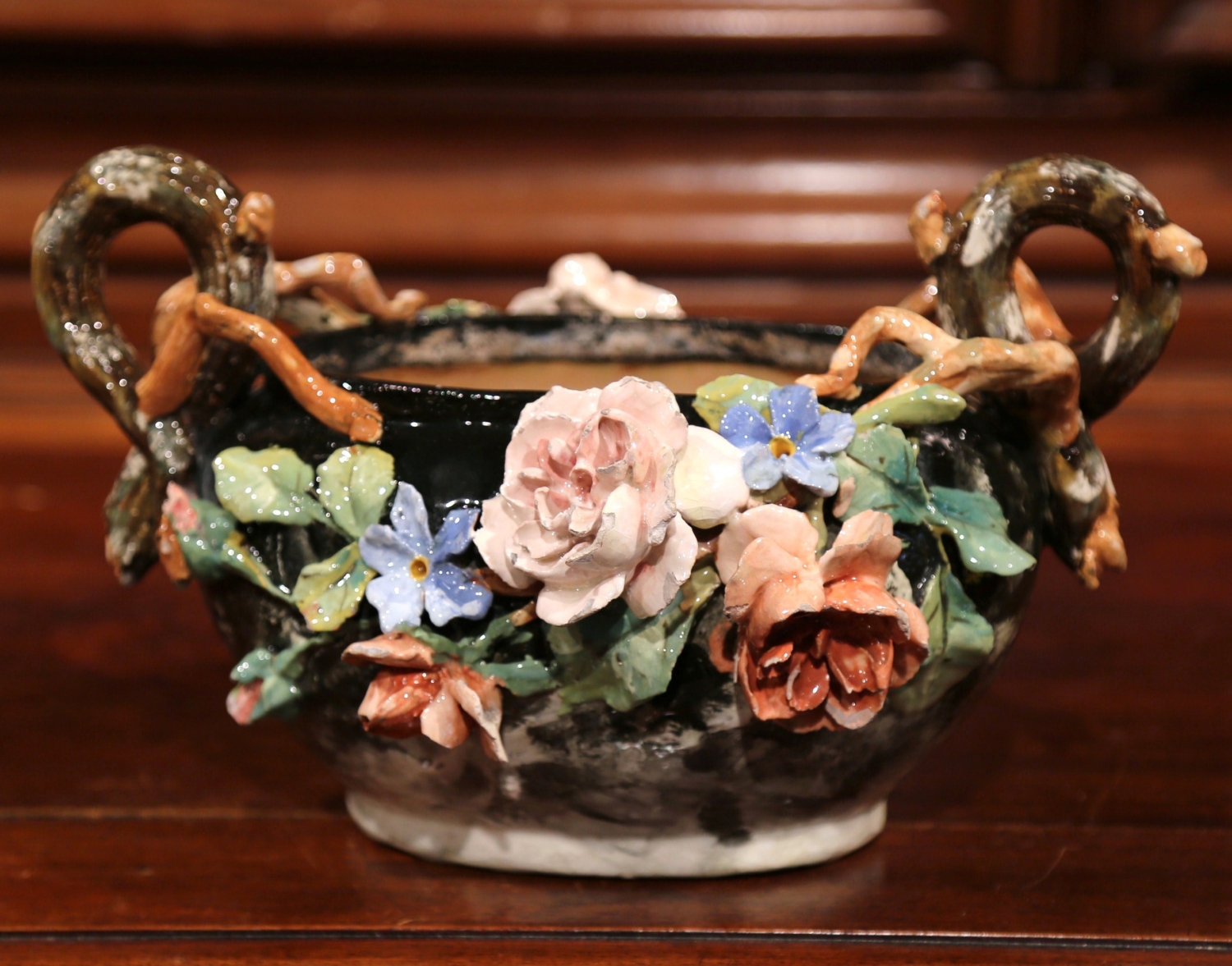 This elegant colorful hand painted Majolica planter was sculpted in Montigny sur Loing, France, circa 1860. The ceramic jardinière with root shape handles features high relief soft pink, blue and beige rose flowers with pale green leaves, and brown and grey background. The ceramic vase is in good condition commensurate with age and use (minor chips on few petals). Impressionist ceramics term generally applies to “paint the slip” or “batch gouache”. At the turn of the nineteenth and twentieth centuries, the towns of Montigny-sur-Loing and Marlotte are many artists living places like Jean-Baptiste Corot, Eugène Thirion (1839-1910), Adrien Schulz (1851-1931), Numa Gillet (1868-1940) and Lucien Cahen-Michel (1888-1980), all attracted by the quality of the landscape and the light. When Eugene Schopin founded in 1872 a ceramics factory, he worked with the painters to create a range of designs inspired by Impressionism and decorated according to new public demands. Several ceramic factories will develop around this Impressionist movement. The most famous, such as Georges Delvaux (1834-1909), Albert Boué (1862-1918) and Charles Alphonse Petit (1862-1927), will produce until 1922. Other manufacturers, such as Theodore Lefront Fontainebleau, collaborate with artists and ceramists Montigny. Measures: 12.5″ W x 10″ D x 7.5″ H.