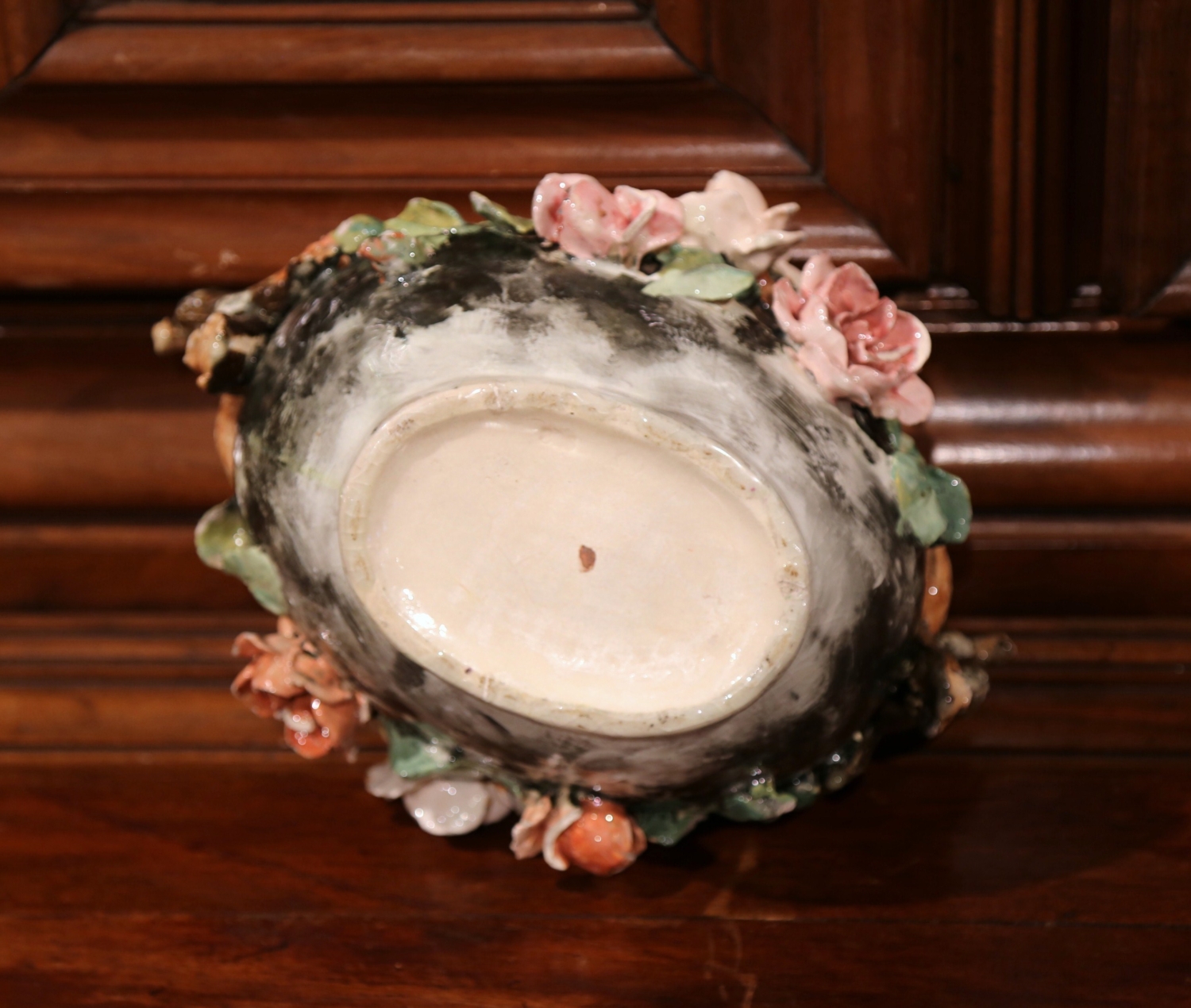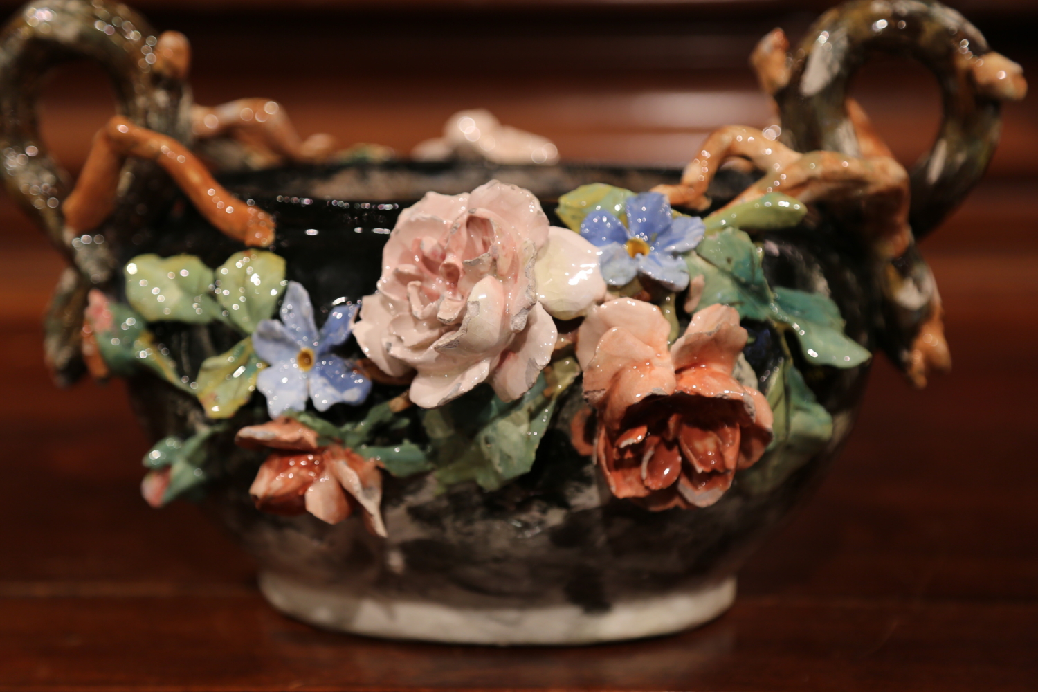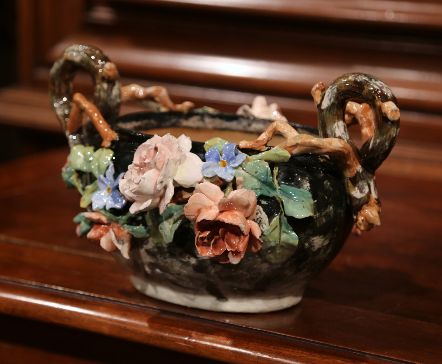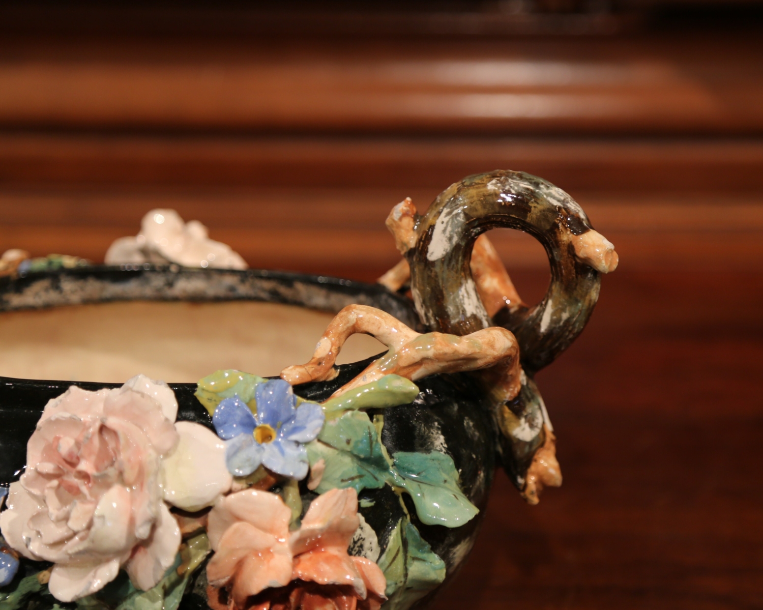 This elegant colorful hand painted Majolica planter was sculpted in Montigny sur Loing, France, circa 1860. The ceramic jardinière with root shape handles features high relief soft pink, blue and beige rose flowers with pale green leaves, and brown and grey background. The ceramic vase is in good condition commensurate with age and use (minor chips on few petals). Impressionist ceramics term generally applies to “paint the slip” or “batch gouache”. At the turn of the nineteenth and twentieth centuries, the towns of Montigny-sur-Loing and Marlotte are many artists living places like Jean-Baptiste Corot, Eugène Thirion (1839-1910), Adrien Schulz (1851-1931), Numa Gillet (1868-1940) and Lucien Cahen-Michel (1888-1980), all attracted by the quality of the landscape and the light. When Eugene Schopin founded in 1872 a ceramics factory, he worked with the painters to create a range of designs inspired by Impressionism and decorated according to new public demands. Several ceramic factories will develop around this Impressionist movement. The most famous, such as Georges Delvaux (1834-1909), Albert Boué (1862-1918) and Charles Alphonse Petit (1862-1927), will produce until 1922. Other manufacturers, such as Theodore Lefront Fontainebleau, collaborate with artists and ceramists Montigny. Measures: 12.5″ W x 10″ D x 7.5″ H.