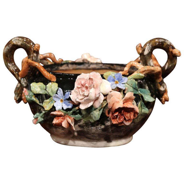 19th Century French Painted Ceramic Barbotine Jardinière with Floral Decor