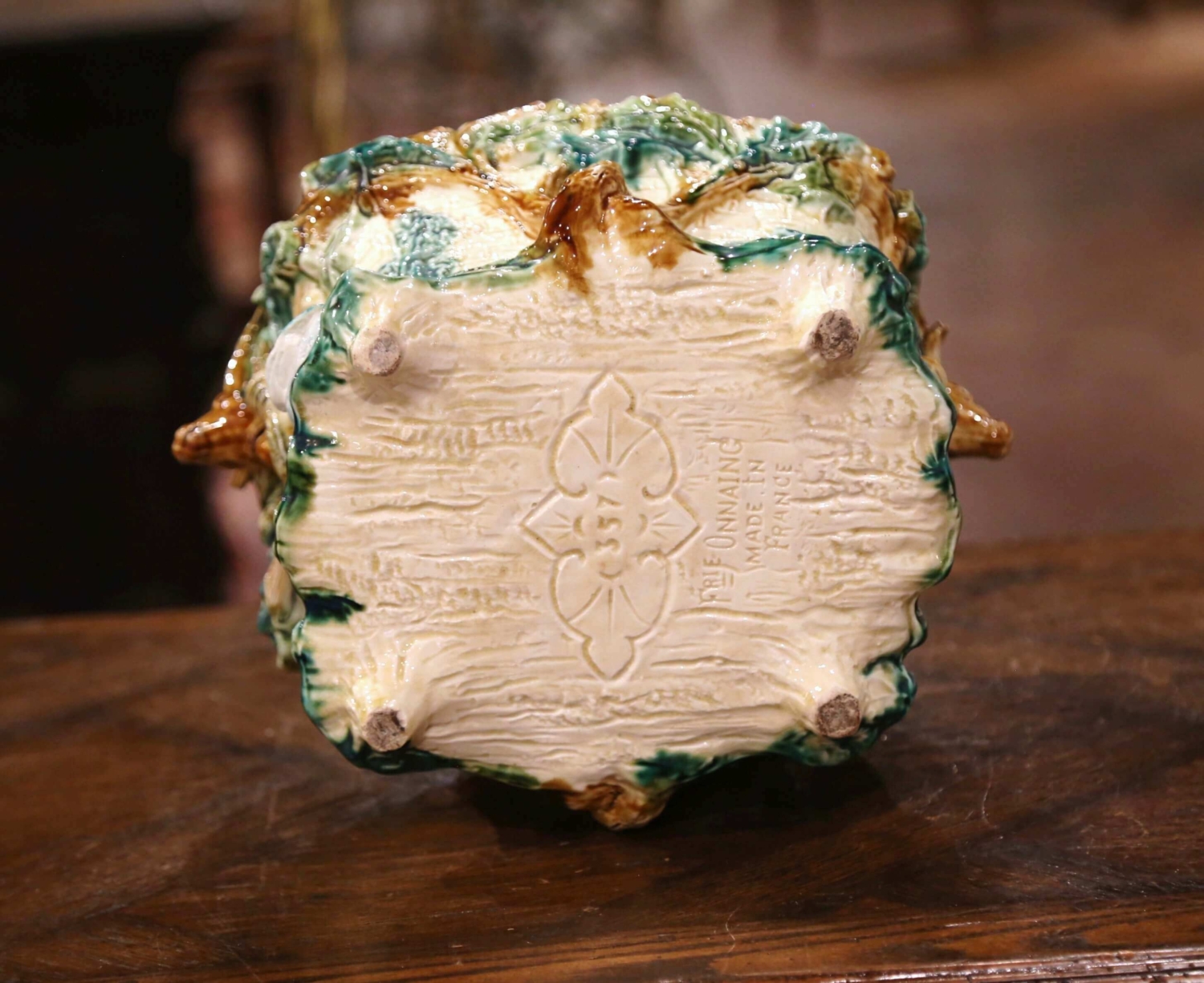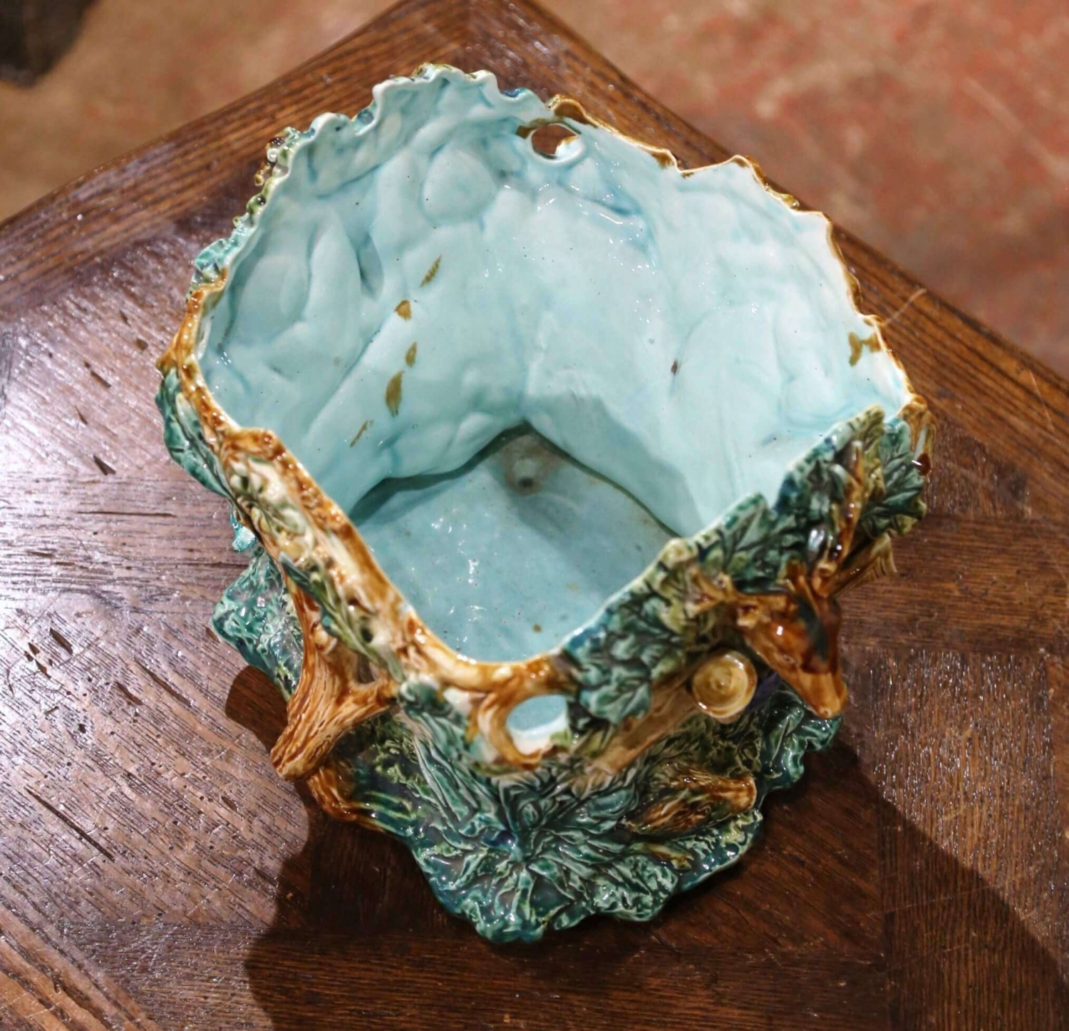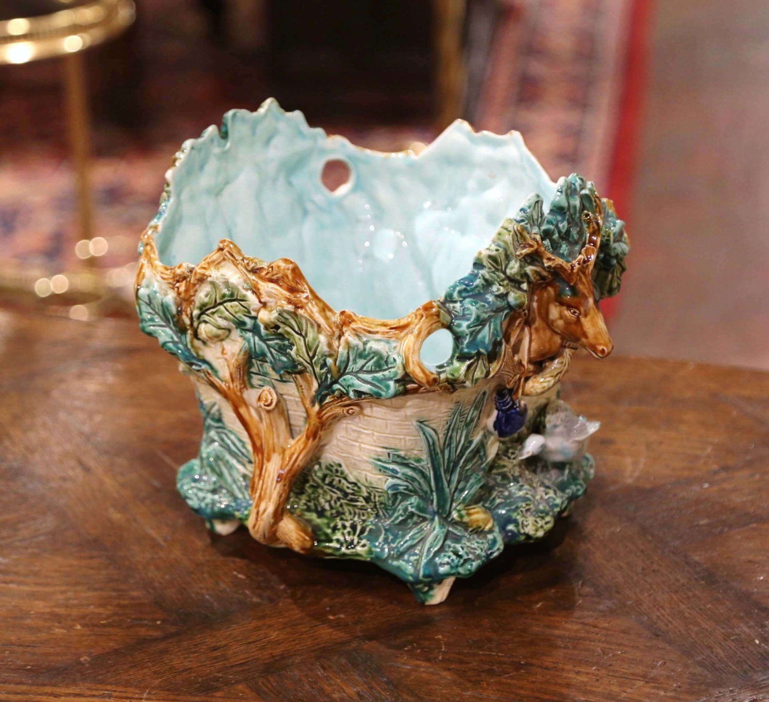 This colorful barbotine jardinière from L’Hermine a Orchies, France, was sculpted circa 1880. Almost square in shape, the antique porcelain cache pot features exquisitely rendered hunting motifs on all four sides, including deer, goose, wild boar, guns, horns, acorns and tree branches. The colorful planter is in excellent condition, and adorns rich colors in a green, light brown and beige palette. A great addition to a lodge, ranch or hunting resort. Featured in the book “Les Barbotines” by Pierre Faveton page 74 (see pictures). Measures: 13″ W x 11″ D x 10″ H