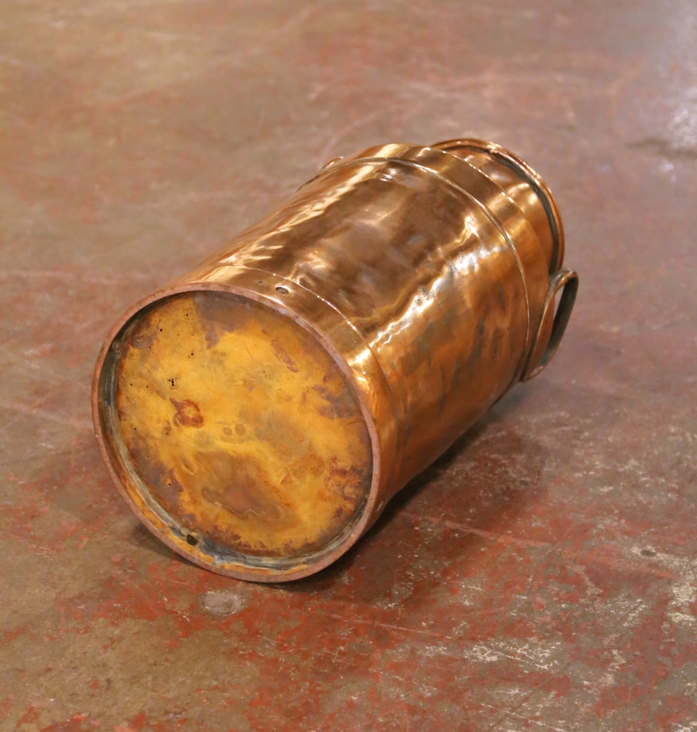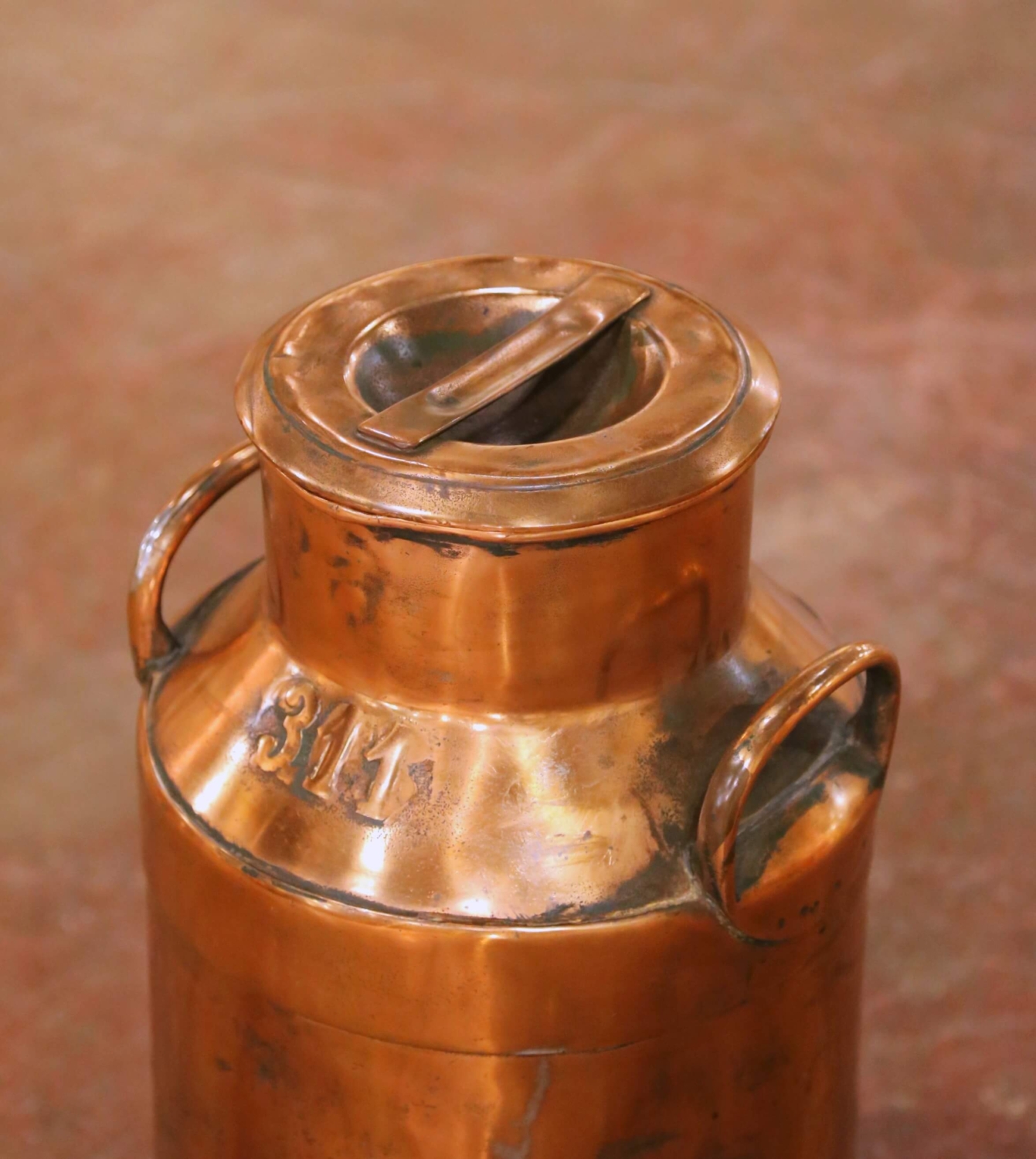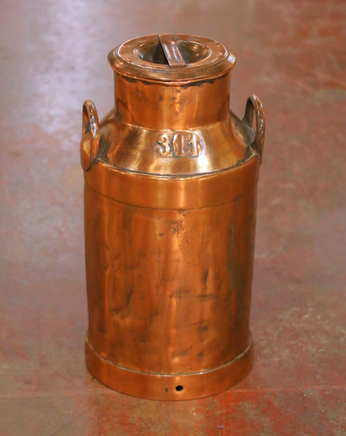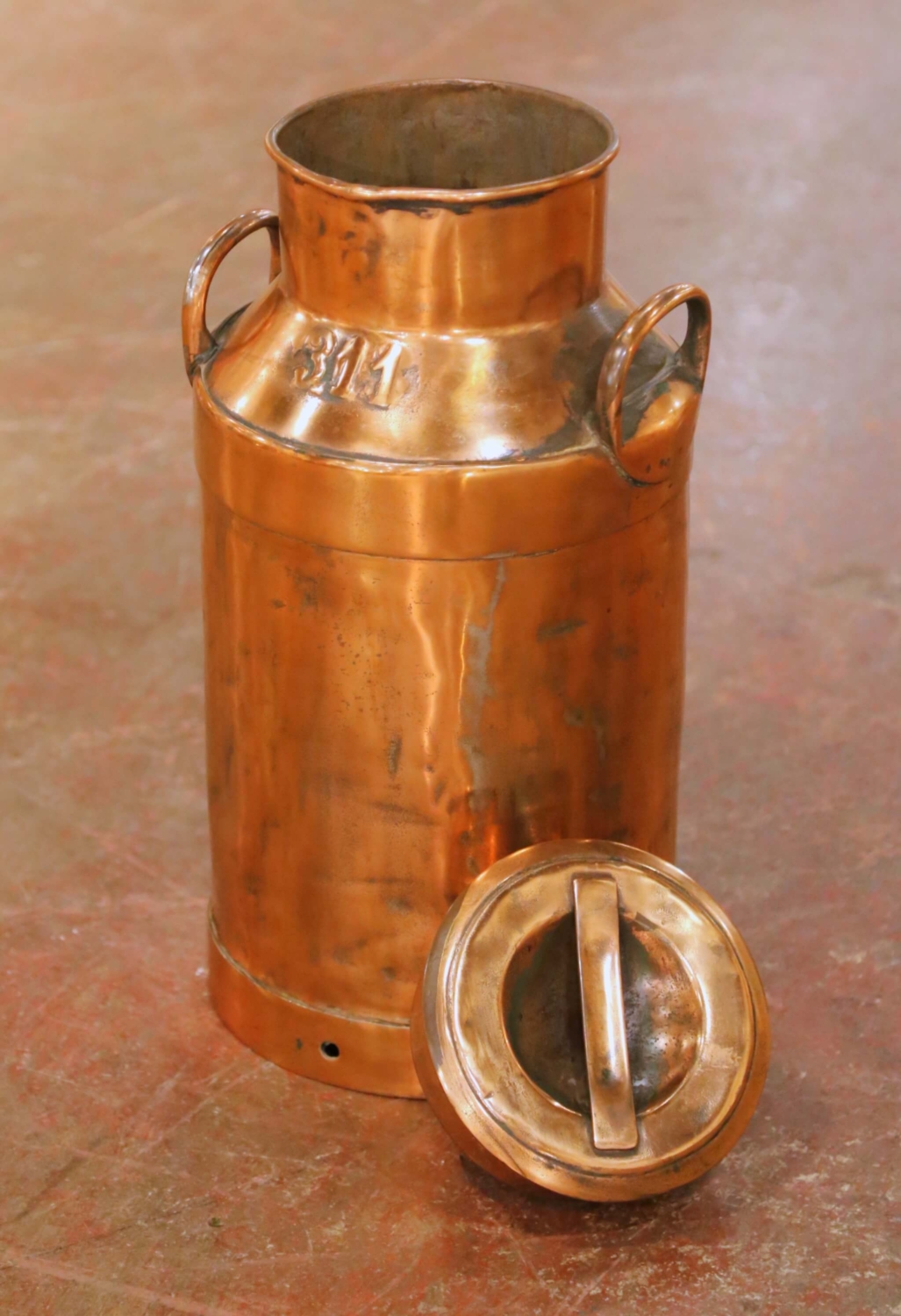 This substantial antique copper milk can was crafted in France circa 1890. Executed in traditional cylindrical dairy form, the vessel features a gently tapered shoulder rising to a rolled rim and fitted with two robust side handles for carrying. The shoulder is stamped “311,” likely a dairy identification number, reinforcing its authentic agricultural origin. Handcrafted in heavy gauge copper, the surface reveals visible seams and subtle hammering marks that speak to its original utilitarian construction. The can retains its removable lid with integrated handle, designed for secure closure and easy access. Small perforations around the lower band further suggest its practical use in traditional milk storage or cream handling. The exterior displays a beautifully aged copper surface with warm tonal variation, darker oxidation, and handling marks consistent with age and use, all contributing to its honest antique character. The interior shows expected oxidation from decades of service. Solid and well-proportioned, this French antique dairy can makes a striking decorative accent in a farmhouse kitchen, wine cellar, garden room, or use as an umbrella stand. Dimensions: 11.25”Dia x 21.5”H