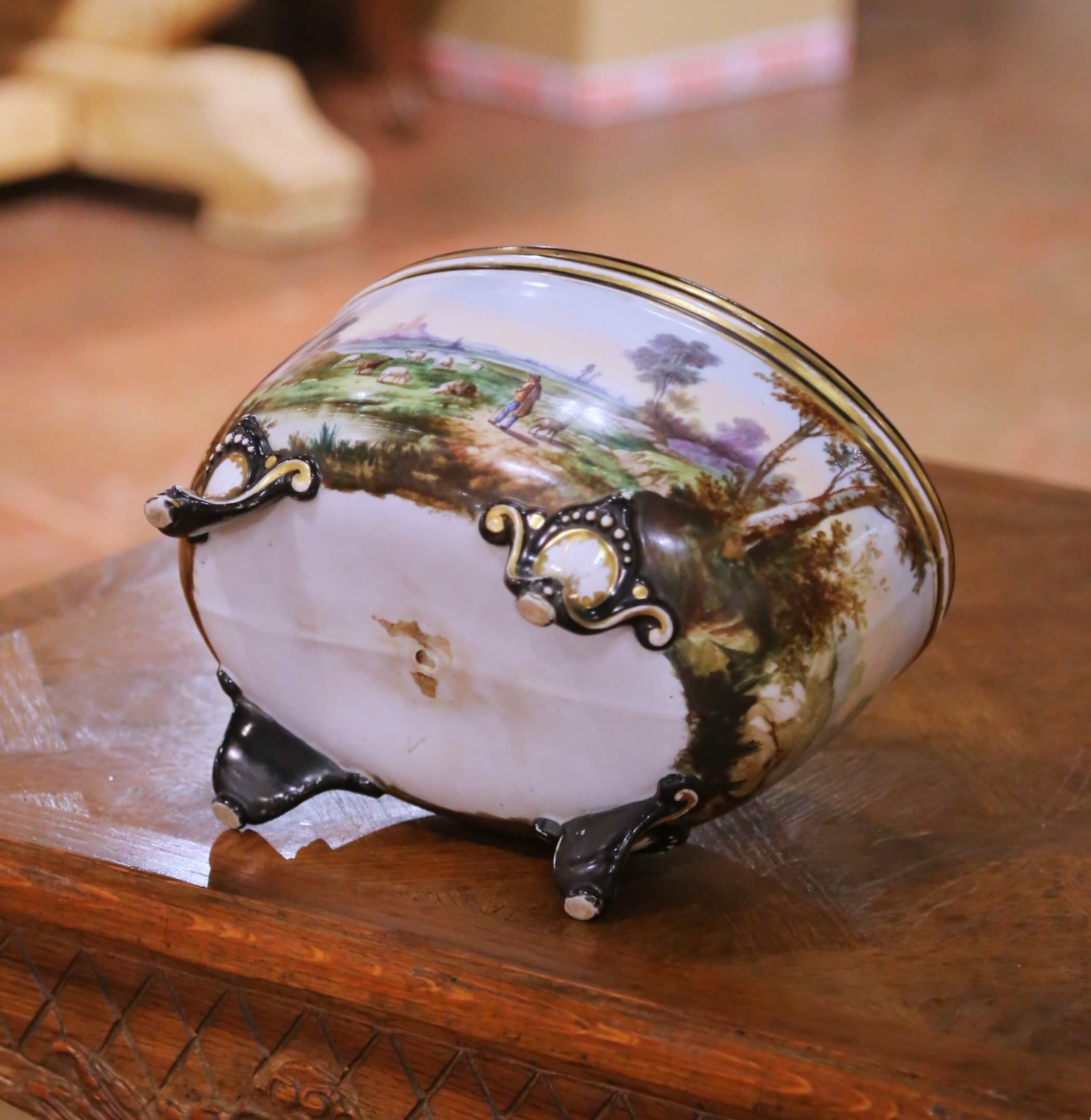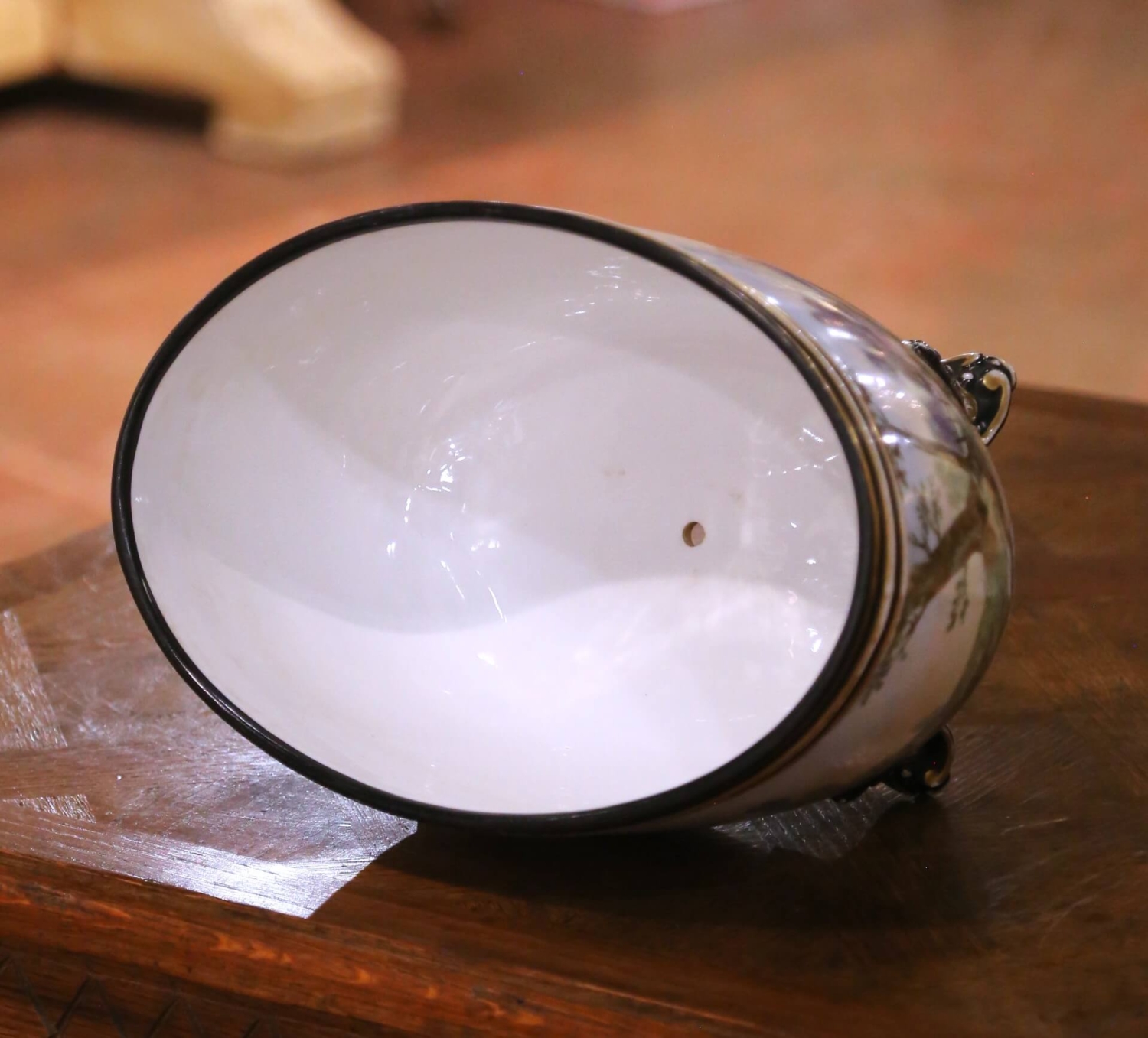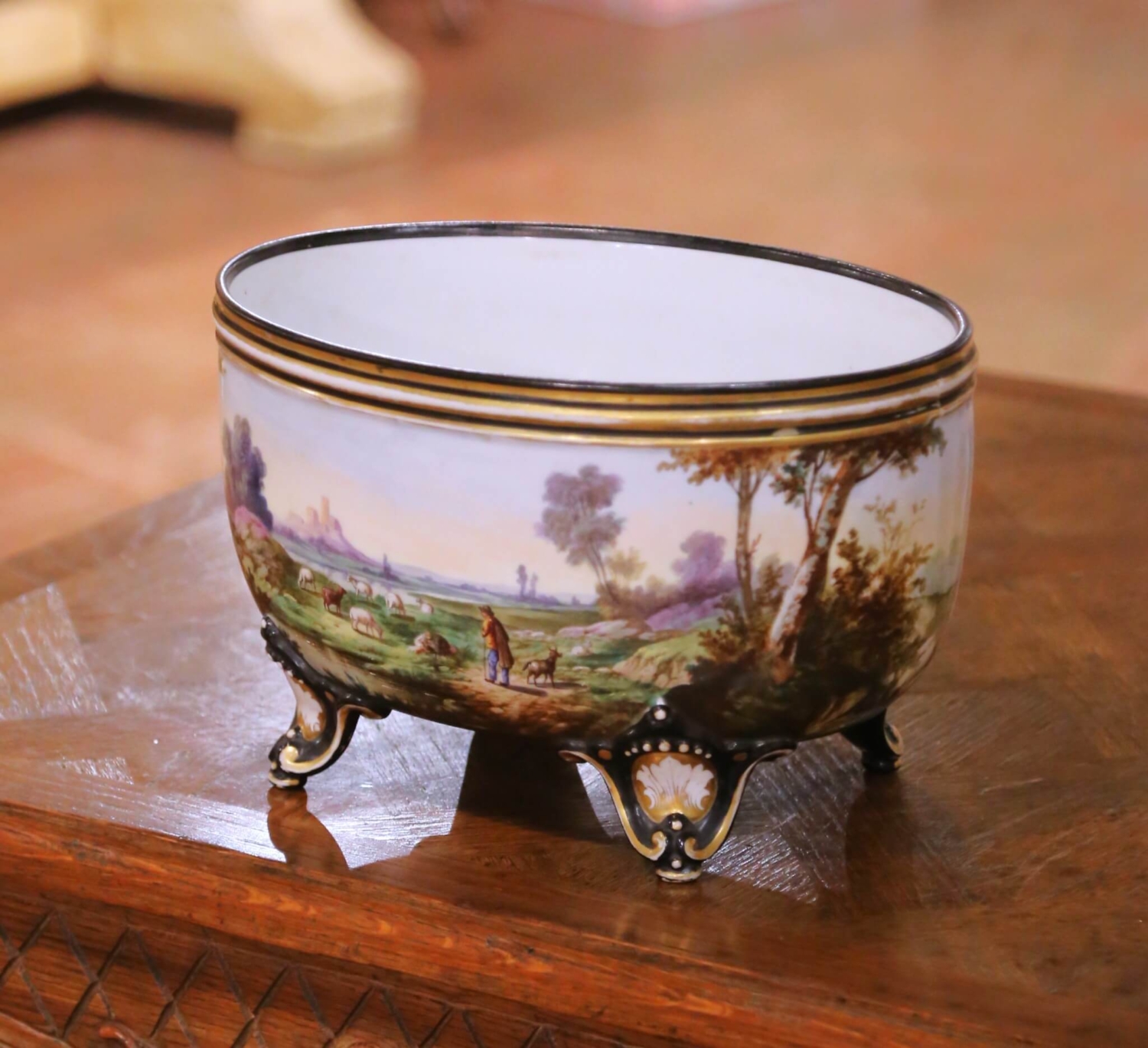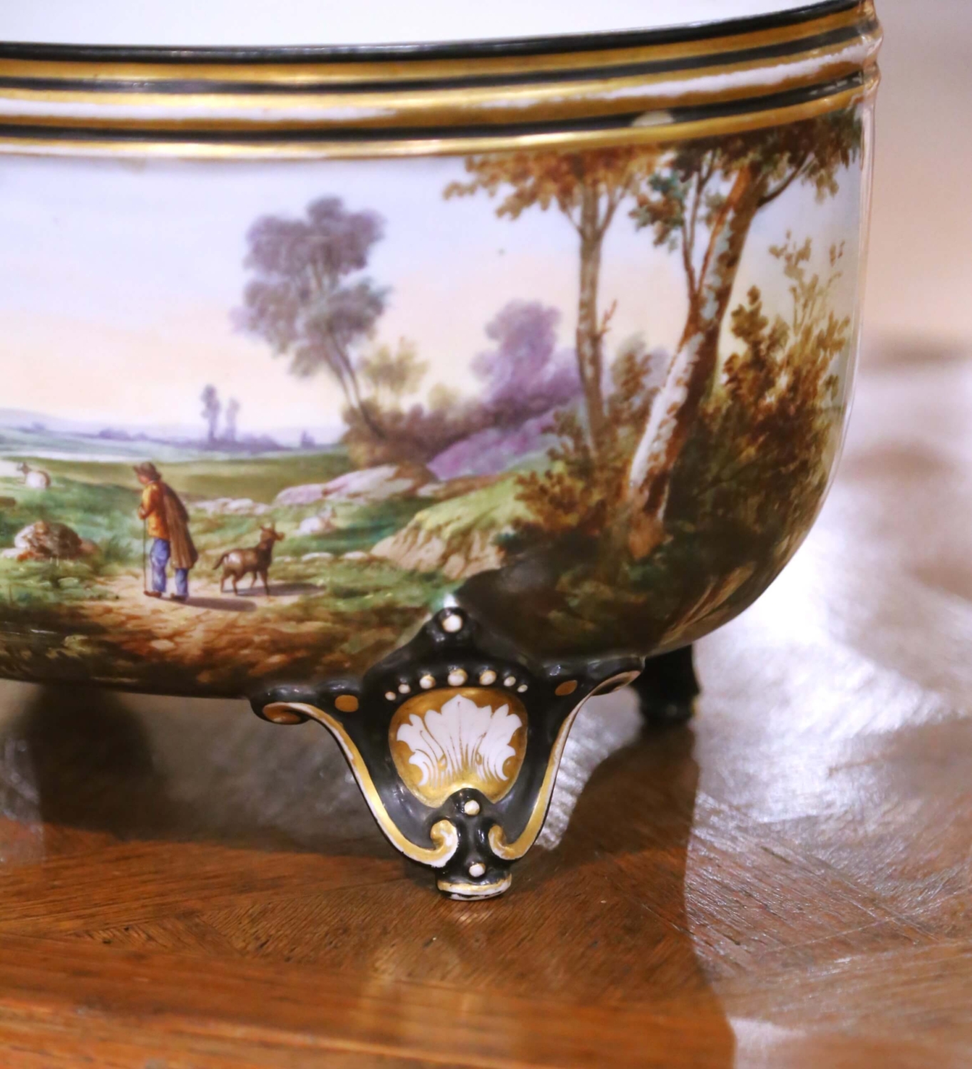 This elegant antique French jardinière, crafted in the Porcelaine de Paris tradition and dating to the late 19th century, circa 1890, reflects the decorative sophistication and painterly artistry for which Paris workshops were renowned. Oval in form and raised on four sculptural feet, the vessel is richly hand painted with a continuous pastoral landscape depicting a shepherd guiding his flock through rolling countryside, accented by trees, distant architecture, and softly shaded skies rendered in delicate, nuanced tones. The interior is finished in a clean white glazed surface, ideal for use as a planter or decorative cachepot. The exterior is further enhanced with fine gilt banding along the rim and rests on ornate feet highlighted with black enamel, gilt scrollwork, and shell motifs, all characteristic of Paris decorative production of the period. The painted decoration retains excellent color and detail, while the gilding shows gentle, honest wear consistent with age. This antique jardinière is in excellent condition commensurate with age and use and remains a highly decorative and visually engaging example of late 19th century French craftsmanship. Perfect as a centerpiece on a console, commode, or dining table, this Porcelaine de Paris jardinière brings timeless French elegance and pastoral charm to both traditional and refined contemporary interiors. Dimensions: 12″W x 8″D x 7″H.