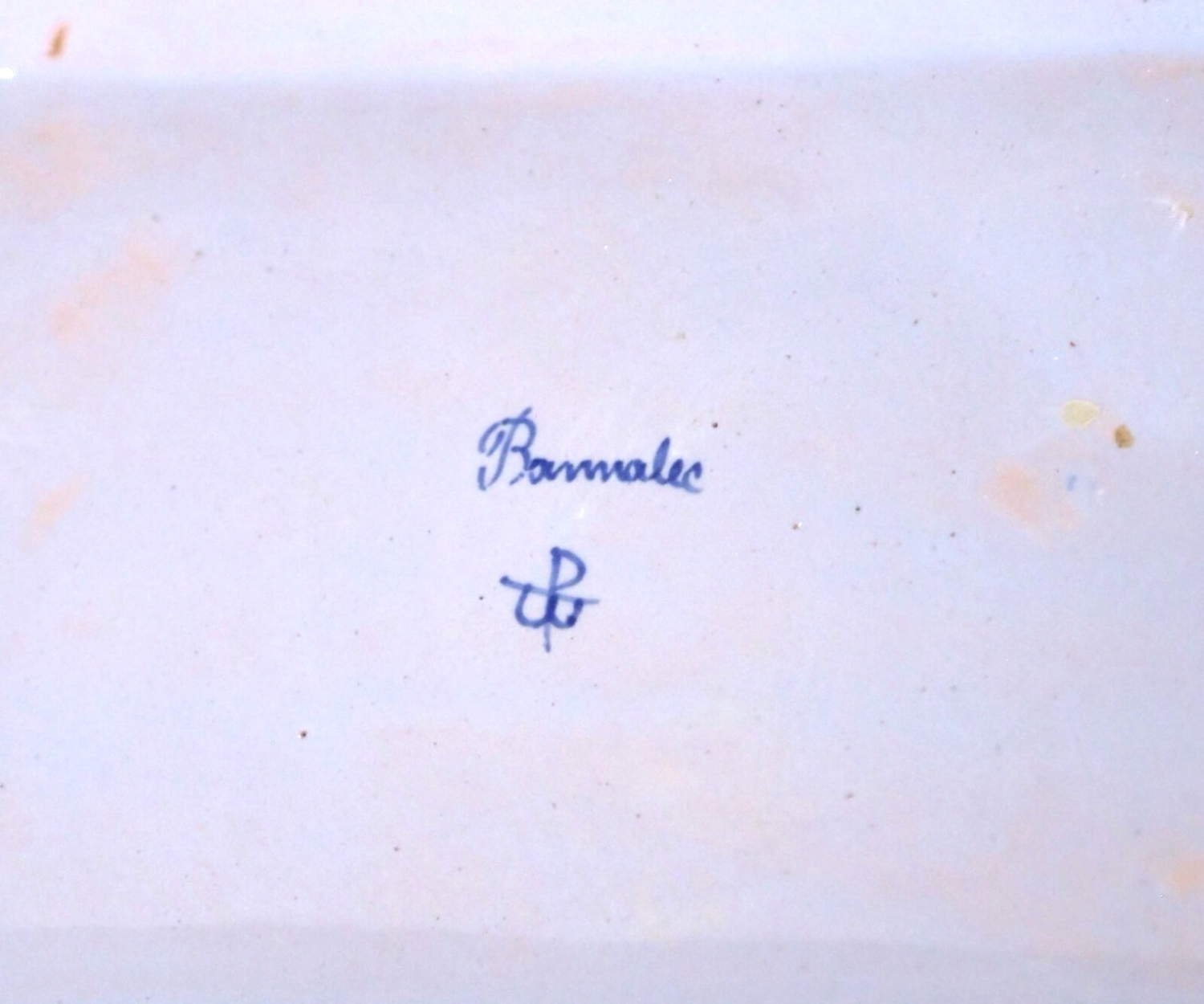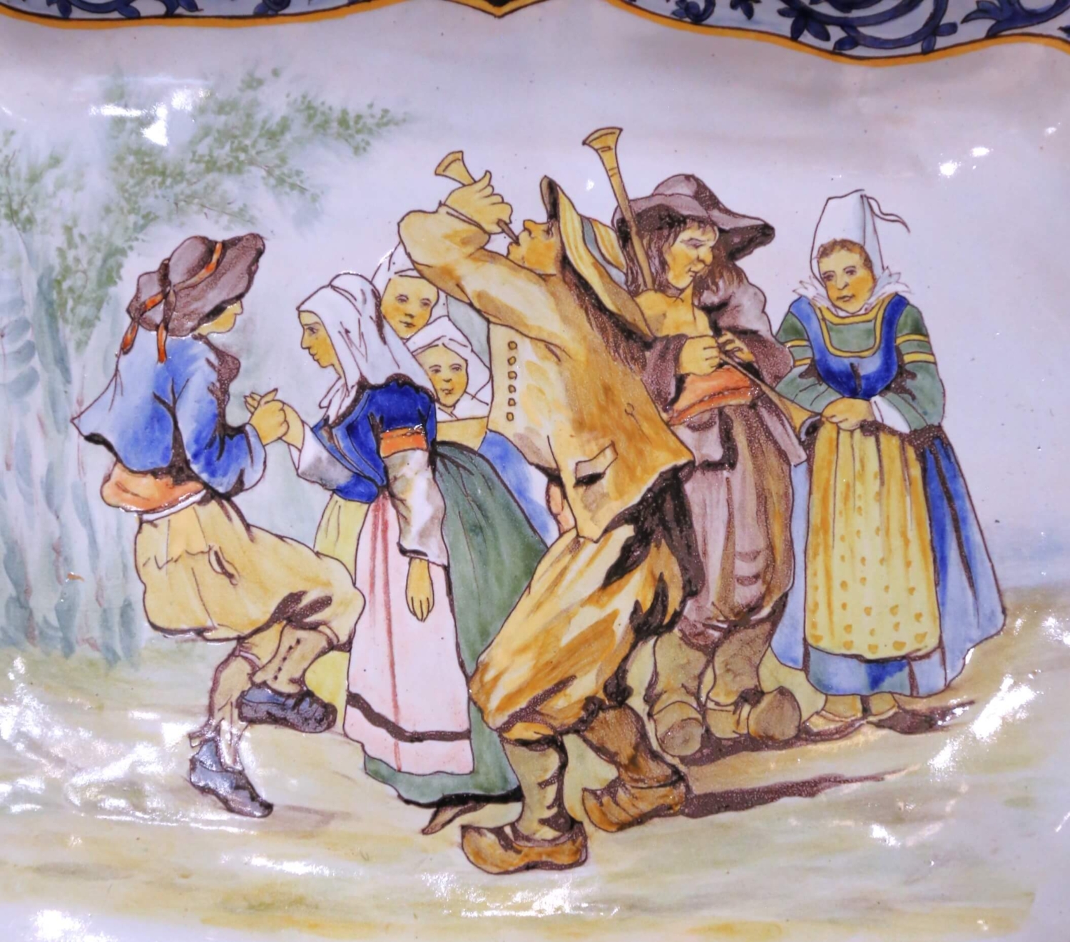 Dress a kitchen wall, dining room, or French country vignette with this elegant hand-painted faience platter, crafted in Brittany circa 1895 by the celebrated Porquier-Beau workshop of Quimper. The sculptural tray features molded side handles and a wonderfully animated central scene depicting Breton villagers dancing and playing traditional instruments, all rendered in vivid polychrome tones characteristic of late-19th-century Quimper work. The scalloped border is richly decorated with scrolling blue foliate motifs and highlighted with gilt accents, forming a striking frame around the folkloric tableau. The back bears the classic “PB” Porquier-Beau mark along with a handwritten reference to Bannalec, a commune in Finistère known for its traditional costumes, fest-noz gatherings, and historical dance culture, perfectly in keeping with the subject painted on the front. Quimper faience, produced in Brittany since 1778, is prized worldwide for its hand-painted Breton figures and regional folk scenes. The Porquier-Beau partnership (active ca. 1875–1904) represents the artistic pinnacle of Quimper production, celebrated for its refined modeling, luminous glazes, and exceptional painterly detail. Pieces from this period are particularly collectible. This decorative antique platter is in very good condition commensurate with age and use, preserving strong color and crisp detail throughout. Dimensions: 17.5″W x 10.5″D x 1.5″H