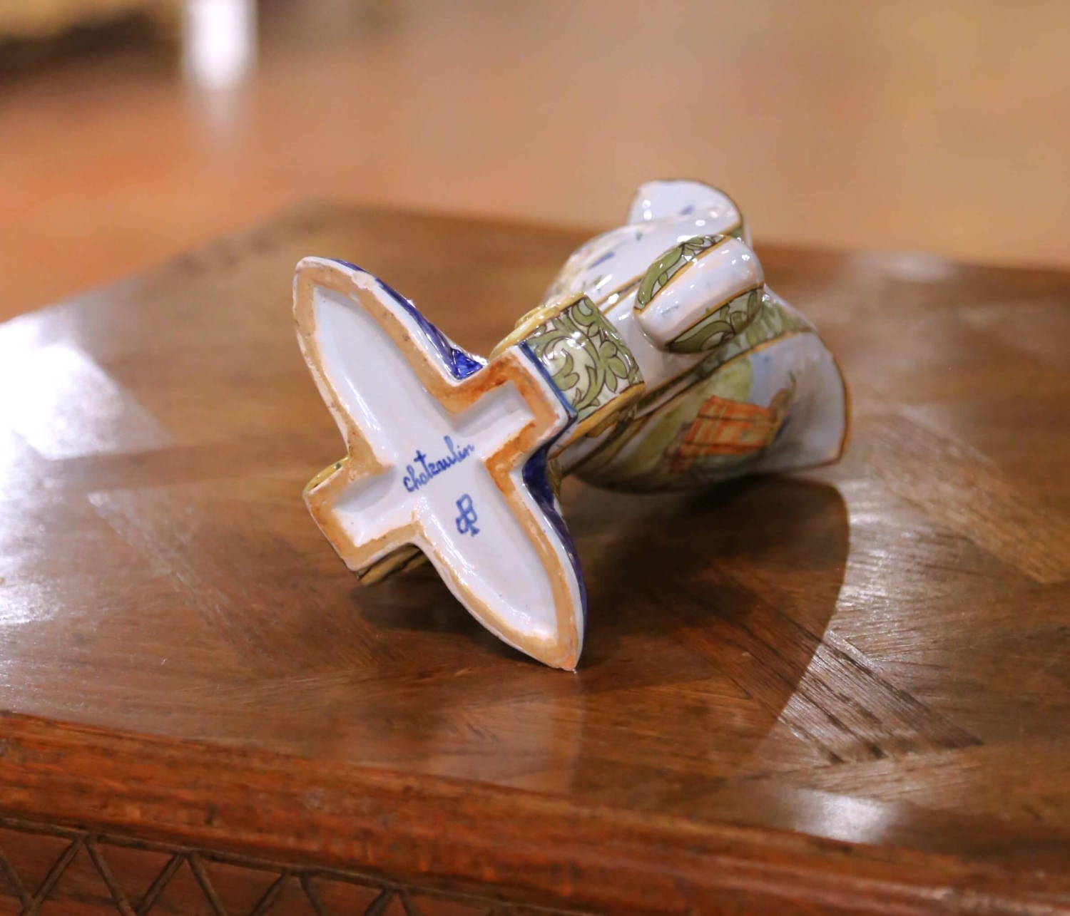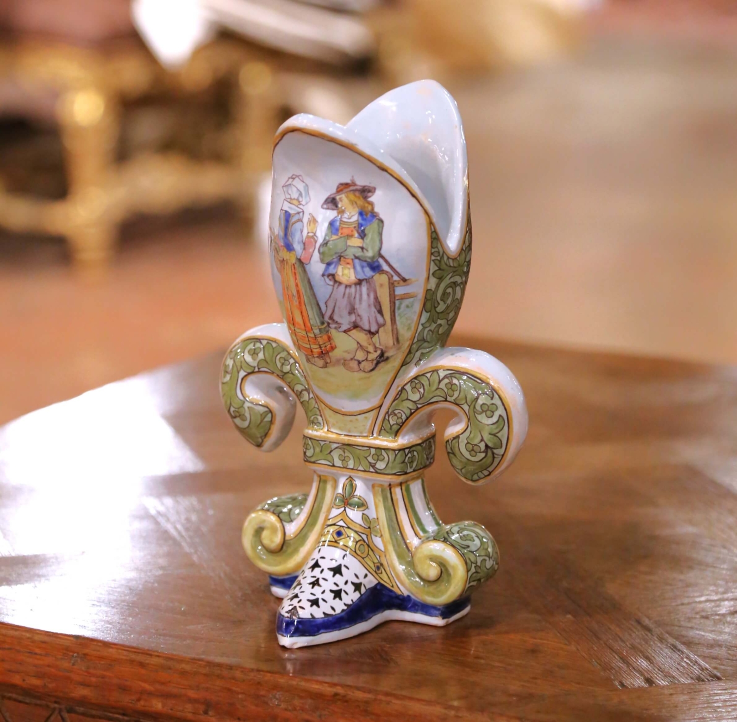 Bring regional Breton artistry to a shelf, console, or cabinet with this sculptural antique faience vase, crafted in Brittany circa 1890 and shaped as a stylized fleur-de-lis. Painted entirely by hand, the vessel features one panel with a colorful floral bouquet and another with traditional Breton figures in period dress. Scrolled foliate ornament in green and gold frames the central scenes, while the foot shows the classic black-and-white Quimper star motifs accented with rich cobalt blue. The underside is marked Châteaulin with the Porquier-Beau monogram PB, confirming production during the firm’s most collectible artistic period. Excellent condition commensurate with age and use. The Porquier-Beau partnership, active from about 1875 to 1904, represents the zenith of Quimper faience production. Under the artistic direction of Alfred Beau, the workshop elevated regional pottery to a refined art form characterized by painterly detail, naturalistic scenes, and innovative molded shapes such as this fleur-de-lys model. Porquier-Beau’s output remains sought after by collectors for its craftsmanship, historical charm, and unmistakable Breton identity. Dimensions: 6.5″ W x 6″ D x 9.5″ H.