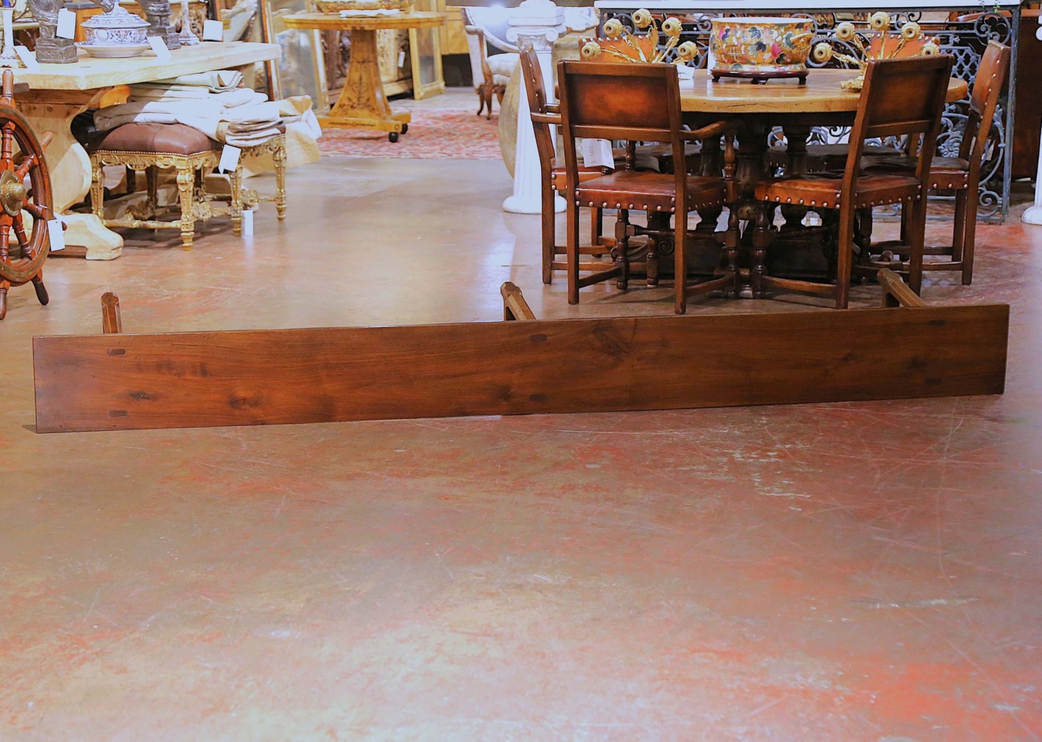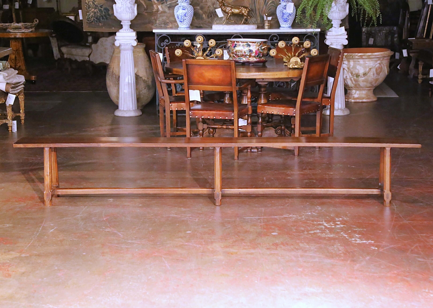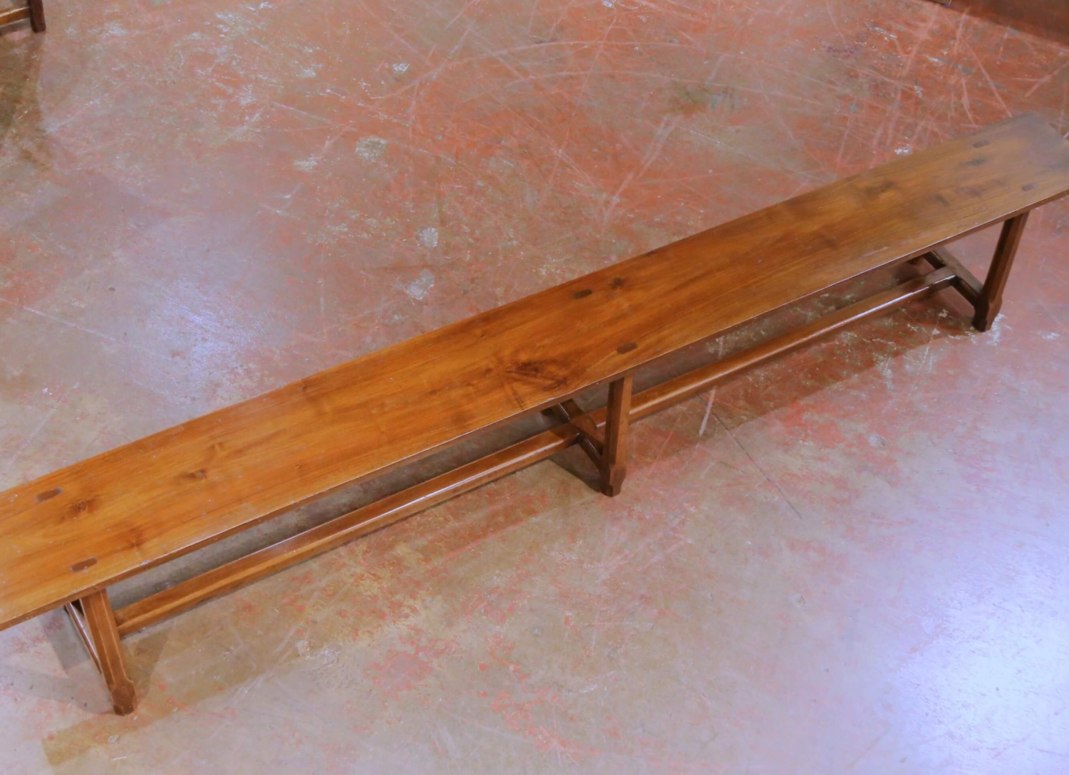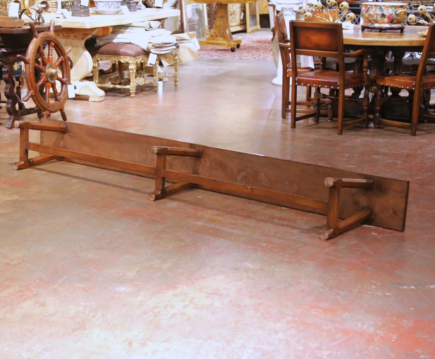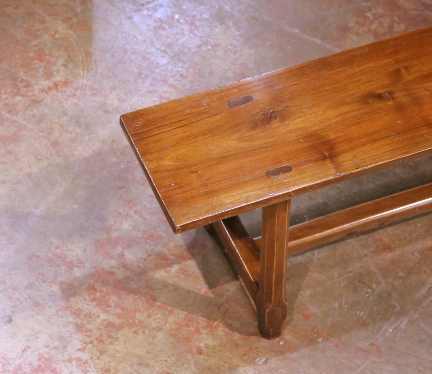 Bring understated farmhouse character to a dining room or kitchen with this elegant antique bench, crafted in the Poitou region of France circa 1890. Hand-carved from solid cherry wood, the long single-plank seat features traditional mortise and tenon construction and rests on three angled octagonal legs joined by a central stretcher for added stability. The top reveals attractive grain patterns and gentle wear that highlight the bench’s rural French provenance, while the rich walnut-brown patina lends warmth and authenticity to the piece. In excellent condition commensurate with age and use, this versatile bench is ideal along a farmhouse dining table, in an entryway, or on a covered terrace where its provincial charm and craftsmanship can be fully appreciated. Dimensions: 112″ W × 11″ D × 17.75″ H.