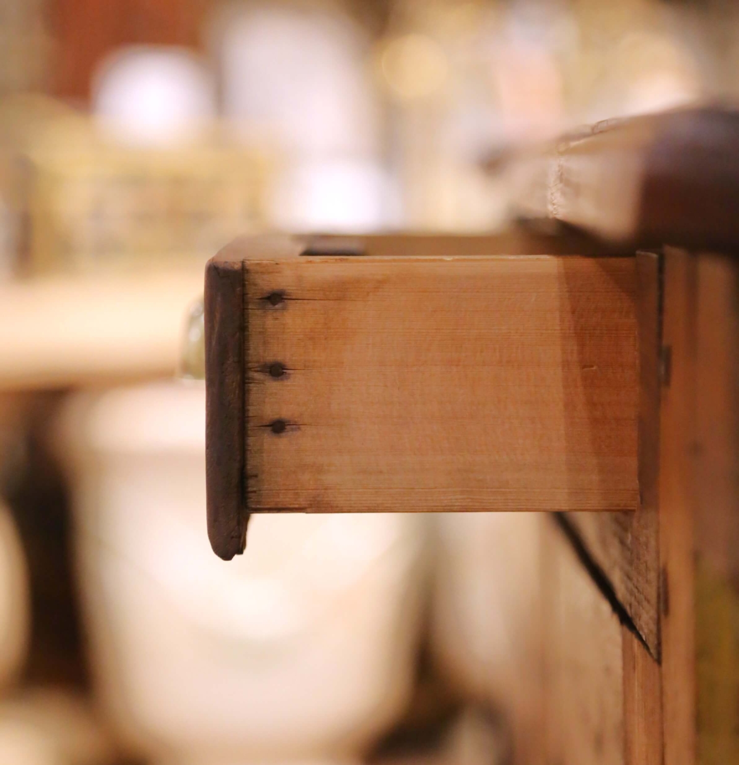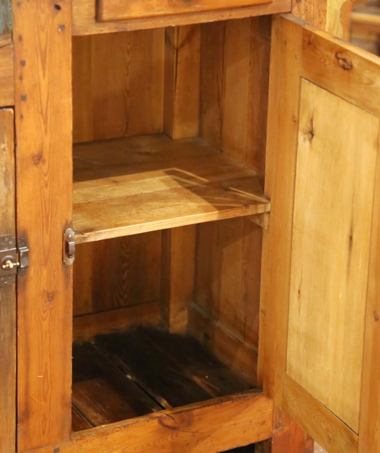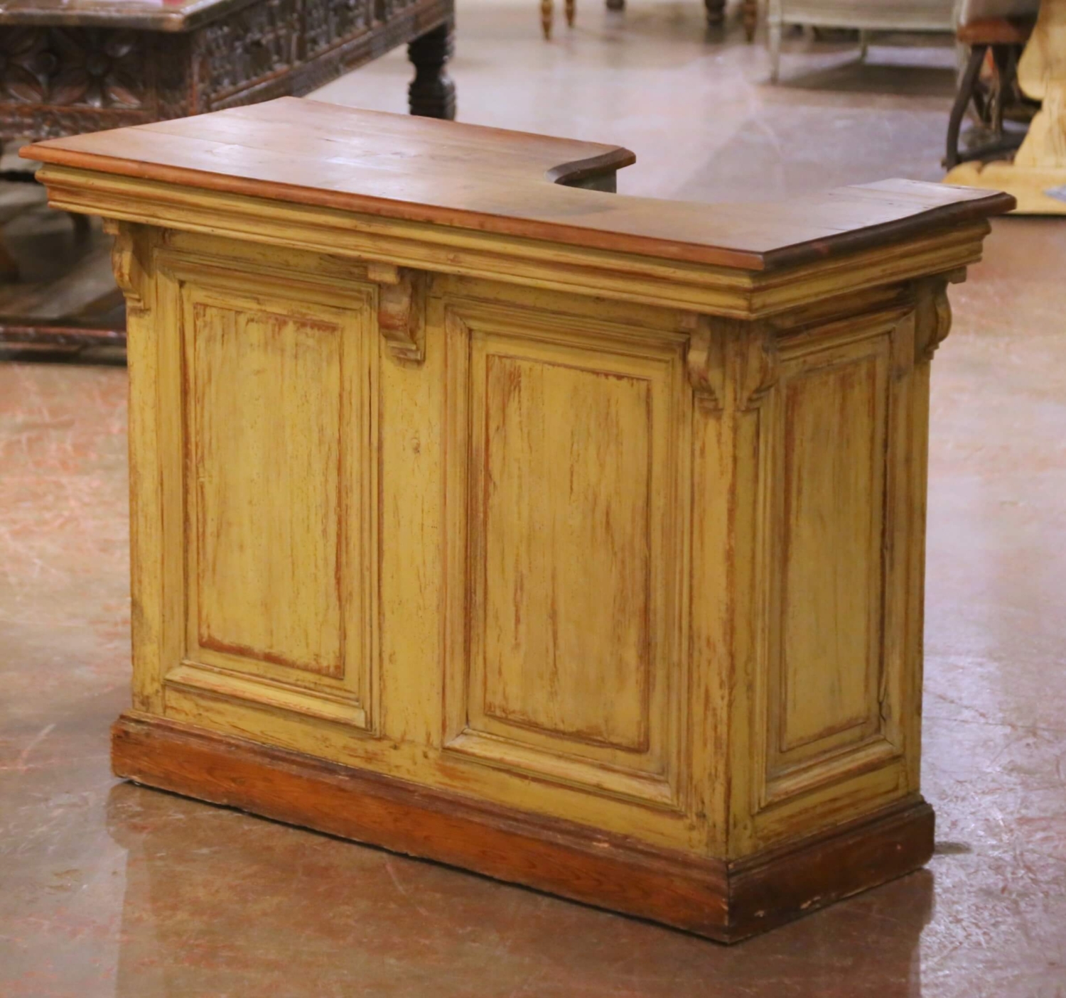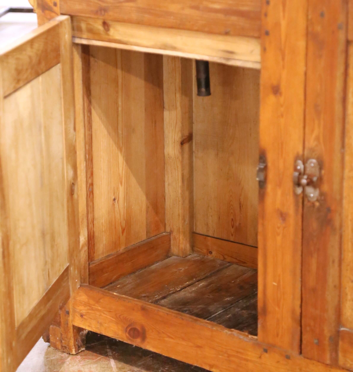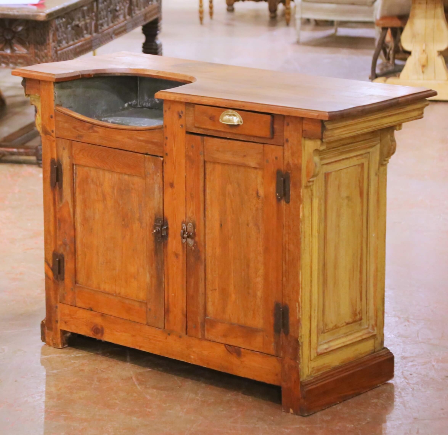This authentic antique French bar was crafted in Normandy circa 1870 and was originally intended as a functional service counter rather than a purely decorative furnishing. Constructed from solid pine, the bar features a thick plank top with a shaped cutout fitted with its original zinc-lined basin, complete with a drainage opening, reflecting its practical use for beverage service or preparation. The front presents paneled cabinet doors opening to generous interior storage, accompanied by a small drawer fitted with its original brass cup pull. The interior reveals straightforward provincial construction with pegged joinery and visible wear consistent with a hardworking rural or commercial piece. The zinc liner retains expected oxidation and surface patina from age and use, reinforcing its authenticity. The exterior retains remnants of its original painted finish, now beautifully worn and layered with time, revealing areas of exposed pine beneath. This naturally distressed surface gives the bar a richly textured appearance unique to true Norman furniture. The back is fully paneled and finished, allowing the piece to float comfortably in a room. In excellent condition commensurate with age and use, this antique Provincial bar is structurally sound and ready for use as a home bar, kitchen island, server, or statement piece in a wine room, restaurant, or retail setting. Dimensions: 55″W x 23.25″D x 39.5″H