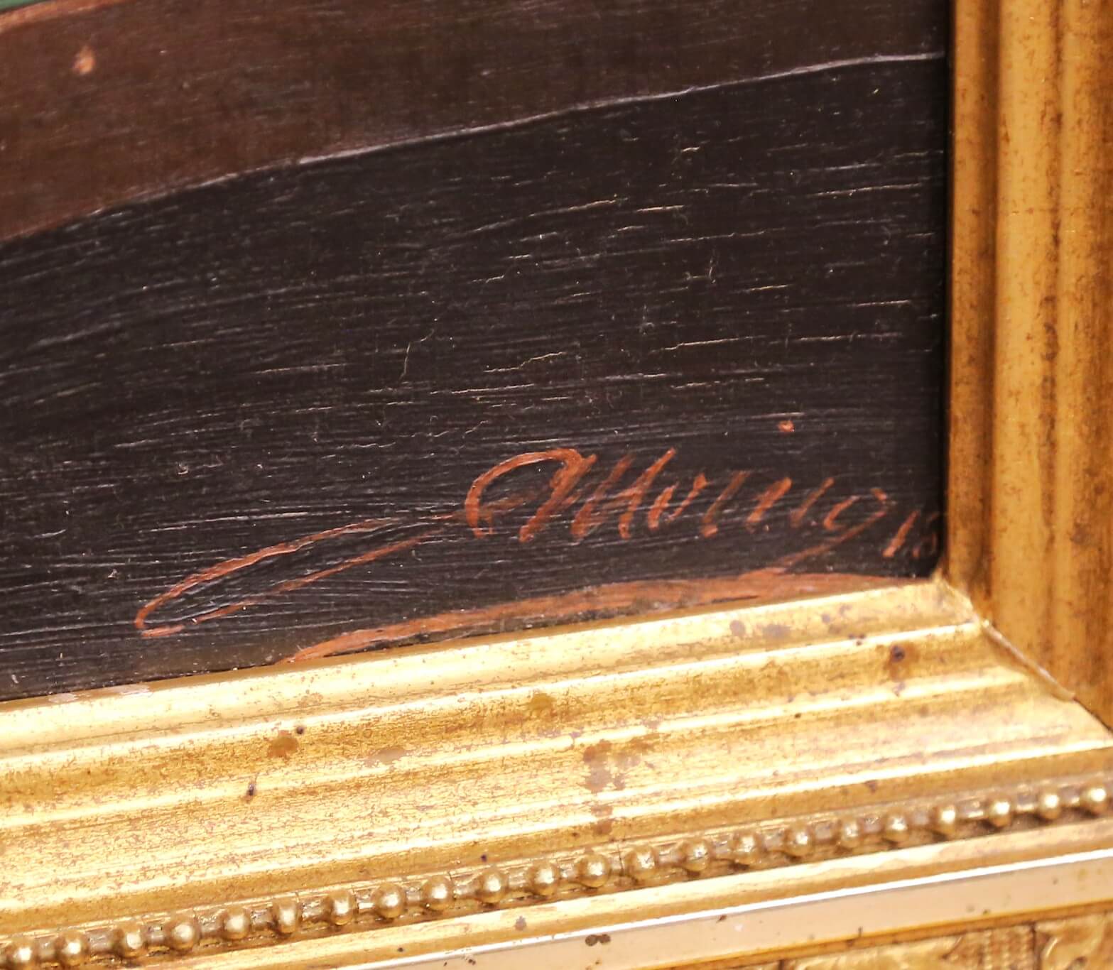 The painting is set in its original carved giltwood frame, richly decorated with foliate and beaded motifs, adding depth and elegance to the presentation. The work is signed in the lower right corner.
