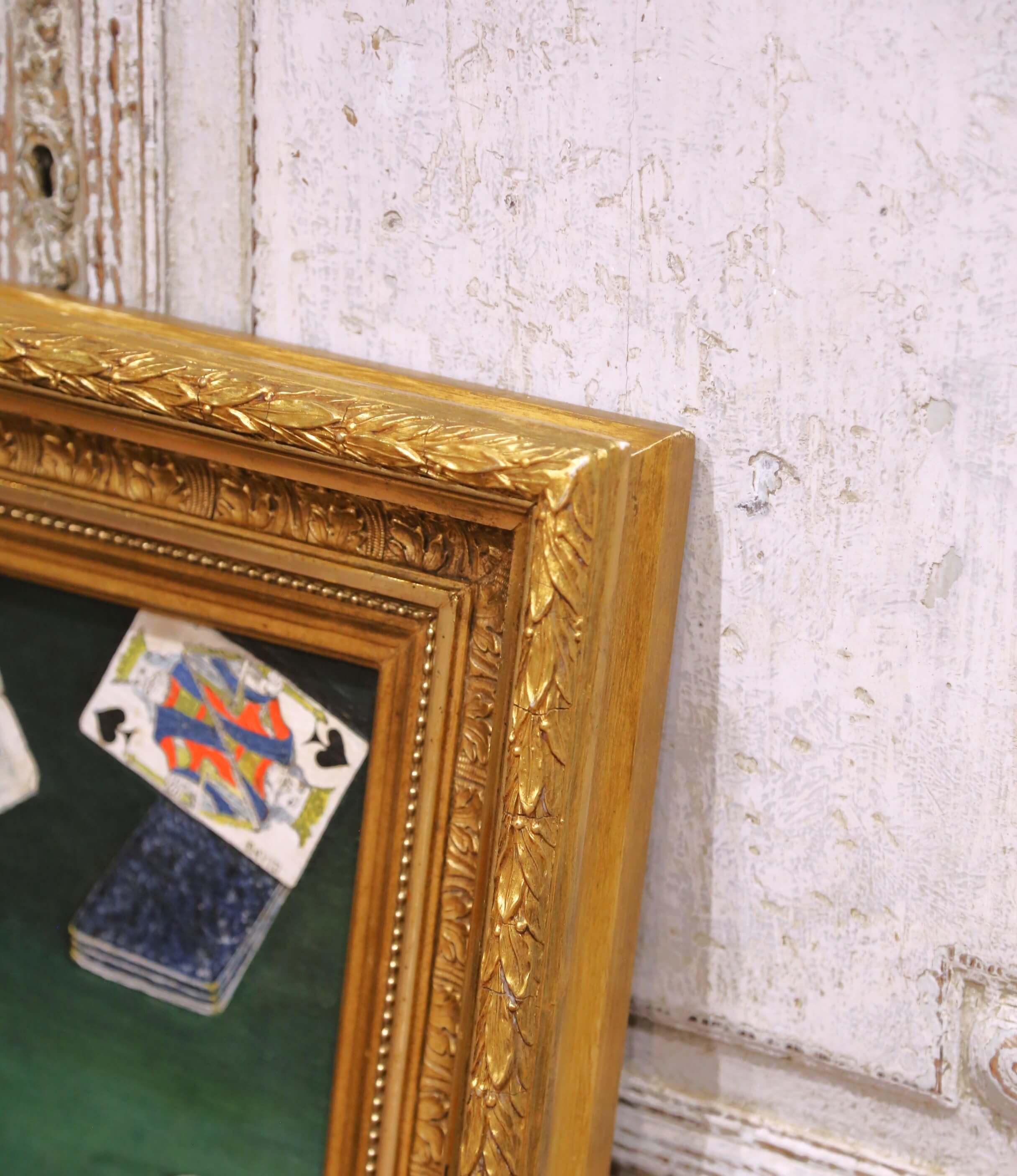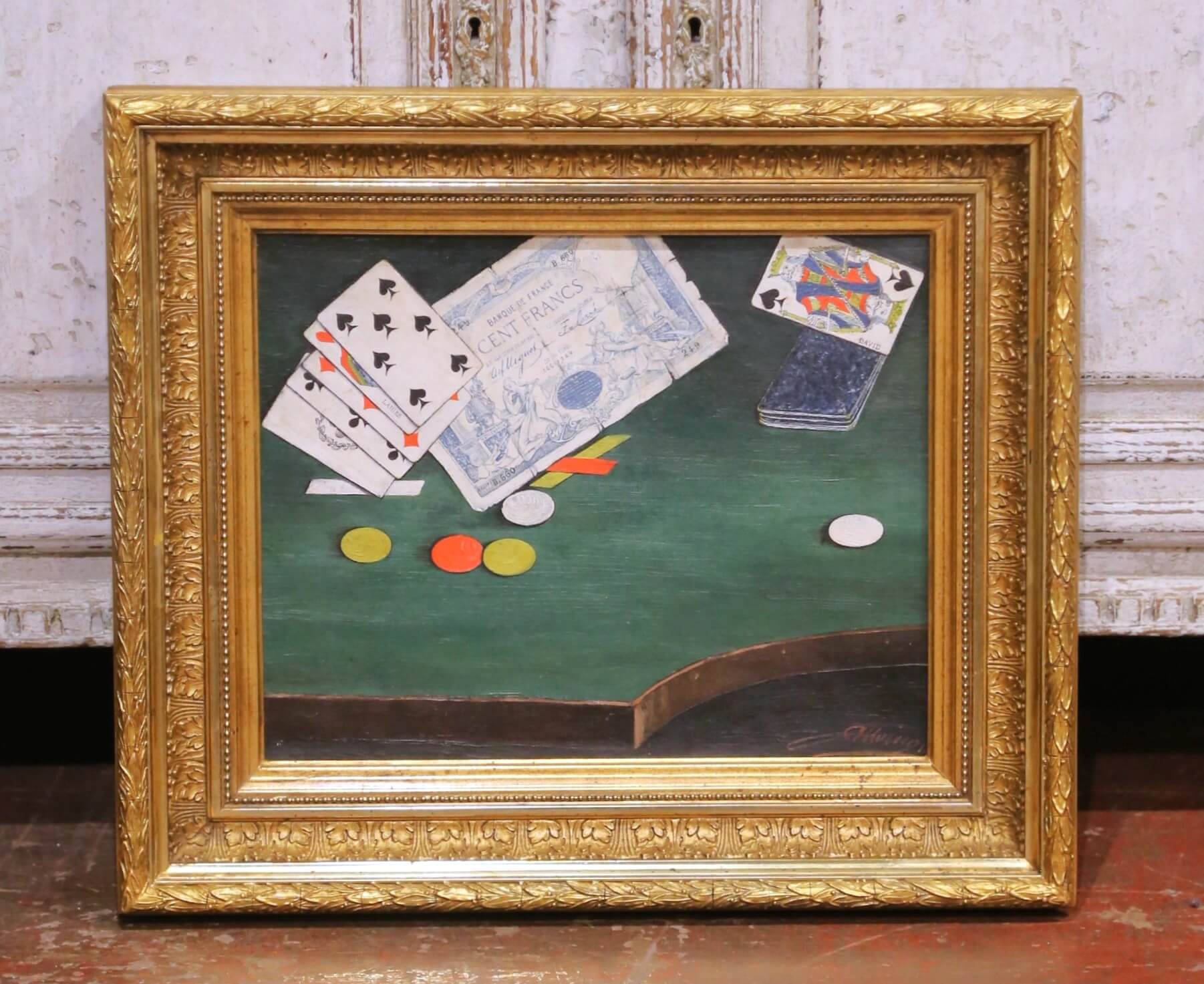 Decorate a study, game room, or bar area with this charming antique still life painting. Crafted in France circa 1890, the composition depicts a classic tabletop gaming scene featuring a spread of playing cards, a deck, colorful gaming chips, and a Banque de France one hundred francs note arranged across a green felt surface.