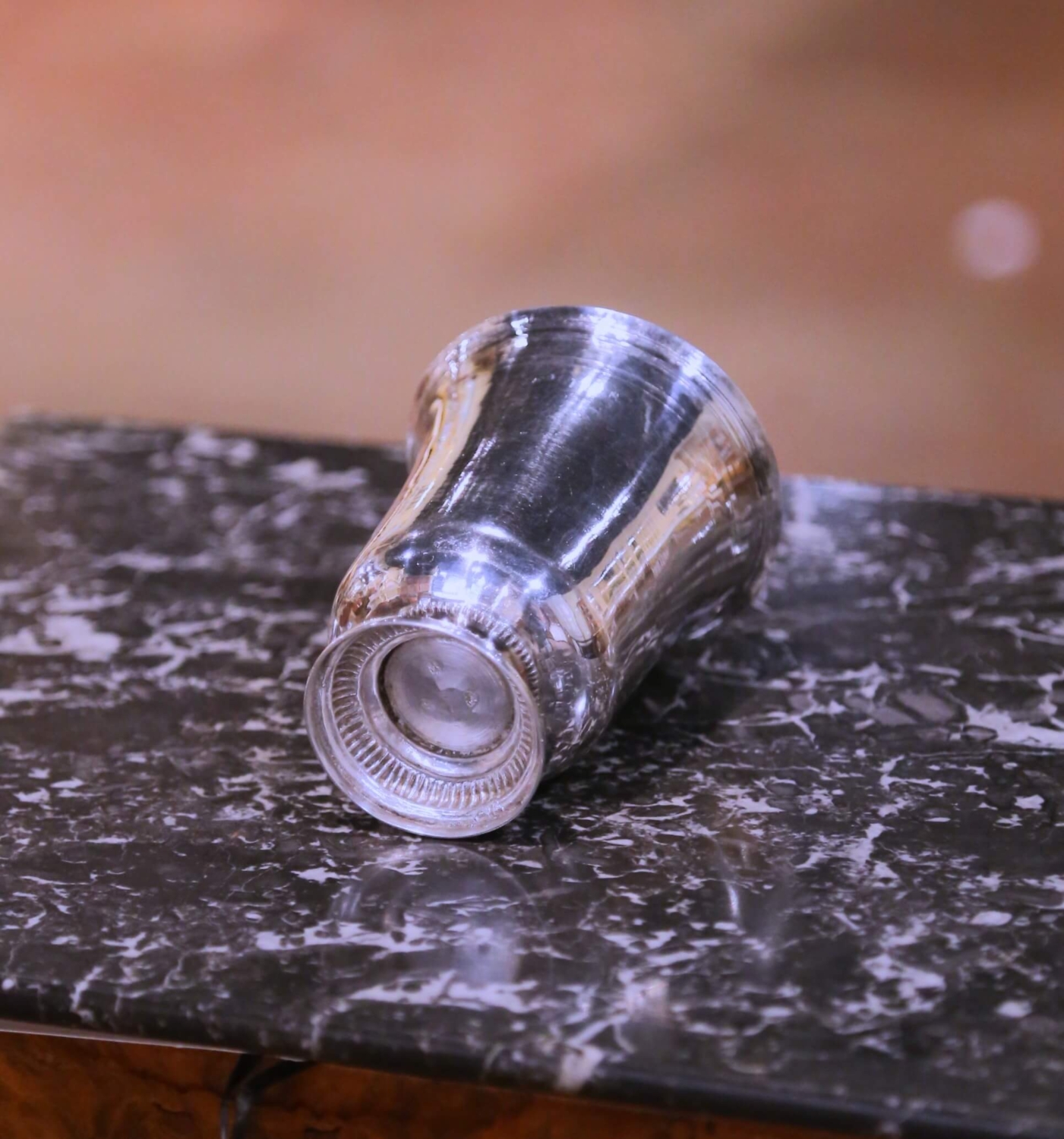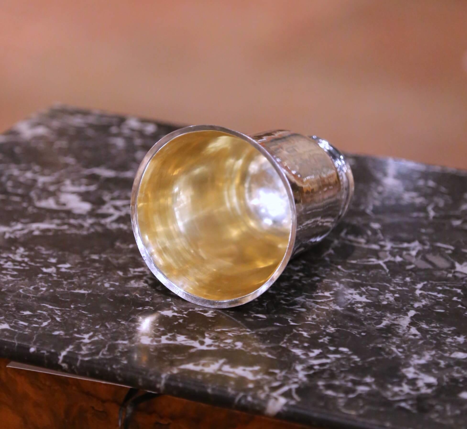 This antique French silver timbale was crafted circa 1860 and bears the official tête de Minerve poinçon, confirming solid silver of at least 800 purity. The form is classic and elegant, with a gently flared rim rising from a molded foot detailed with fine reeding, giving the piece a balanced and refined silhouette. The surface is adorned with a raised cross, suggesting its original use as a religious or baptismal vessel, a traditional gift in 19th century France. The interior retains its original vermeil gilding, providing both warmth in tone and practical protection for use. The silver presents a soft, time-earned patina with light surface wear consistent with age and use, enhancing its authentic antique character. Both decorative and symbolic, this piece works beautifully as a small vase, desk accessory, or meaningful display object. Dimensions: 3.25″diameter x 4.25″H