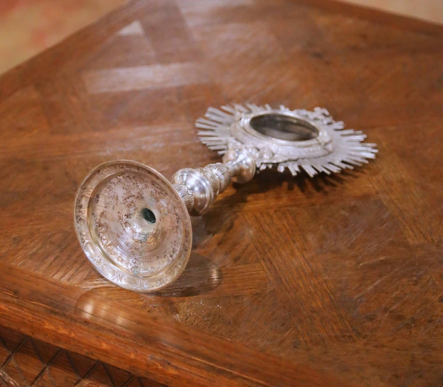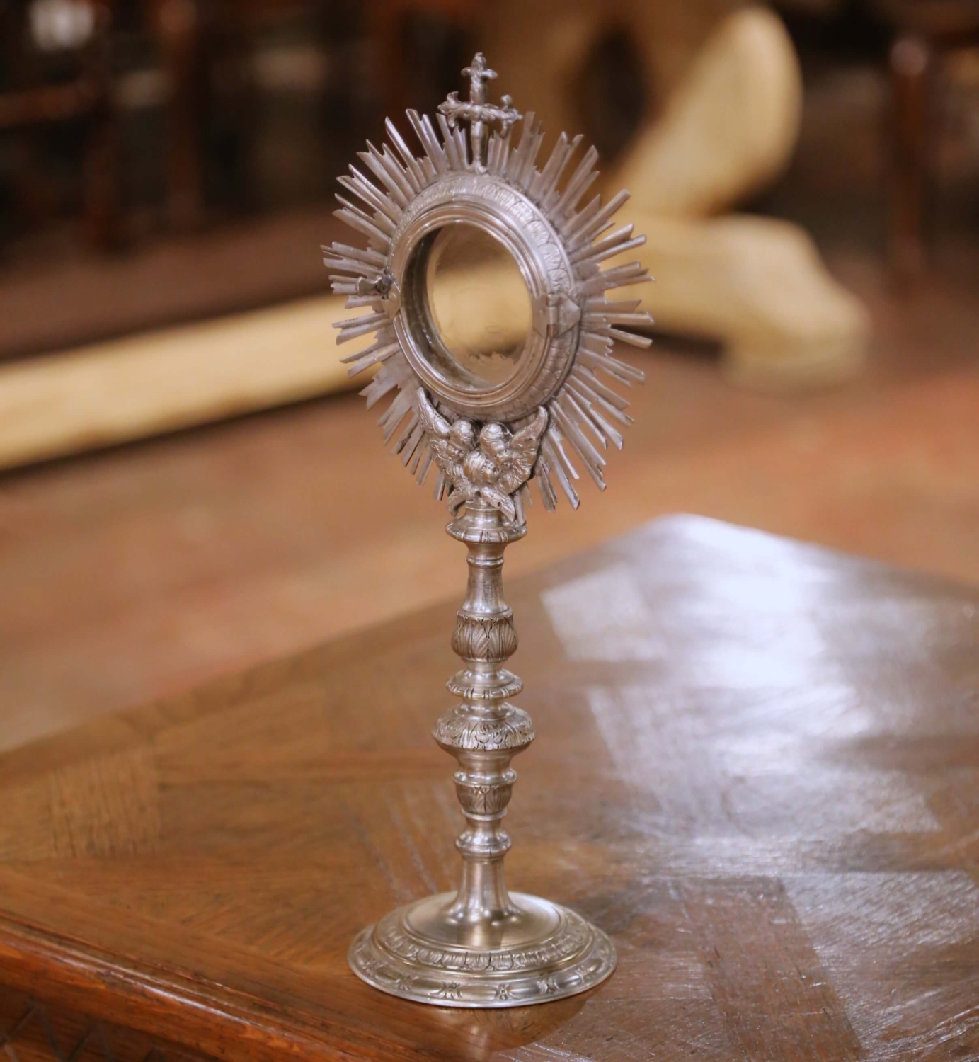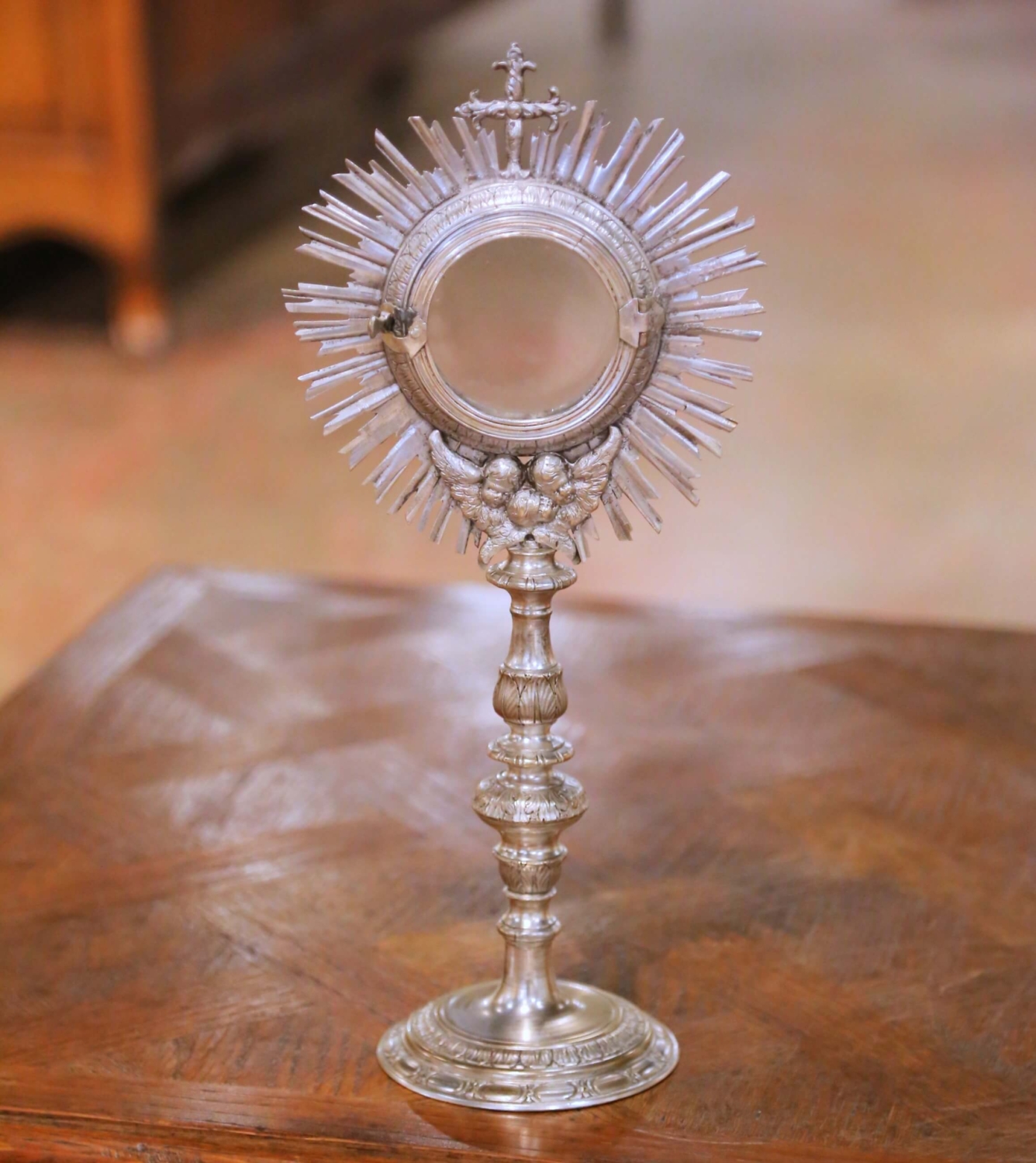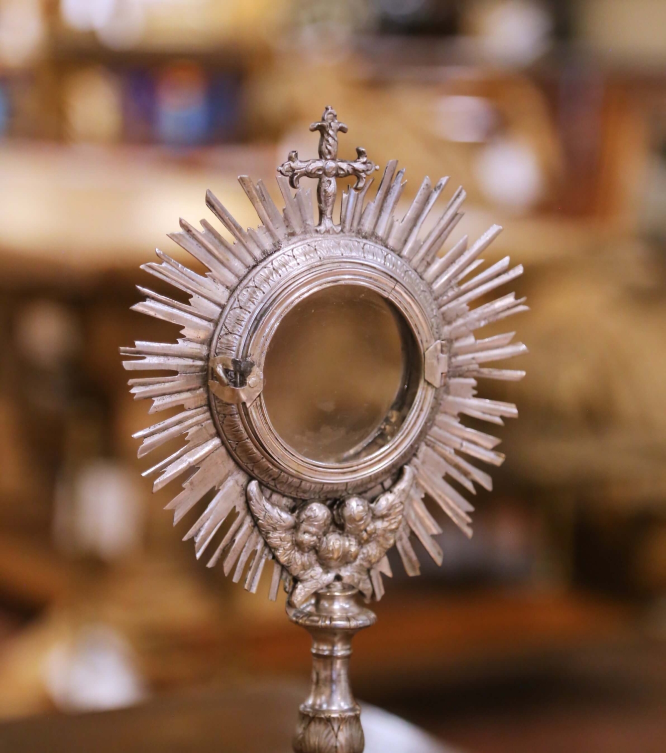 This refined antique French Catholic ostensoir monstrance was crafted in France circa 1850 and reflects the high level of ecclesiastical metalwork produced during the 19th century. Executed in bronze with a silvered finish, the piece features a radiant sunburst form centered by a circular glazed aperture, traditionally used for the display of the consecrated host or a sacred relic. The halo is surmounted by a sculpted Latin cross and enriched at the base with finely detailed cherubic heads and wings, symbolizing divine presence and protection. The slender baluster-form stem rises from a broad circular base adorned with classical relief decoration, providing both visual balance and structural stability. The surface retains a beautifully aged silvered patina with soft wear and tonal variation consistent with age, enhancing its authentic antique character. Both devotional and sculptural, this antique French monstrance is ideal for a religious collection, chapel display, or as a striking decorative accent in a curated interior. The piece is in excellent condition commensurate with age and use. Dimensions: 7″W x 4.5″D x 15″H