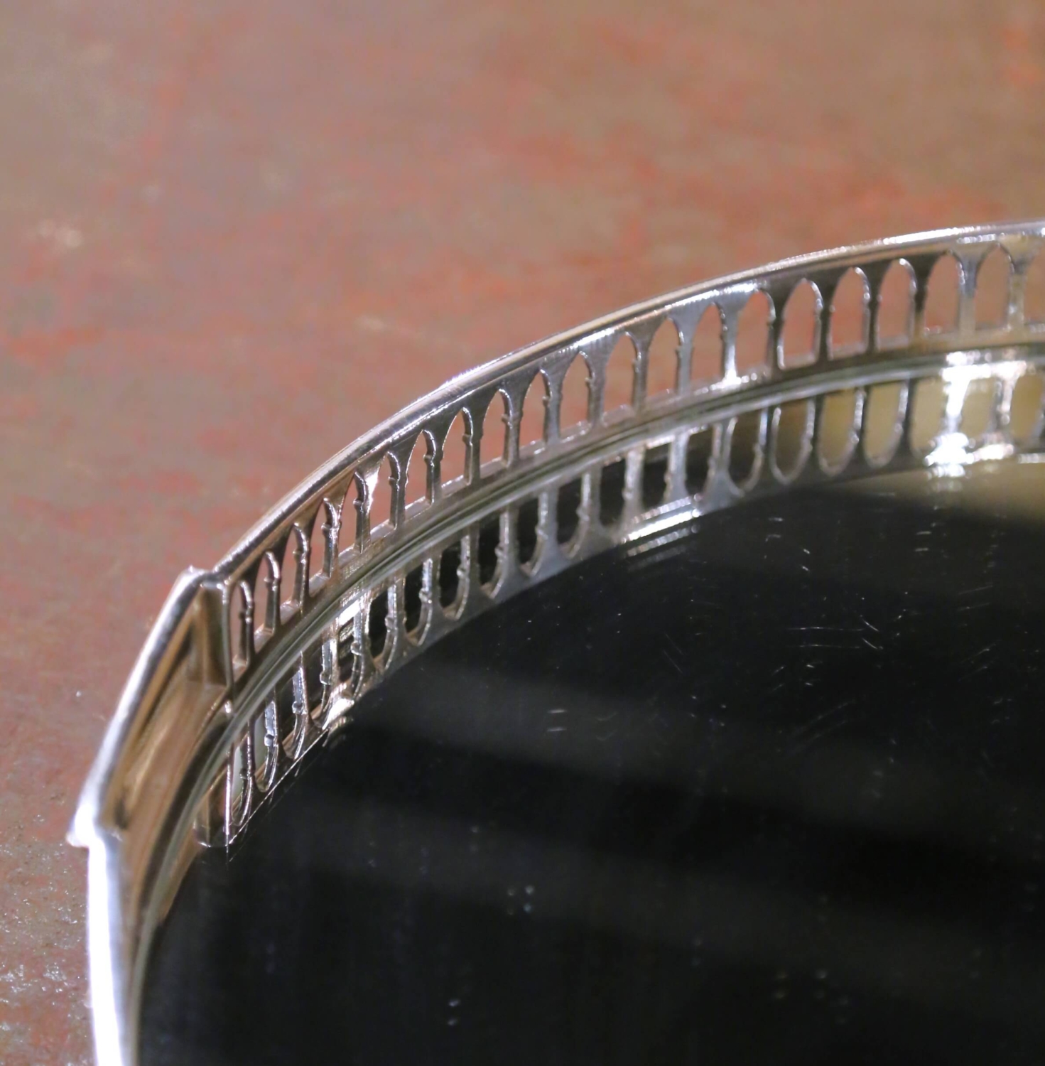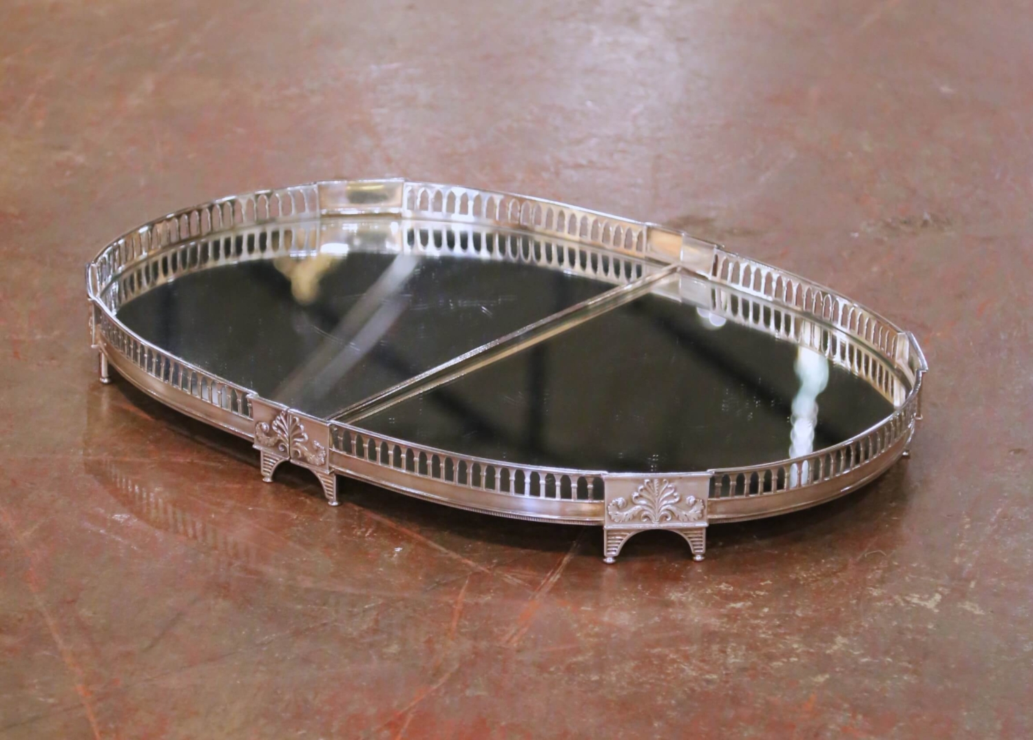 Decorate a dining table with this elegant antique French surtout de table crafted circa 1860. Made of finely cast silvered bronze, the oval centerpiece is composed of two fixed sections designed to be displayed together as one unified form. The surtout rests on fluted square feet and is encircled by a pierced frieze gallery with repeating X-form balustrade motifs, accented by classical mounts and foliate detailing at the central join. The original mirrored plateaus remain intact, reflecting candlelight and floral arrangements beautifully, and are set over the original wooden bottoms. The silvered bronze surface retains a rich, time-softened patina consistent with age and use, reinforcing the refined presence and authentic antique character of the piece. Traditionally, a surtout de table served as the focal point of a formal dining table, supporting candelabra, decorative objects, and seasonal arrangements while enhancing light and symmetry. By the 19th century, no formal table was considered complete without one, and today these centerpieces remain highly sought after for both traditional and transitional interiors. This antique surtout de table is in excellent condition commensurate with age and use and displays beautifully as a functional and decorative centerpiece. Dimensions: 28.5″W x 20.25″D x 3″H