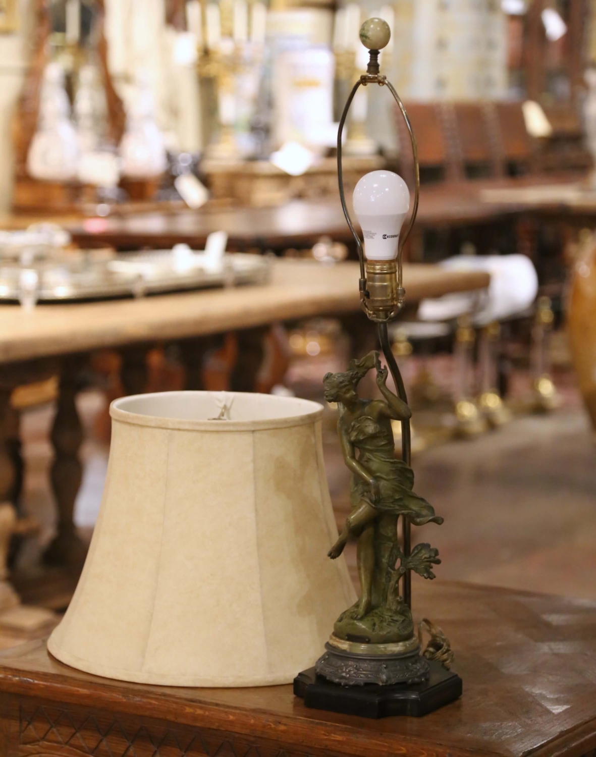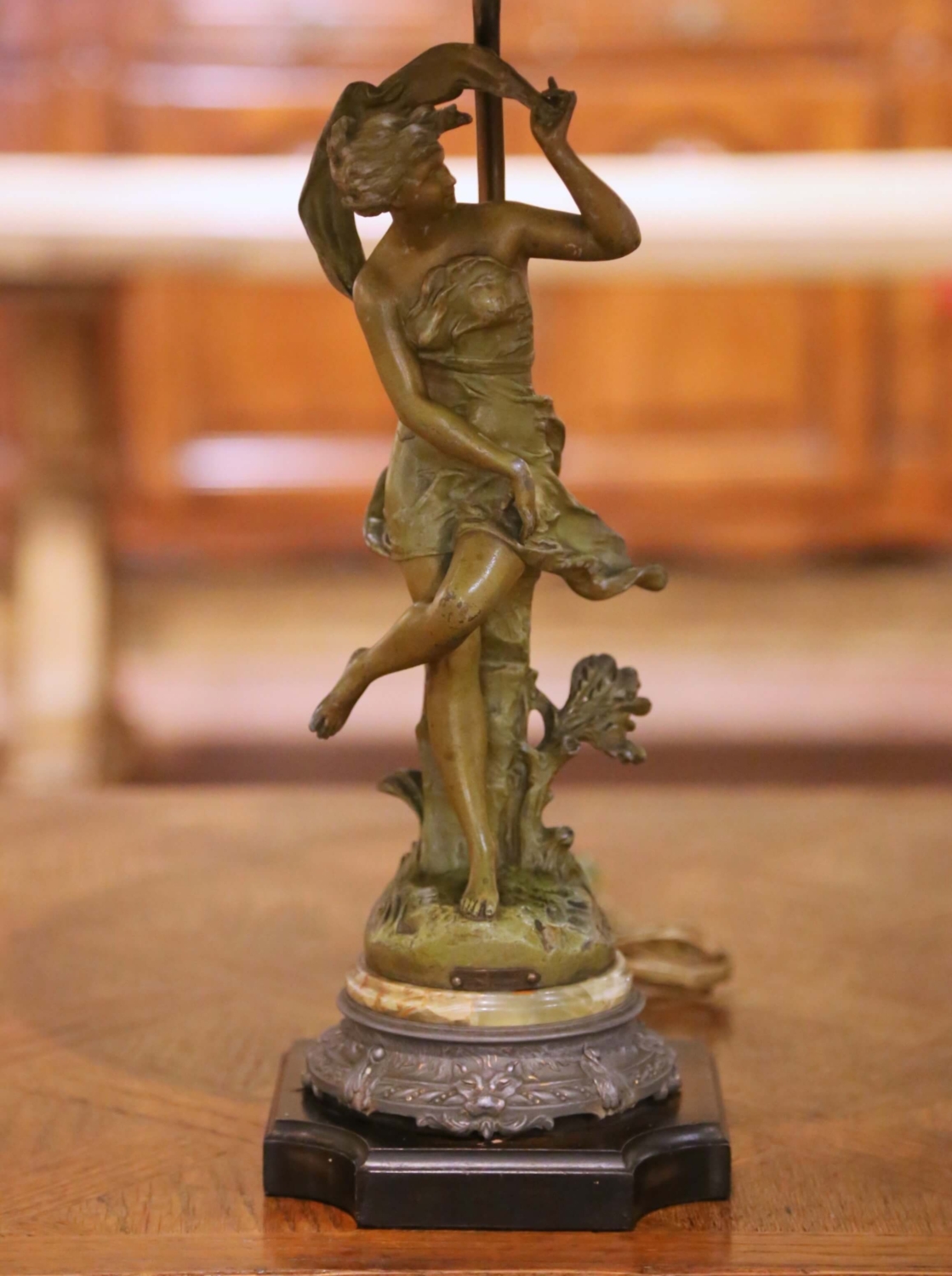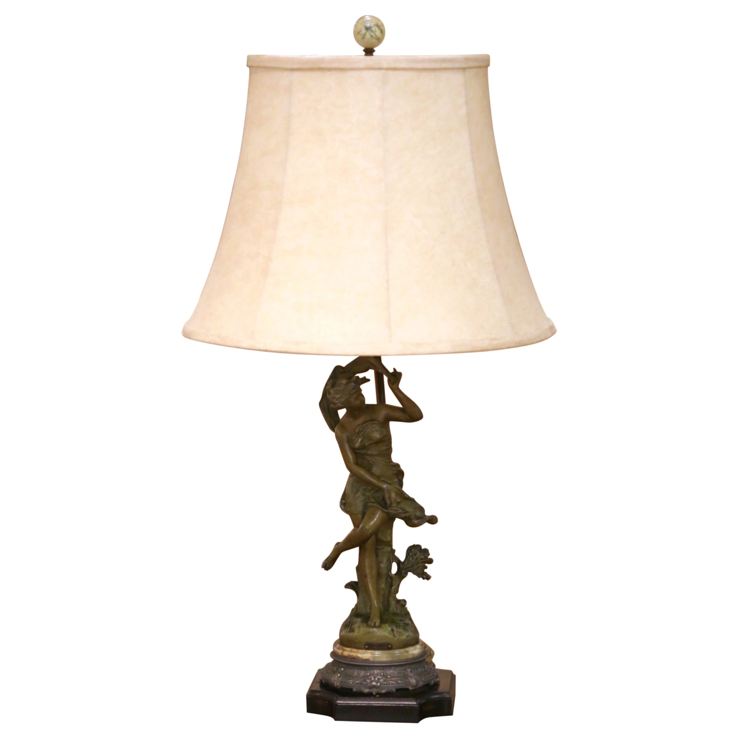 Add a sculptural and poetic accent to your interior with this elegant antique figural lamp. Crafted in France circa 1870, the piece features a finely cast spelter sculpture of a young maiden in motion, her windswept drapery and expressive pose evoking the lightness and spontaneity of the Belle Époque taste. The figure is mounted as a lamp, gracefully interacting with the structure, giving the composition both movement and purpose. The sculpture retains a beautiful verdigris patina over the spelter, enhancing the depth of the modeling and lending a rich, time-softened surface. The figure stands on a molded base set over a decorative metal plinth and shaped black base, with a warm-toned marble spacer adding contrast and refinement. The lamp is further accented with a small titled plaque reading “Coup de Soleil par Ferrand” and signed Ferrand in the casting. This work is after a model by Ferrand, a listed French sculptor active in the late 19th century, known for genre figures and allegorical subjects produced in bronze and spelter for the decorative arts market. His works often depict graceful female forms in animated poses, aligning with the popular tastes of the period and the rise of accessible sculptural lighting. Pieces bearing his name were frequently edited by Parisian foundries and remain collectible today for their charm and decorative appeal. The lamp has been fitted for electricity and includes the shade shown. It is in excellent condition commensurate with age and use, with a desirable patinated surface and light wear consistent with its history. Dimensions of lamp only: 8″ Diameter x 28.5″H Shade 15.5″ x 15.5