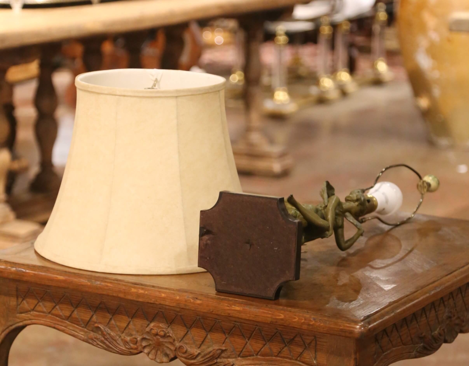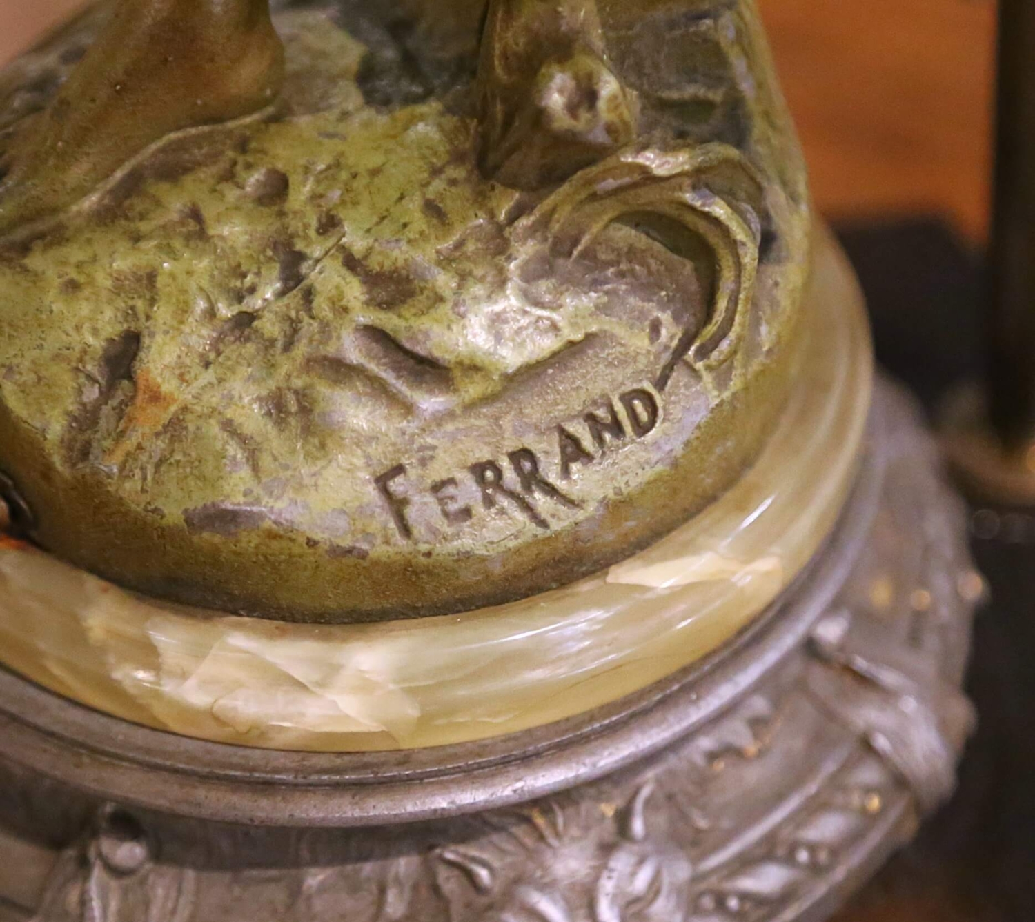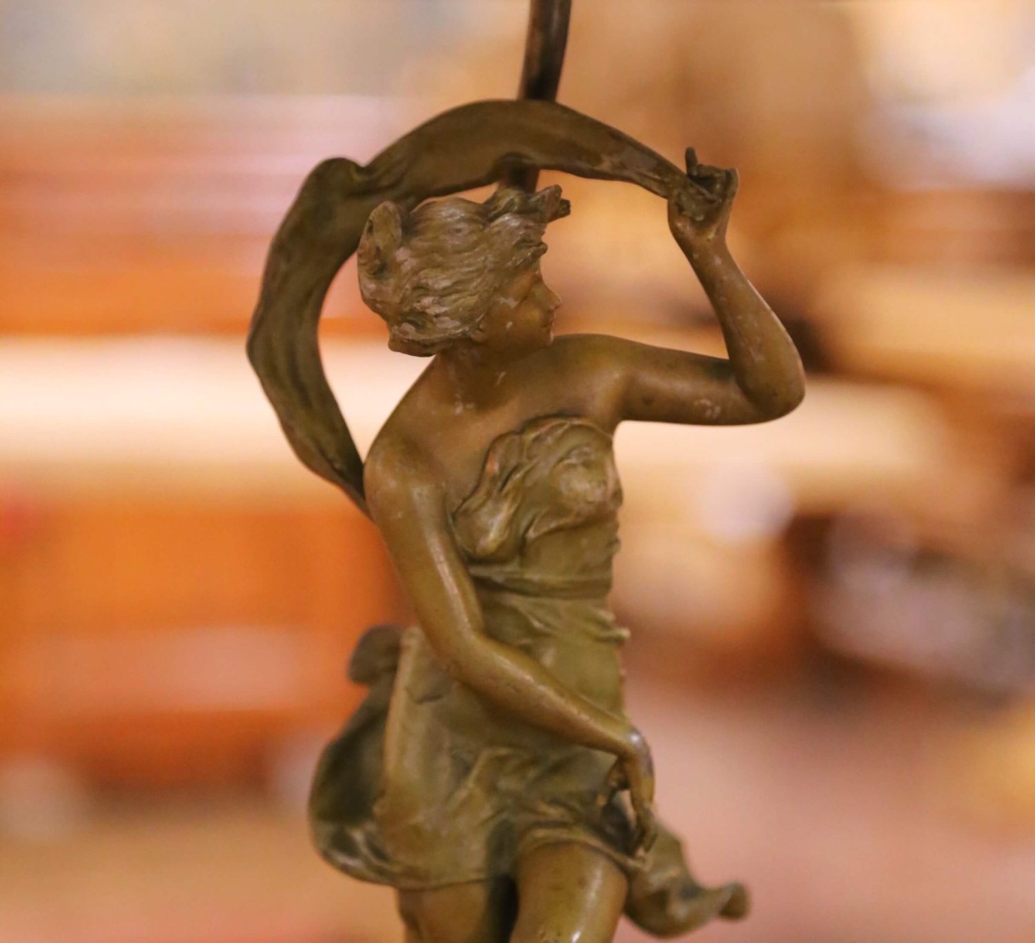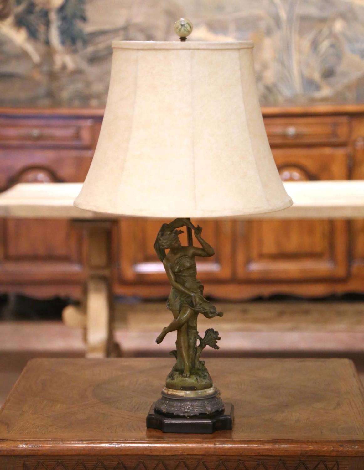 Add a sculptural and poetic accent to your interior with this elegant antique figural lamp. Crafted in France circa 1870, the piece features a finely cast spelter sculpture of a young maiden in motion, her windswept drapery and expressive pose evoking the lightness and spontaneity of the Belle Époque taste. The figure is mounted as a lamp, gracefully interacting with the structure, giving the composition both movement and purpose. The sculpture retains a beautiful verdigris patina over the spelter, enhancing the depth of the modeling and lending a rich, time-softened surface. The figure stands on a molded base set over a decorative metal plinth and shaped black base, with a warm-toned marble spacer adding contrast and refinement. The lamp is further accented with a small titled plaque reading “Coup de Soleil par Ferrand” and signed Ferrand in the casting. This work is after a model by Ferrand, a listed French sculptor active in the late 19th century, known for genre figures and allegorical subjects produced in bronze and spelter for the decorative arts market. His works often depict graceful female forms in animated poses, aligning with the popular tastes of the period and the rise of accessible sculptural lighting. Pieces bearing his name were frequently edited by Parisian foundries and remain collectible today for their charm and decorative appeal. The lamp has been fitted for electricity and includes the shade shown. It is in excellent condition commensurate with age and use, with a desirable patinated surface and light wear consistent with its history. Dimensions of lamp only: 8″ Diameter x 28.5″H Shade 15.5″ x 15.5