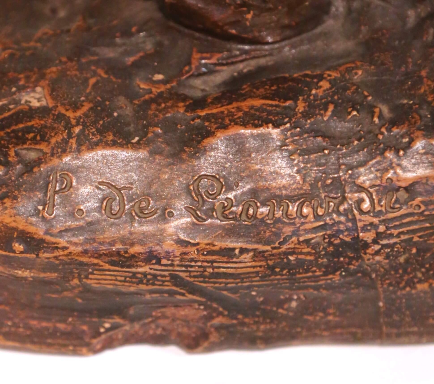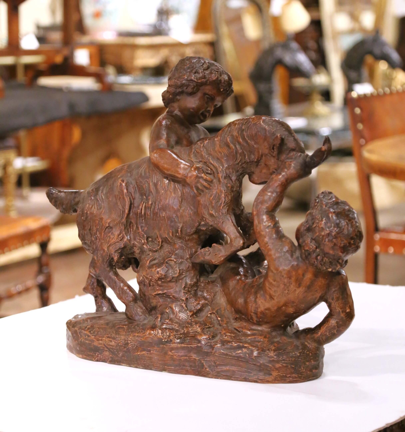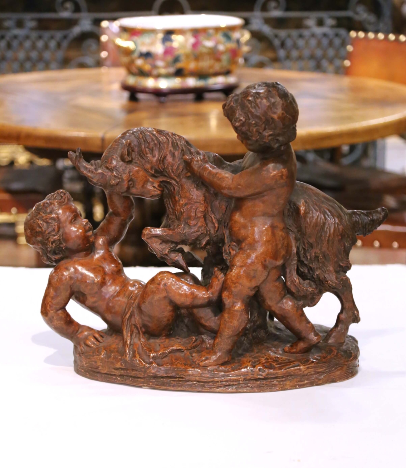 This delightful antique sculpture was crafted in France circa 1890, and depicts two cherubic children at play with a goat in a joyful, animated composition. Sculpted in clay and signed on the base P. de Leonardi, the piece beautifully captures the innocence and vitality of childhood through expressive detail and graceful movement. The richly modeled figures feature softly rounded forms, textured hair, and naturalistic gestures, while the goat is rendered with fine attention to anatomy and flowing fur. The large-scale composition rests on an integral base, its surface exhibiting a warm, deep brown patinated finish that enhances the lifelike modeling and depth of the clay. In excellent condition commensurate with age and use, this 19th-century French sculpture adds warmth and charm to any mantel, console, or tabletop. Pierre de Leonardi (1860-1940) was a French sculptor active in the late 19th and early 20th centuries, known for his romantic and naturalistic representations of childhood and pastoral subjects. Measures: 25″ W × 10.5″ D × 20″ H.
