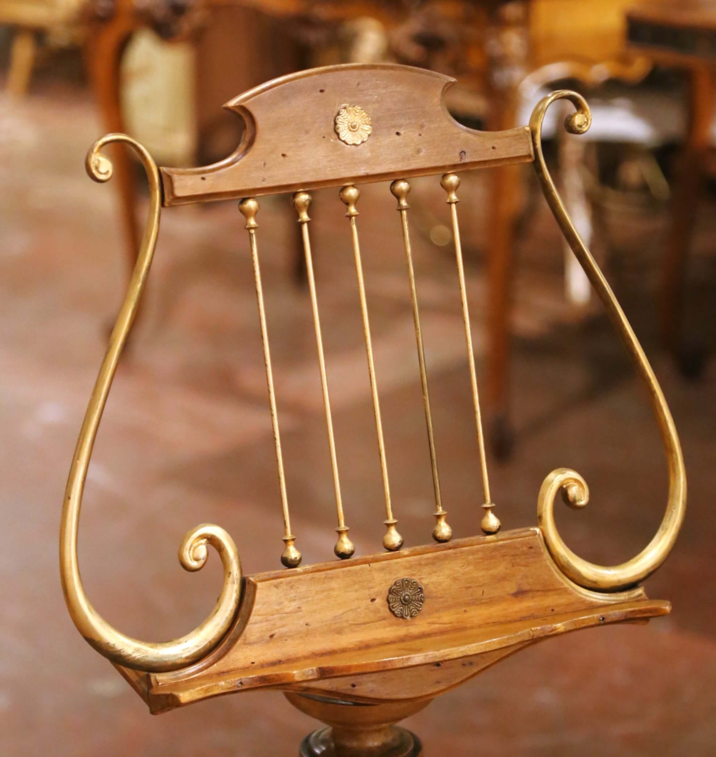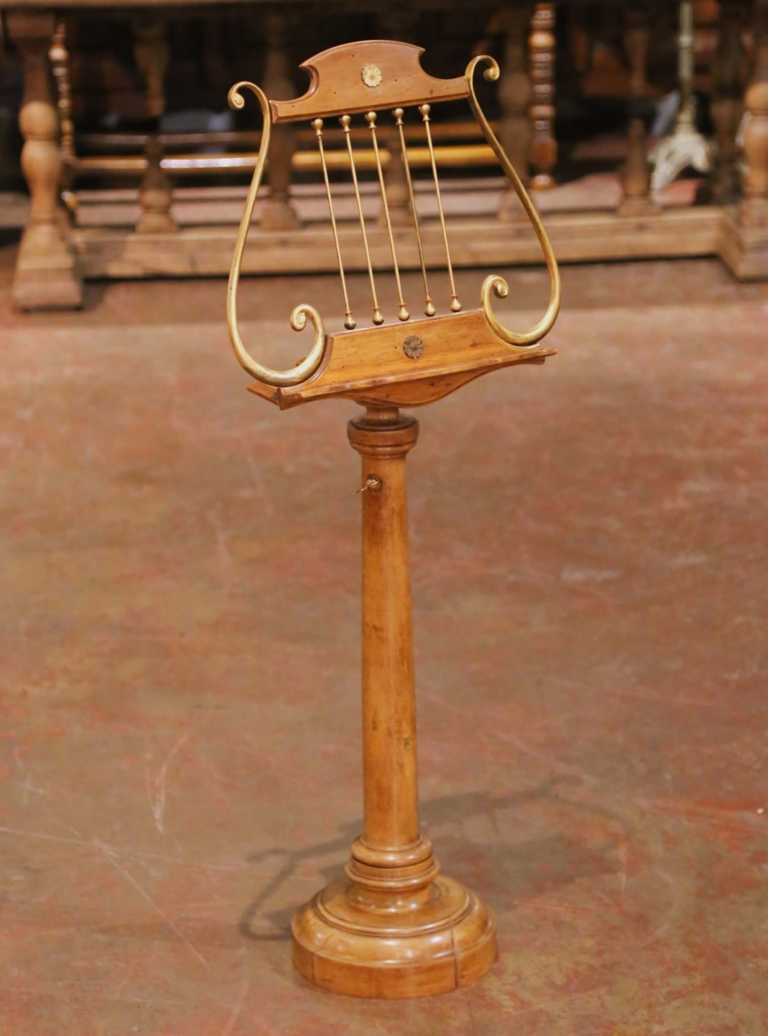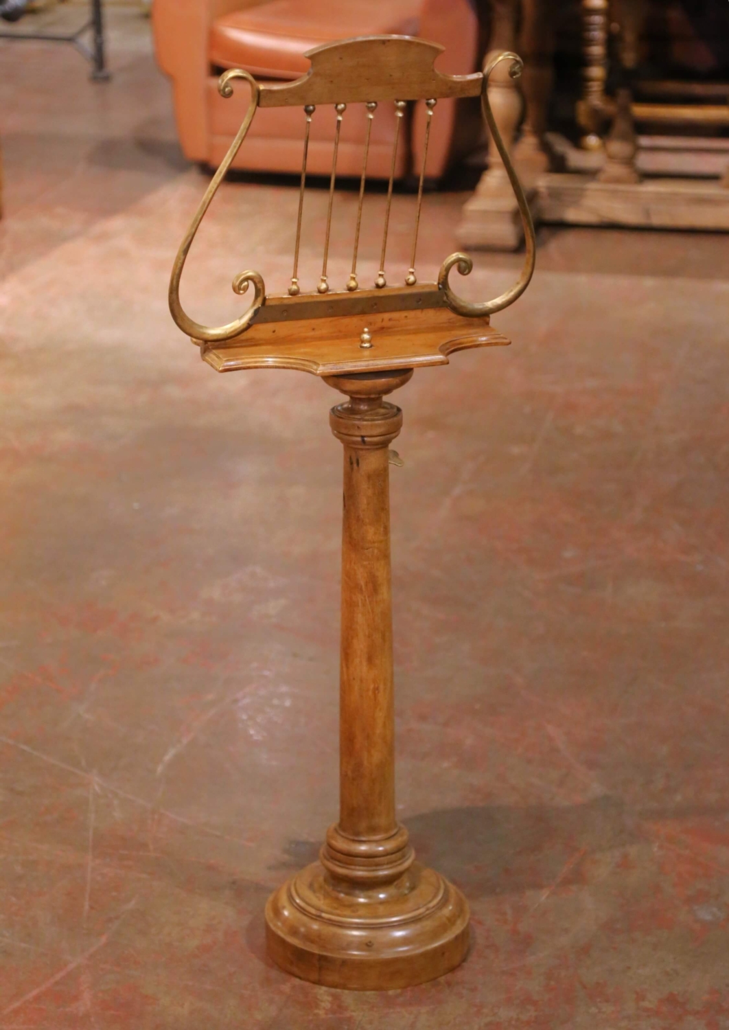 Crafted in France circa 1870, this elegant antique music stand, or lutrin, is built of solid walnut and designed in the graceful form of a classical lyre. The shaped upper crest is centered with a decorative rosette and fitted with slender brass rods framed by scrolling brass arms, creating a refined silhouette inspired by traditional musical instruments. The design reflects the decorative taste of the Napoleon III period, when classical motifs such as the lyre were widely used in furniture associated with music rooms and salons. The shaped reading ledge features a small brass peg to help secure sheet music or a book in place. The stand is mounted on a slender iron rod that allows the height to be adjustable and secured with the original brass key. The column rises from a turned walnut pedestal base and displays a warm and rich walnut patina developed over time. Both decorative and functional, this antique French music stand brings sculptural presence to a music room, library, or study while serving as an elegant display for sheet music or a large book. The piece remains in excellent antique condition commensurate with age and use. Dimensions: 17.5″W x 10″D x 45.5″H Goes all the way up to 55″H