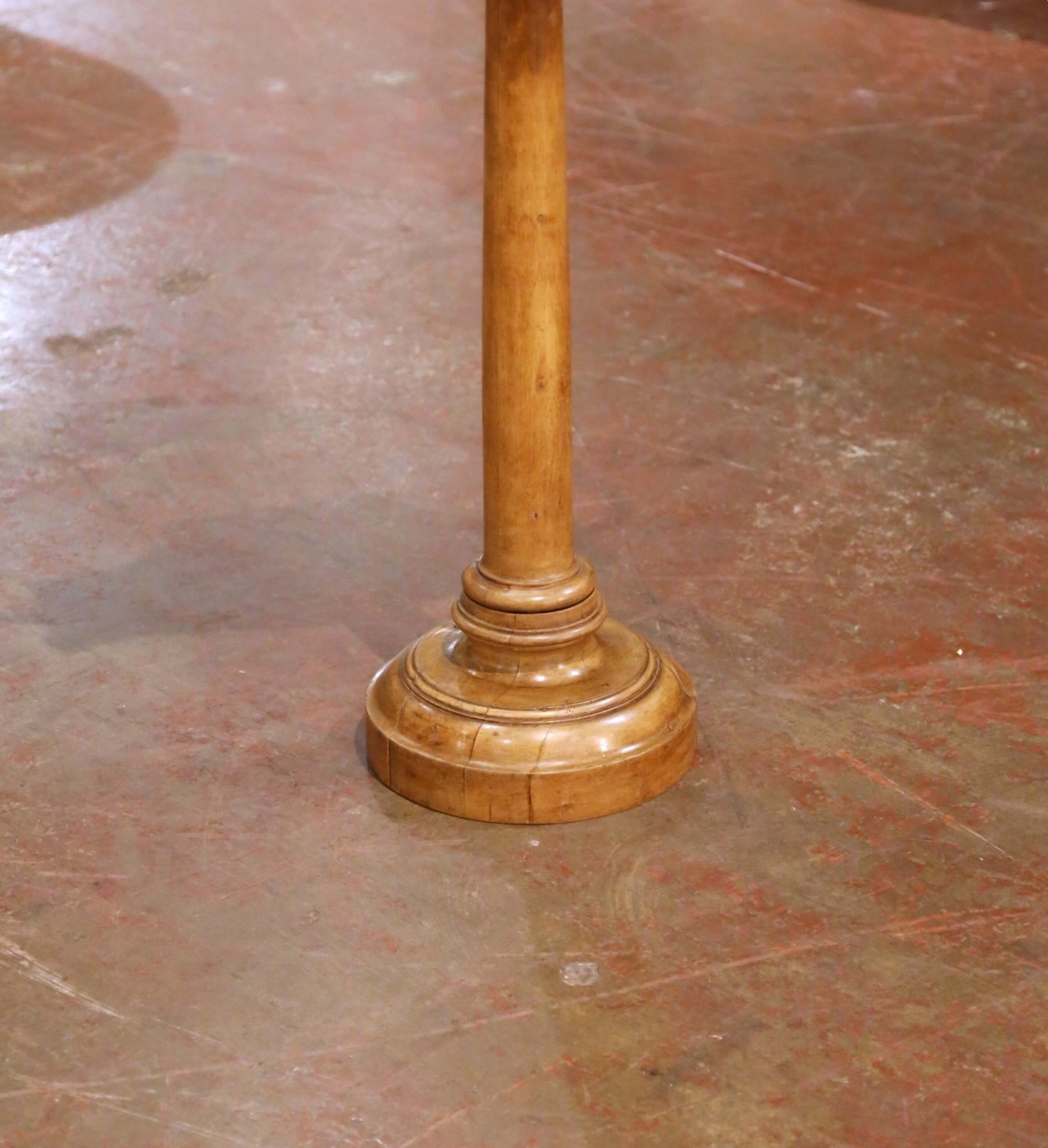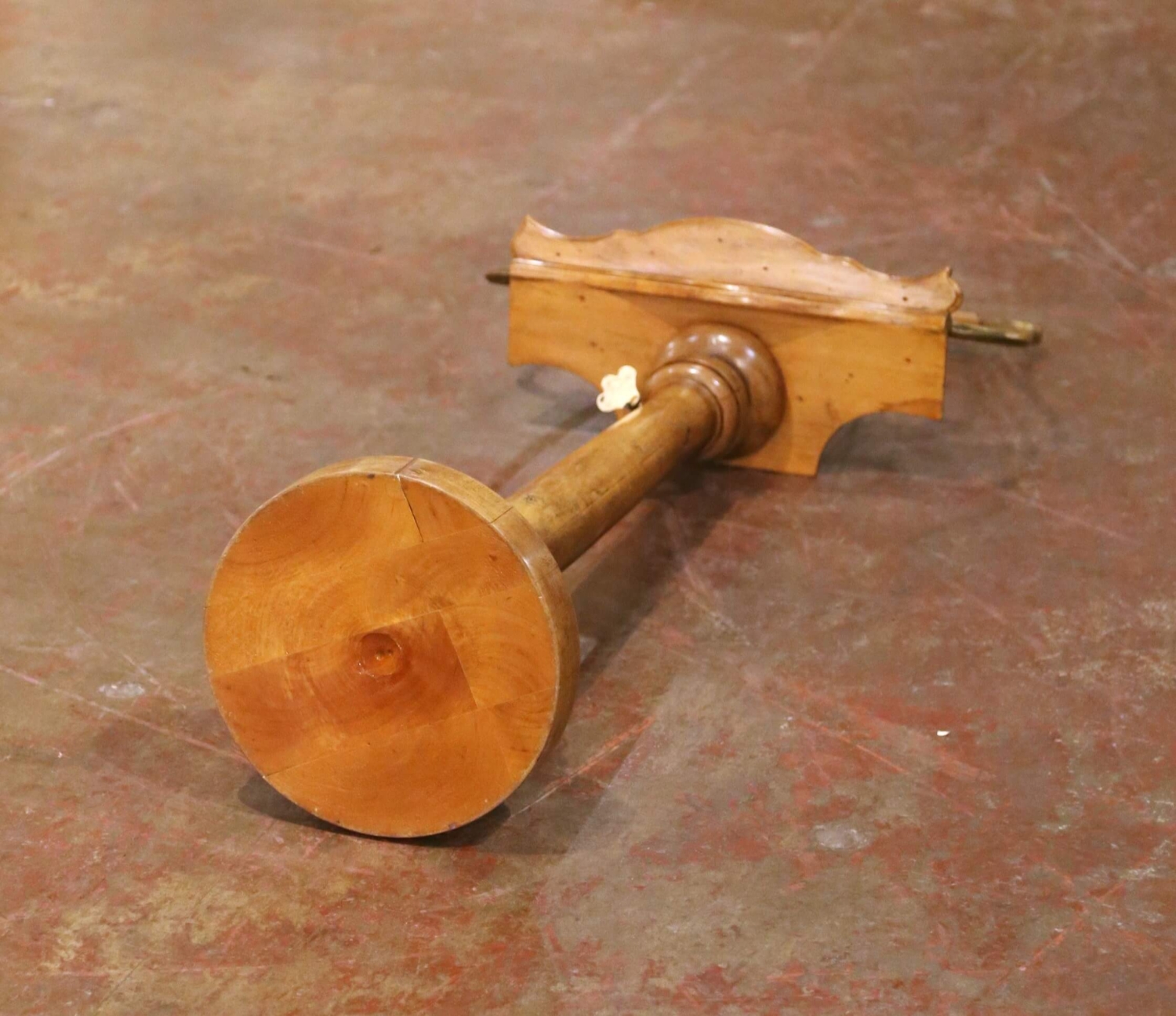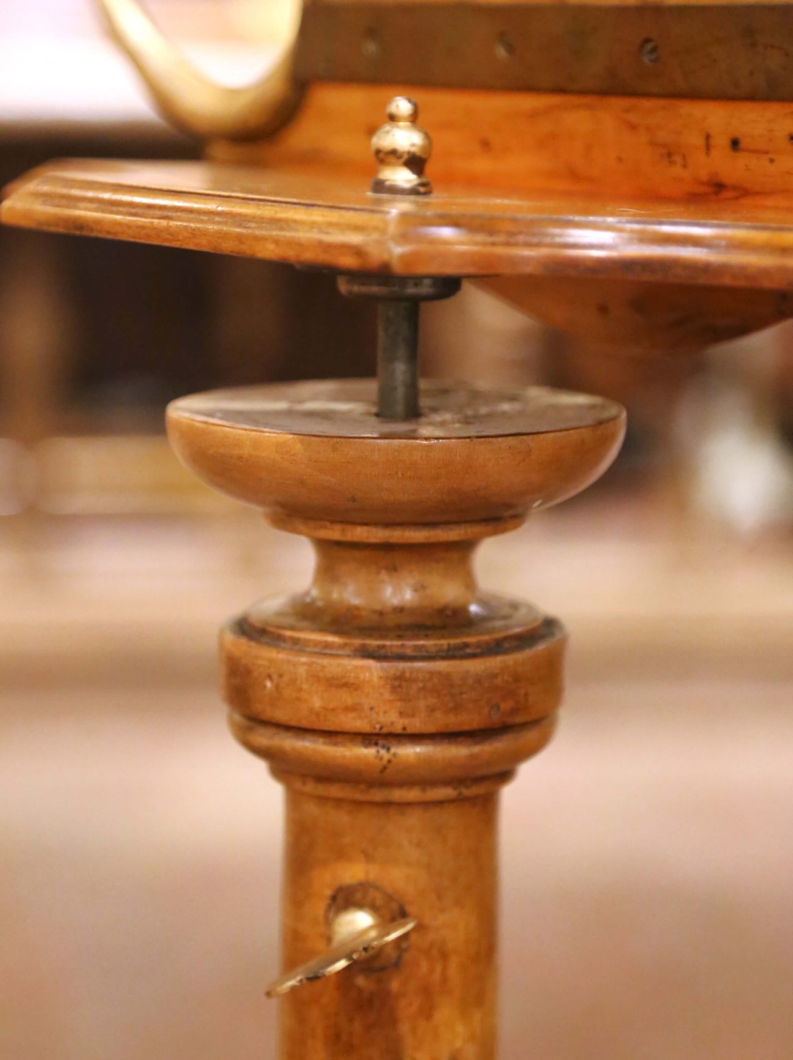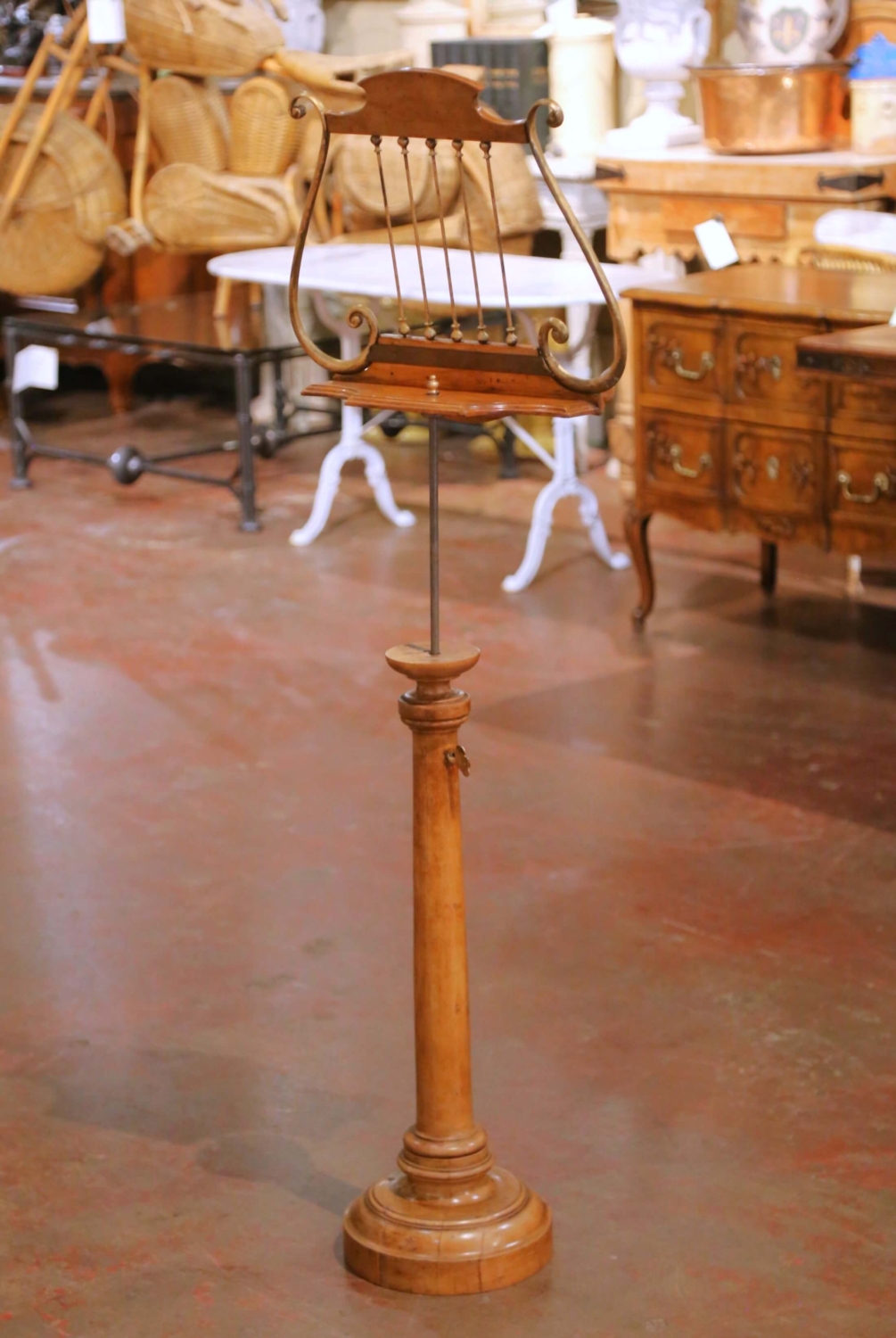 Crafted in France circa 1870, this elegant antique music stand, or lutrin, is built of solid walnut and designed in the graceful form of a classical lyre. The shaped upper crest is centered with a decorative rosette and fitted with slender brass rods framed by scrolling brass arms, creating a refined silhouette inspired by traditional musical instruments. The design reflects the decorative taste of the Napoleon III period, when classical motifs such as the lyre were widely used in furniture associated with music rooms and salons. The shaped reading ledge features a small brass peg to help secure sheet music or a book in place. The stand is mounted on a slender iron rod that allows the height to be adjustable and secured with the original brass key. The column rises from a turned walnut pedestal base and displays a warm and rich walnut patina developed over time. Both decorative and functional, this antique French music stand brings sculptural presence to a music room, library, or study while serving as an elegant display for sheet music or a large book. The piece remains in excellent antique condition commensurate with age and use. Dimensions: 17.5″W x 10″D x 45.5″H Goes all the way up to 55″H