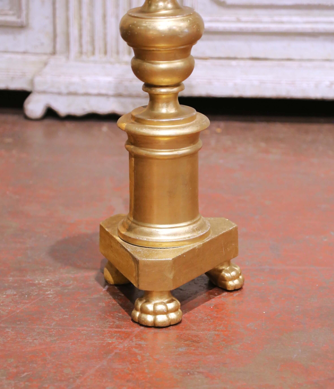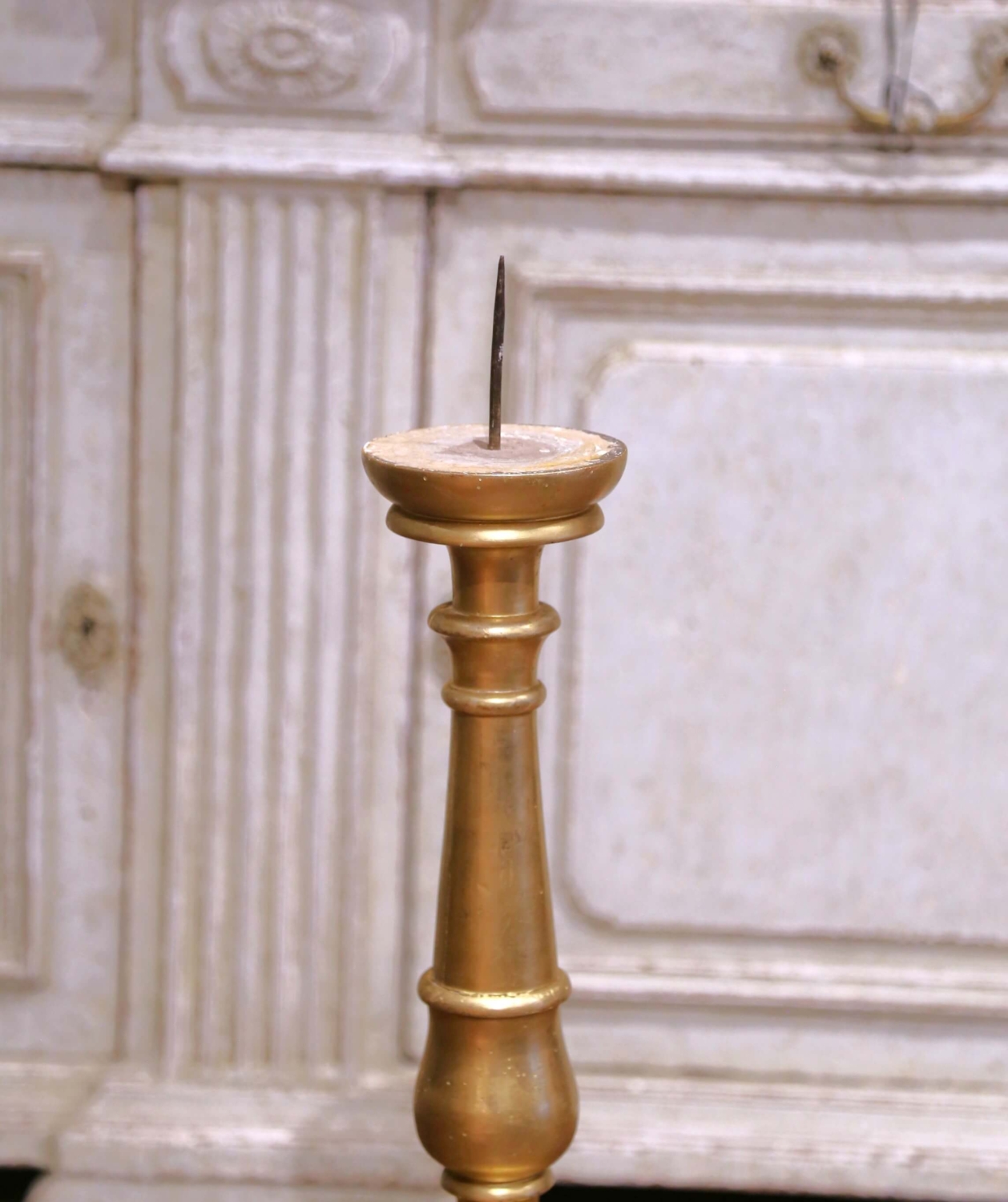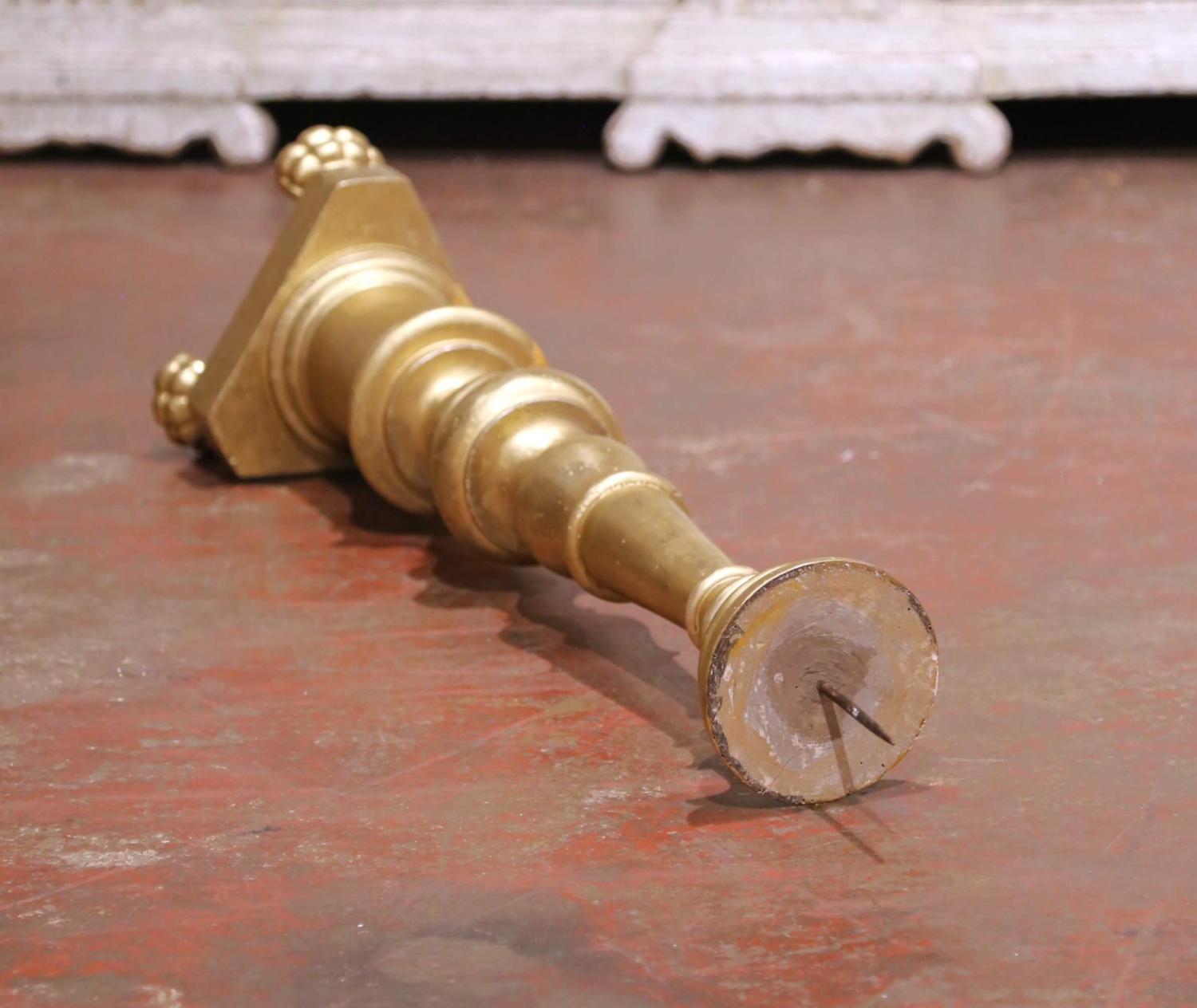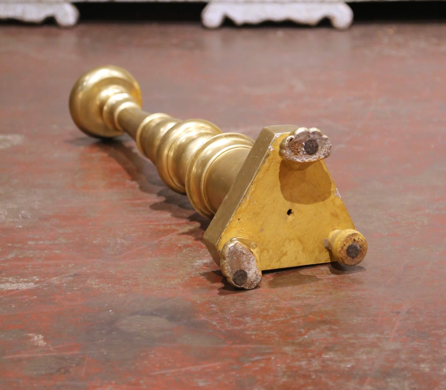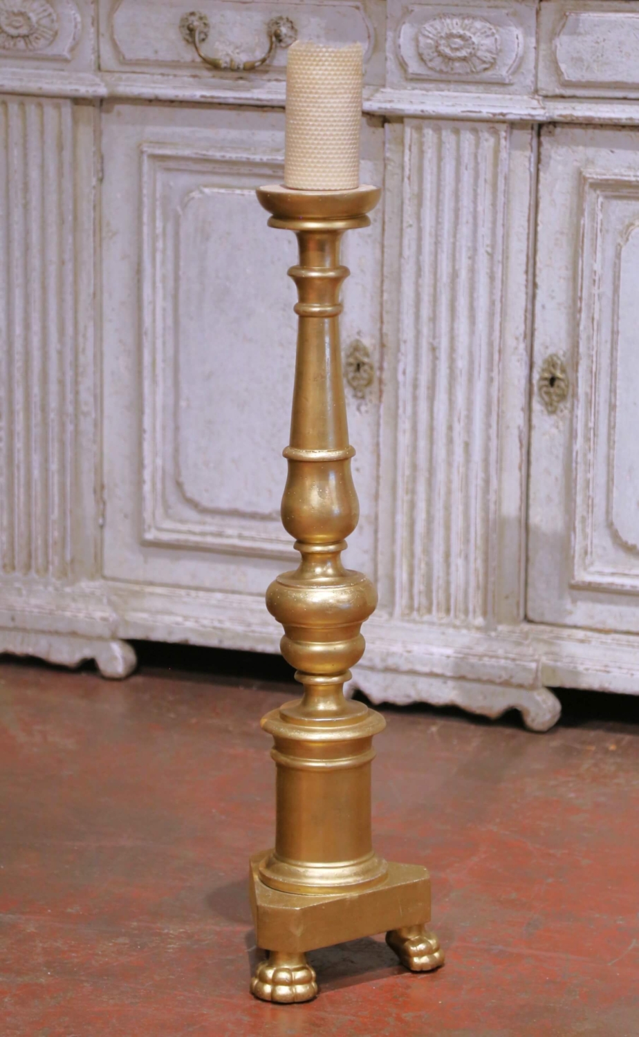 Dress a console, mantel, or vignette with this tall and sculptural Italian giltwood candlestick crafted around 1860. Executed in the Baroque style, the piece features an elegant, elongated baluster stem carved with swelling turned elements and resting on a sturdy triangular plinth. Each corner of the base is supported by boldly carved paw feet, an expressive detail commonly found in ecclesiastical furnishings of the period and one that adds both visual weight and architectural presence. The original gilt surface remains warm and luminous, with a beautifully aged patina that speaks to its long devotional history. The top is fitted with its traditional iron pricket for securing a pillar candle. With its impressive height and commanding silhouette, this 19th-century candlestick brings drama, texture, and Old World character to any interior, from Tuscan-inspired spaces to more refined European settings. In excellent condition commensurate with age and use, retaining the rich depth of its antique gilt finish. Dimensions: 8.5″ W x 8.5″ D x 35″ H.