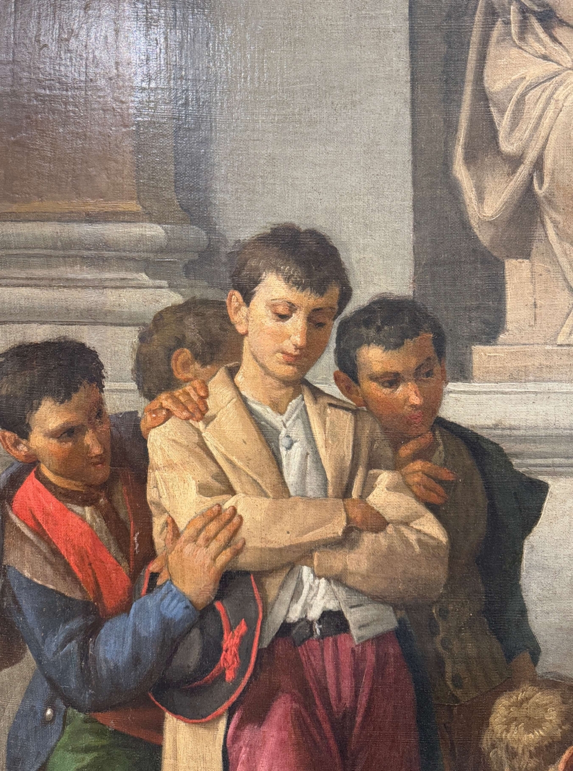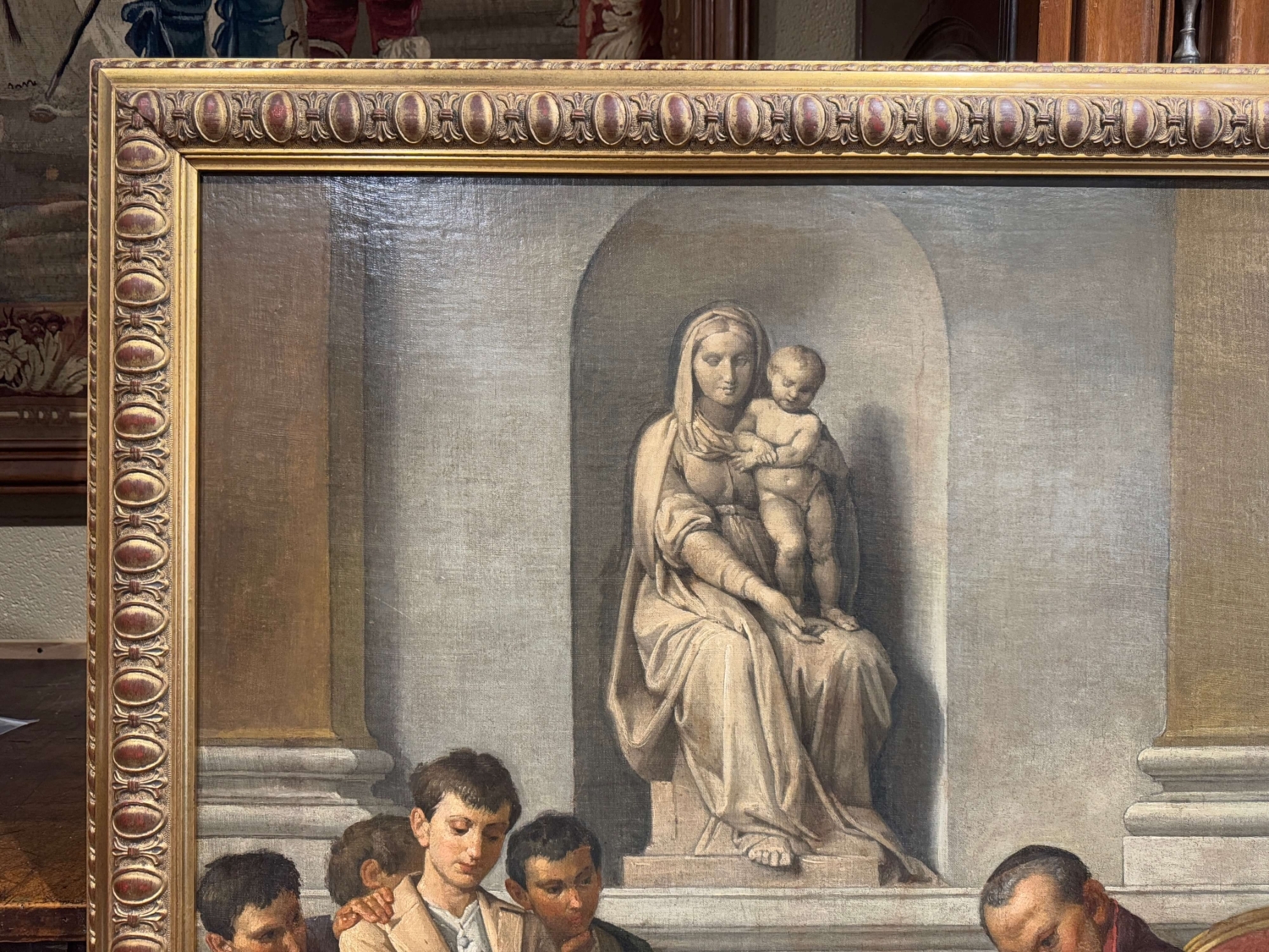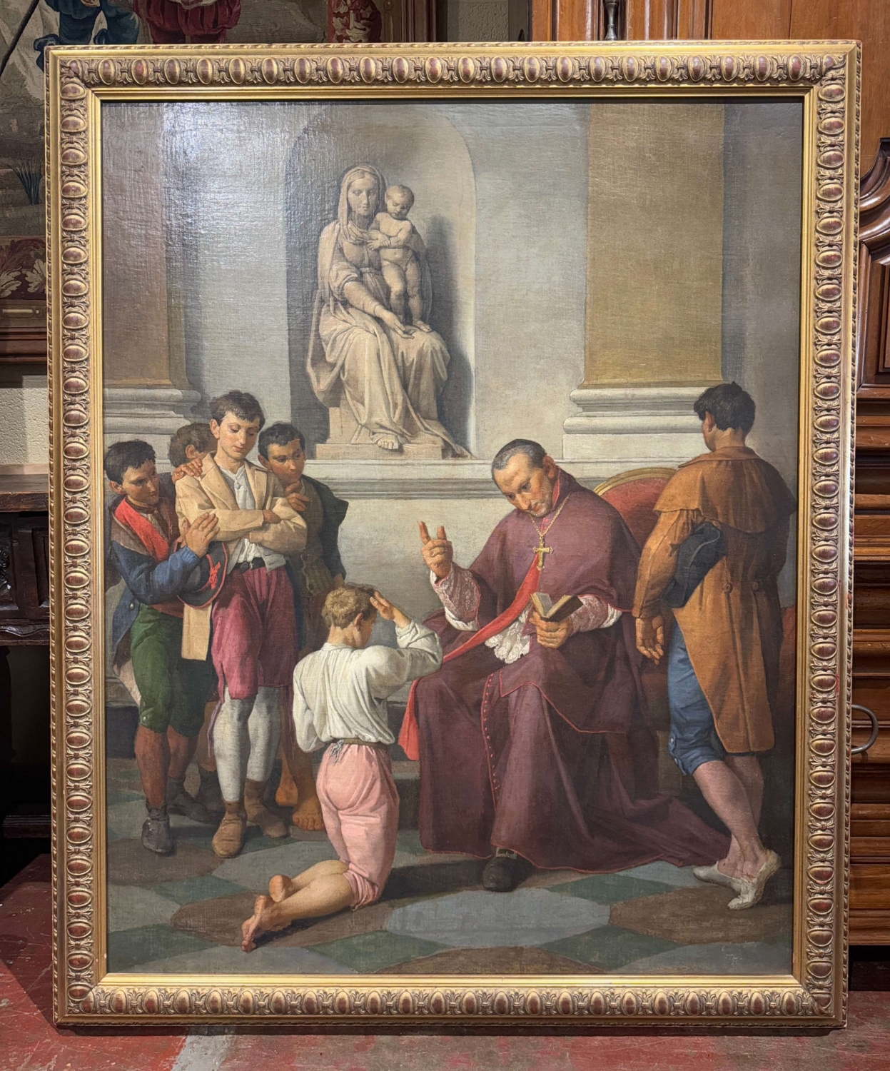 Decorate an office or study with this large antique oil on canvas and wood painting. Created in Italy circa 1890, and almost 5 feet in height, the artwork is set in an ornate gilt wood frame. The painting depicts a sacred and intimate moment of religious significance. At the center, a cardinal, distinguished by his red ecclesiastical robes and gold pectoral cross, is seated on an ornate chair. He raises his right hand in a gesture of blessing and absolution, offering spiritual forgiveness and guidance to a kneeling boy before him. The boy, dressed in soft, pale clothing, performs the Sign of the Cross with reverence, touching his forehead in the traditional invocation. To the left, a group of young men attentively observe the solemn exchange, their expressions reflecting piety, curiosity, and respect. Their colorful garments and detailed features highlight their individuality and add life to the scene. To the right, a figure in a brown cloak stands contemplatively, his back partially turned as though offering space for the sacred act. The setting is enriched by classical architecture, with towering stone columns and a central niche housing a statue of the Virgin Mary holding the Christ Child. This prominent sculpture serves as a visual anchor, emphasizing the divine presence in the scene. The composition masterfully balances spiritual devotion with artistic naturalism, employing soft lighting and rich textures to create a sense of solemnity, grace, and timeless beauty. The important painting is in excellent condition commensurate with age and use, and adorns wonderful and vivid colors. 46.5″W x 57″H