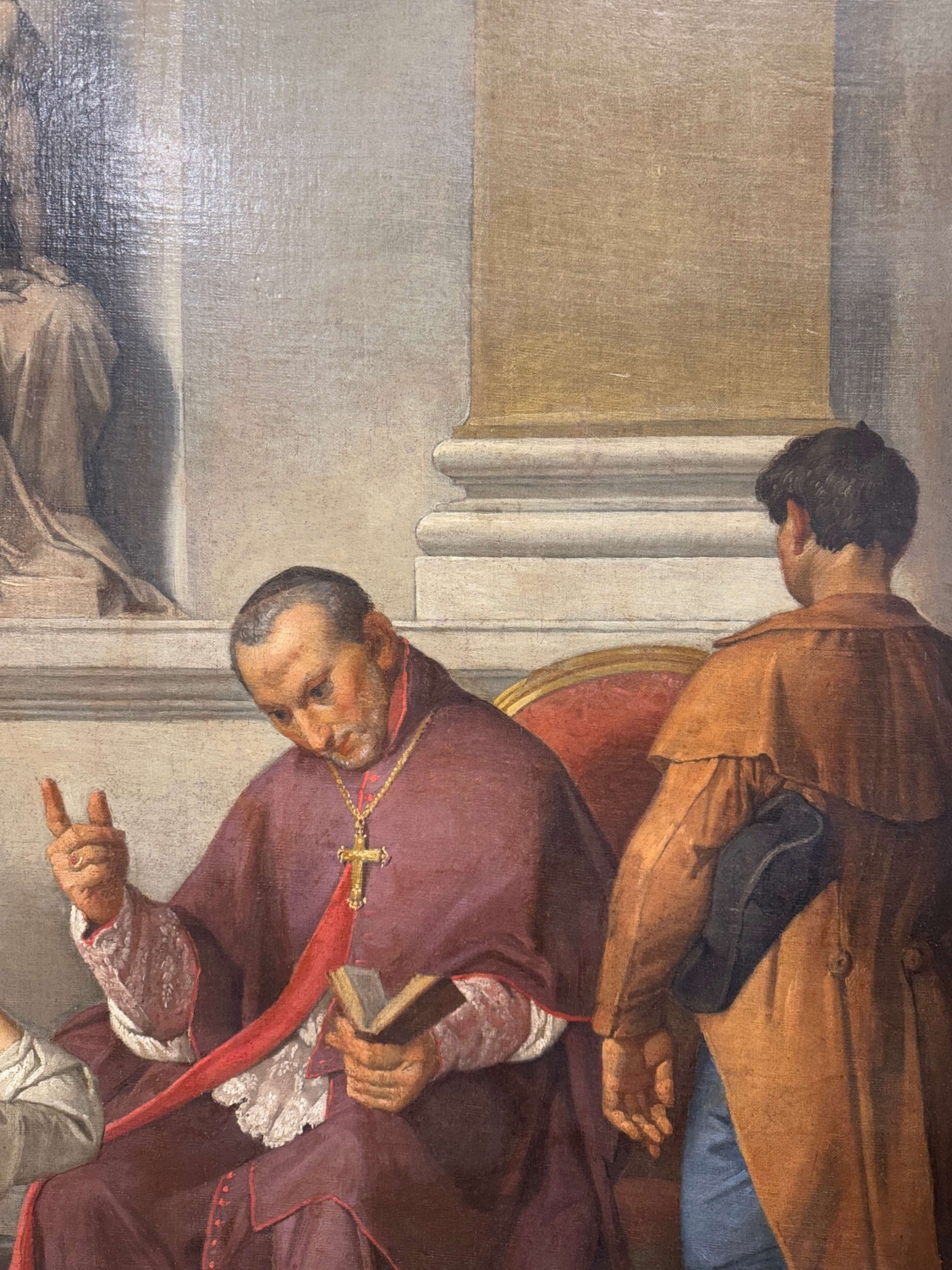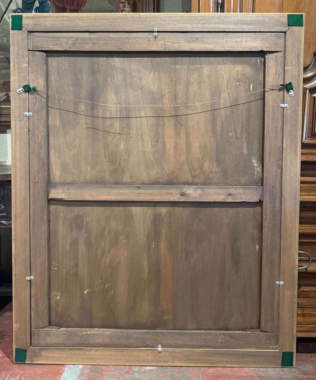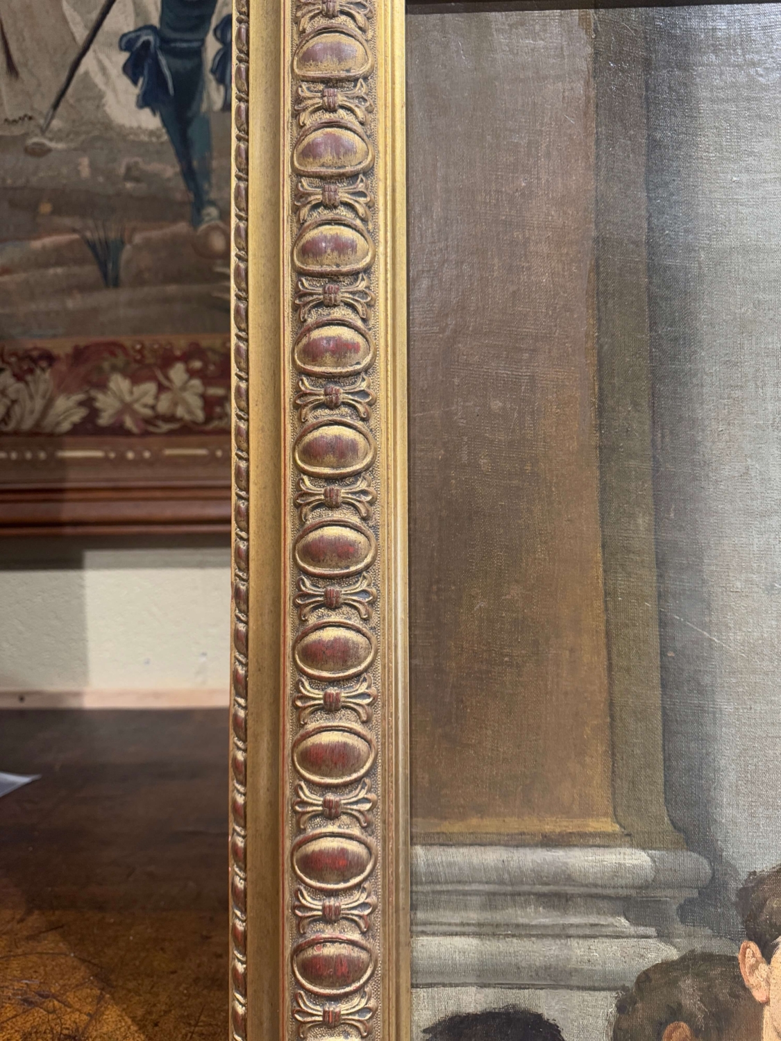 Decorate an office or study with this large antique oil on canvas and wood painting. Created in Italy circa 1890, and almost 5 feet in height, the artwork is set in an ornate gilt wood frame. The painting depicts a sacred and intimate moment of religious significance. At the center, a cardinal, distinguished by his red ecclesiastical robes and gold pectoral cross, is seated on an ornate chair. He raises his right hand in a gesture of blessing and absolution, offering spiritual forgiveness and guidance to a kneeling boy before him. The boy, dressed in soft, pale clothing, performs the Sign of the Cross with reverence, touching his forehead in the traditional invocation. To the left, a group of young men attentively observe the solemn exchange, their expressions reflecting piety, curiosity, and respect. Their colorful garments and detailed features highlight their individuality and add life to the scene. To the right, a figure in a brown cloak stands contemplatively, his back partially turned as though offering space for the sacred act. The setting is enriched by classical architecture, with towering stone columns and a central niche housing a statue of the Virgin Mary holding the Christ Child. This prominent sculpture serves as a visual anchor, emphasizing the divine presence in the scene. The composition masterfully balances spiritual devotion with artistic naturalism, employing soft lighting and rich textures to create a sense of solemnity, grace, and timeless beauty. The important painting is in excellent condition commensurate with age and use, and adorns wonderful and vivid colors. 46.5″W x 57″H