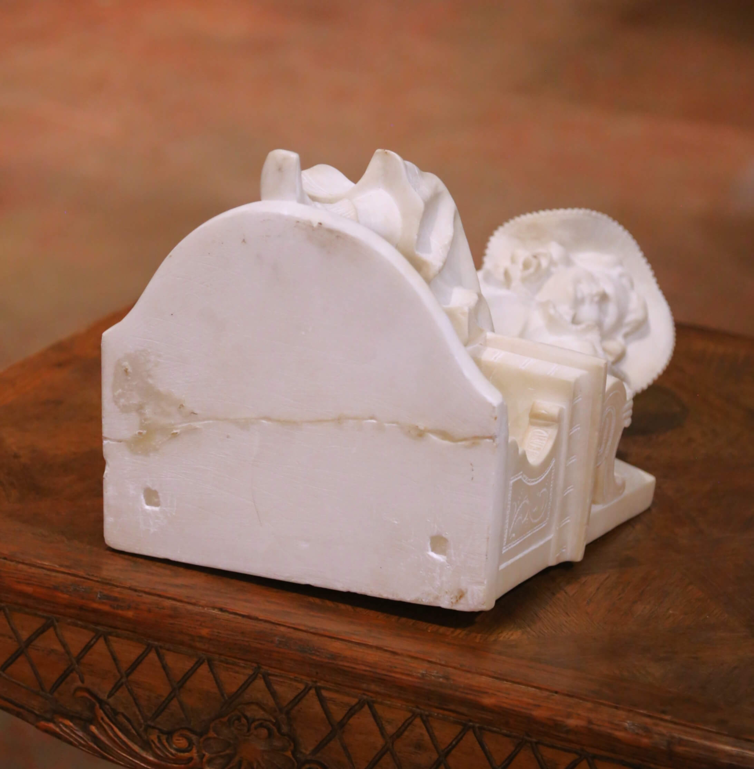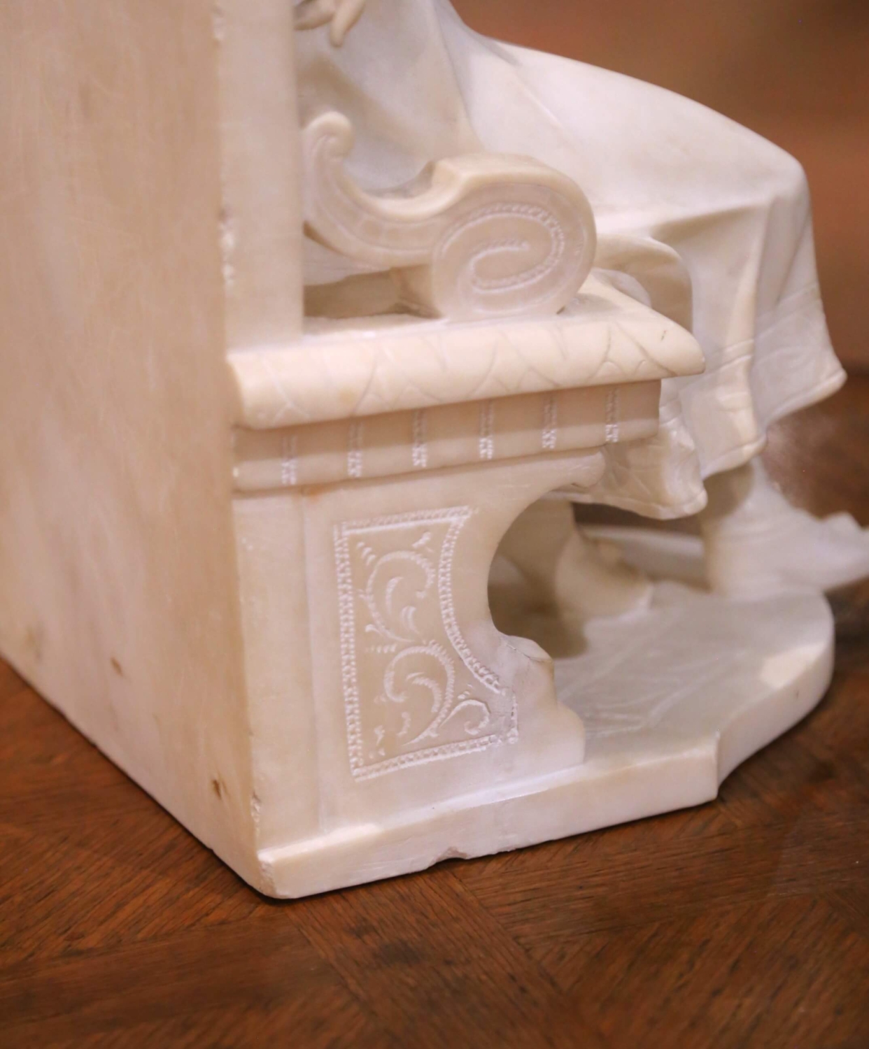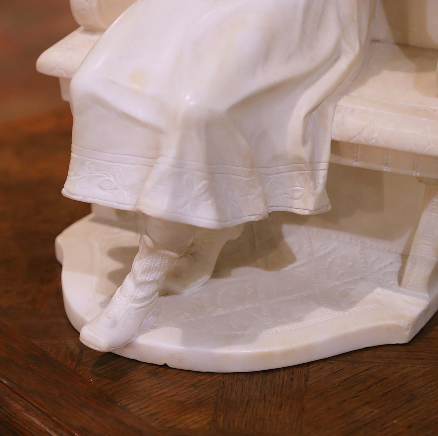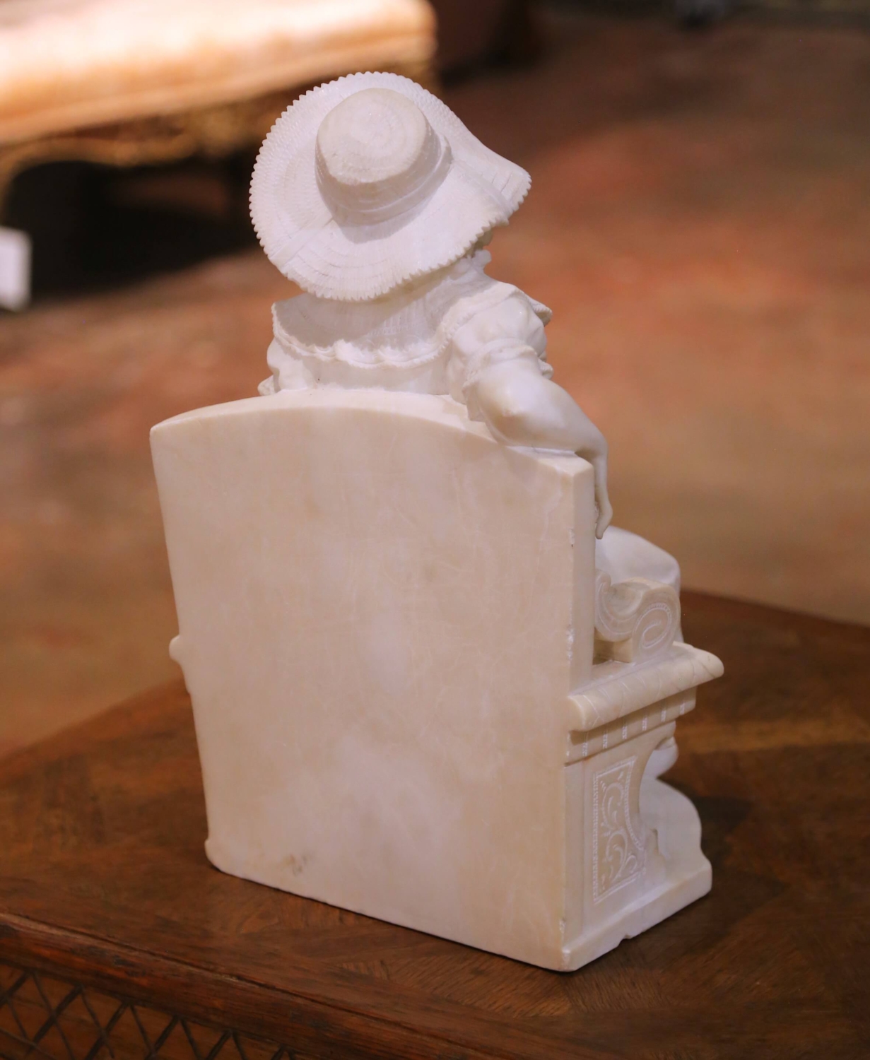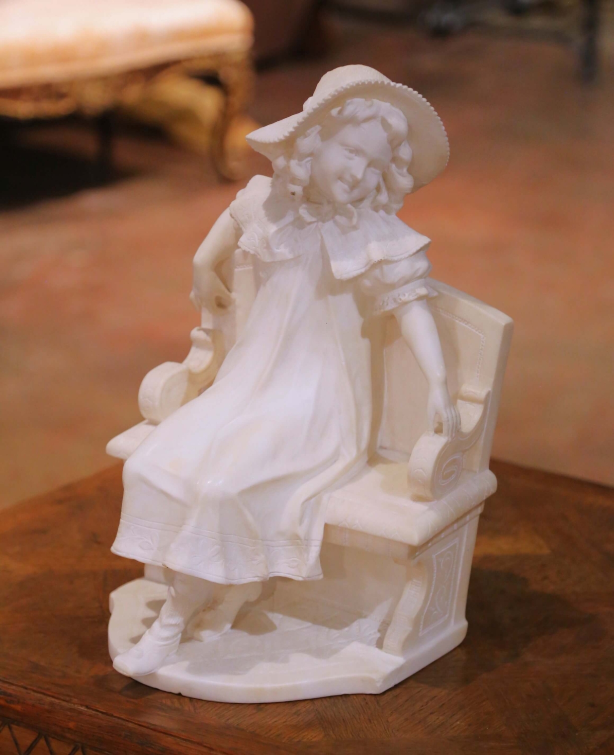 This elegant antique marble sculpture depicts a young girl seated gracefully on a carved bench, dressed in a flowing gown and wide textured bonnet. Executed in Italy circa 1890, the figure reflects the romantic naturalism and refined sentiment associated with late 19th century Florentine carving, in the manner of Emilio Fiaschi. The finely carved details highlight her softly curled hair, gentle expression, delicately incised lace collar, and the crisp woven texture of the bonnet. Her relaxed pose, with one arm draped over the scrolling bench arm and the other resting naturally at her side, conveys innocence and charm. The bench features carved scroll arms and decorative motifs, resting on an integral shaped base. Carved in solid white marble, the sculpture displays subtle natural veining and a luminous surface. The weight and density confirm the quality of the stone, while the crisp edges and refined detailing demonstrate skilled craftsmanship typical of Florentine workshops of the period. Emilio Fiaschi, active in Florence in the late 19th century, was celebrated for his romantic genre figures of young women and children. His workshop produced highly detailed marble sculptures that were widely exported to Europe and America, influencing a generation of Florentine artisans. The piece is in excellent antique condition commensurate with age and use. Dimensions: 11.5″W x 10.5″D x 18″H.