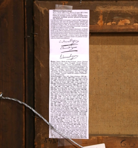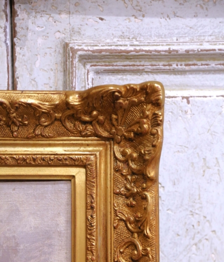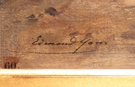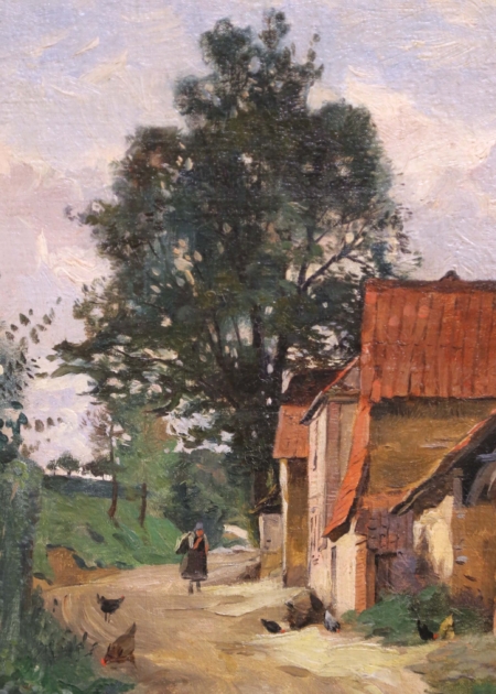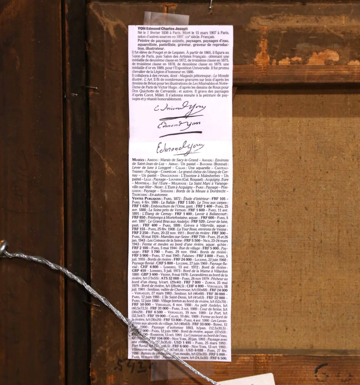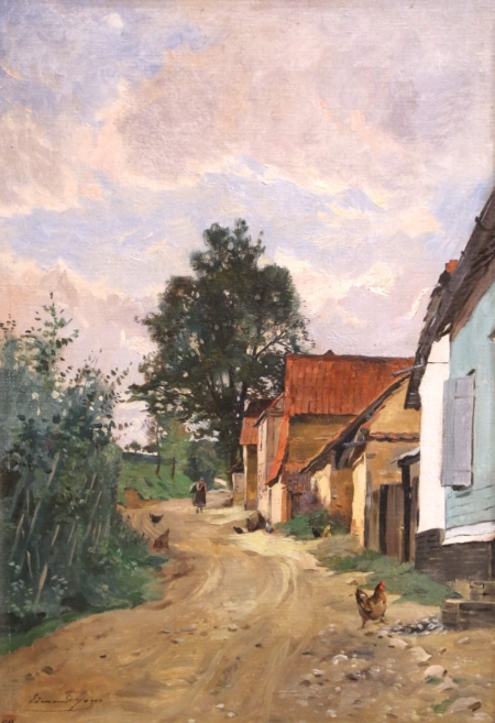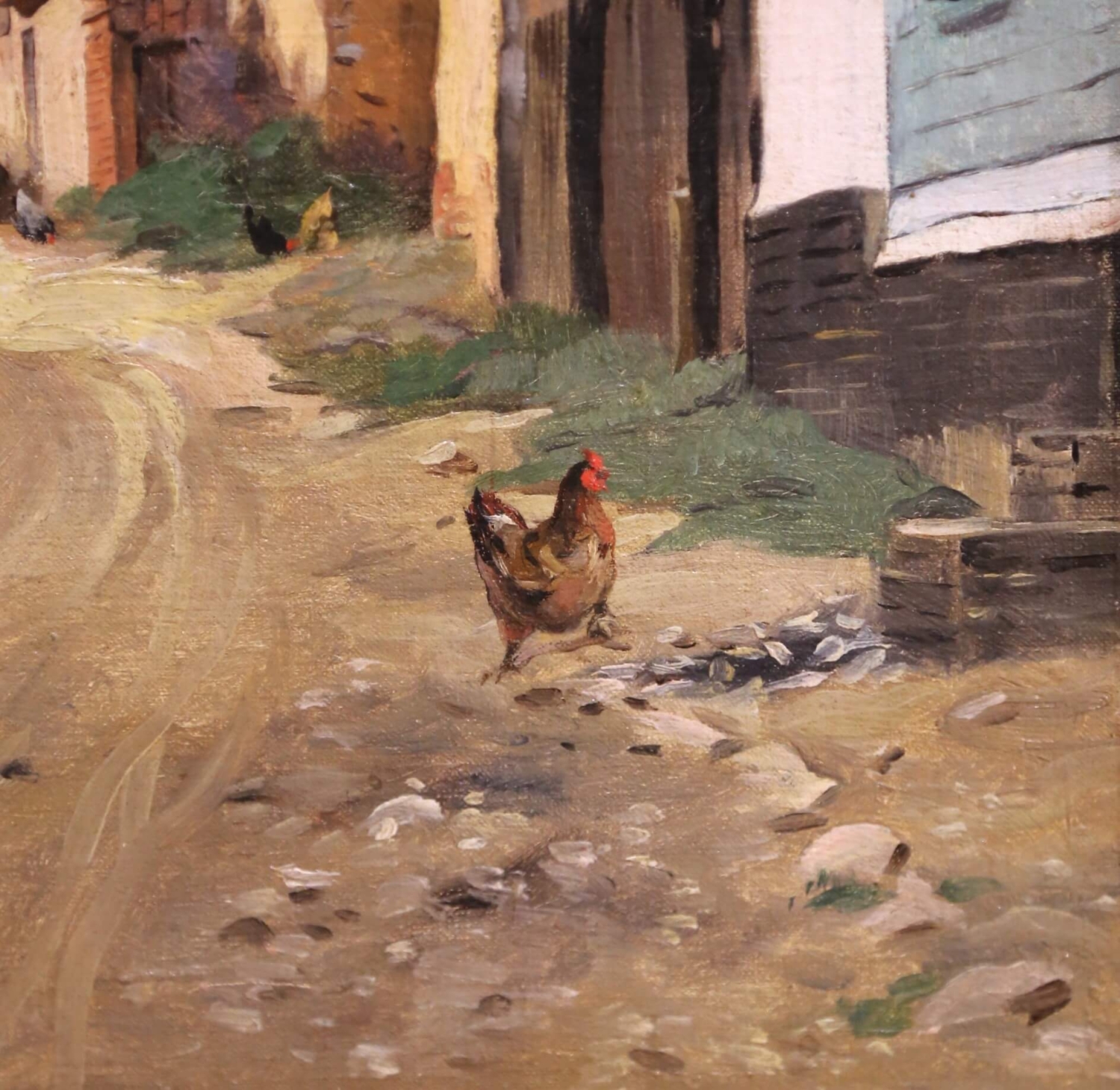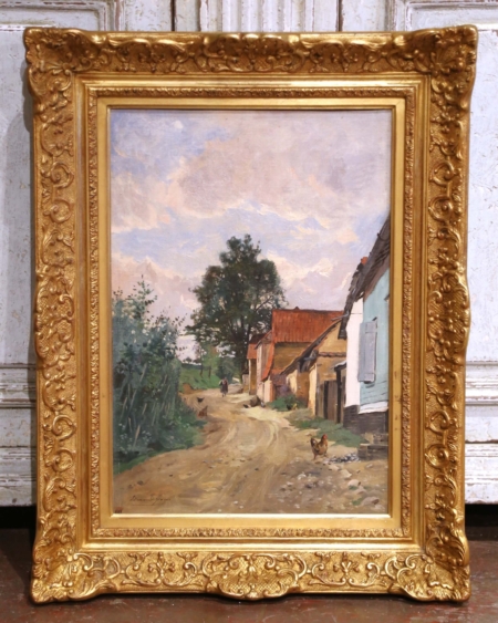 Painted by French artist Edmond Charles Joseph Yon (1836–1897), this evocative landscape titled “Paysanne sur un chemin” (“Peasant Woman on a Path”), beautifully captures the quiet poetry of rural France. Executed in oil on canvas, the composition depicts a tranquil country lane bordered by rustic cottages, where a lone peasant woman walks beneath a pastel sky as chickens forage nearby. Yon’s deft brushwork and refined palette lend warmth and immediacy to the scene, balancing natural realism with lyrical atmosphere. The work is signed lower left and presented in its original richly carved giltwood frame. Born in Paris, Yon studied under Pouget and Lequien before debuting at the Salon des Artistes Français in 1865, where he received numerous medals, including third class in 1872, second class in 1875, and a silver medal in 1889. Influenced by the Barbizon School, Yon became celebrated for his serene views of wooded paths, riverbanks, and sunlit clearings, painted with remarkable sensitivity to light and texture. A skilled engraver and illustrator as well, he contributed to Le Monde Illustré and Magasin Pittoresque, and was named Chevalier of the Légion d’Honneur in 1886. Yon’s works are represented in major museum collections, including Amiens, Lille, Rouen, and the Musée d’Orsay in Paris, as well as in Antwerp and Liège. Listed in the Benezit Dictionary of Artists, his paintings continue to be prized for their harmonious blend of natural truth and poetic charm. This fine example remains in excellent condition commensurate with age, retaining its original frame and rich, luminous tones. Measures: 27.25″ H × 21″ W