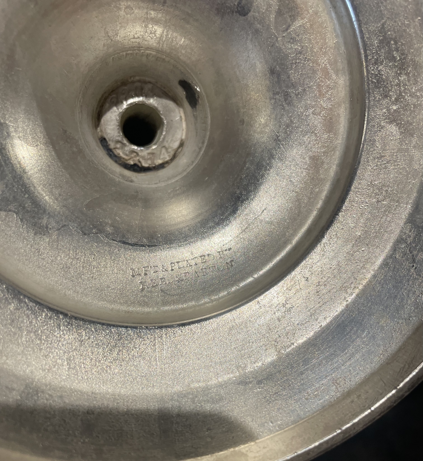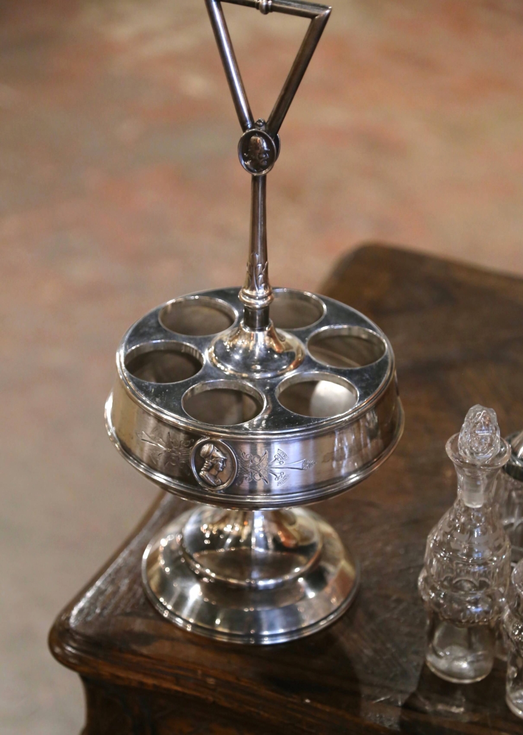 Enhance a dining table or sideboard with this elegant six-bottle cruet set, made by Reed & Barton, circa 1880. The silver-plated rotating stand rests on a circular pedestal base and is richly decorated with neoclassical motifs, including medallion profiles of helmeted figures framed by scrolling designs. The triangular handle provides a graceful silhouette and allows the frame to easily be carried for service. The set includes six crystal vessels, each etched with delicate floral and foliate motifs: two bottles with stoppers for oil and vinegar, three shakers with pierced silver lids for salt and pepper or other spices, and one lidded vessel with a hinged top and slot for a spoon, likely for sugar. Each bottle fits securely into its holder, and the stand rotates smoothly, remaining in excellent condition commensurate with age and use. Founded in 1824 in Taunton, Massachusetts, Reed & Barton became one of America’s premier silver manufacturers, celebrated for their finely detailed silver and silver-plated wares. Their pieces, often reflecting popular 19th-century neoclassical and revival styles, were known for exceptional craftsmanship and even chosen for use at the White House. Today, Reed & Barton creations remain highly collectible for their quality and design heritage. Measures: 8″ Diameter x 16.5″ H