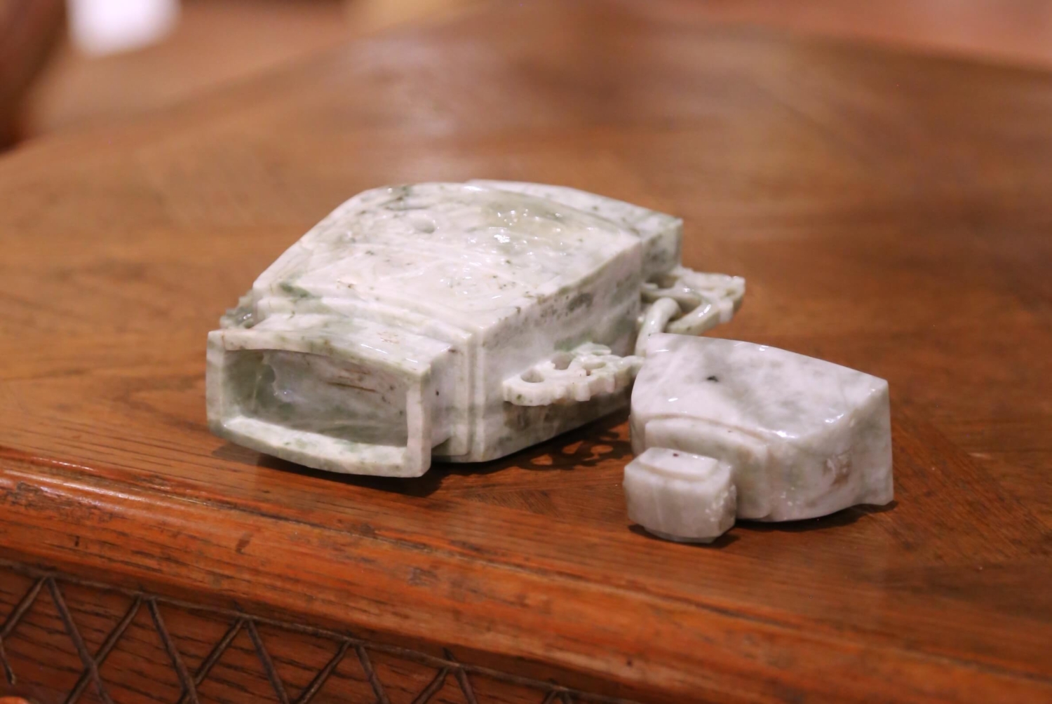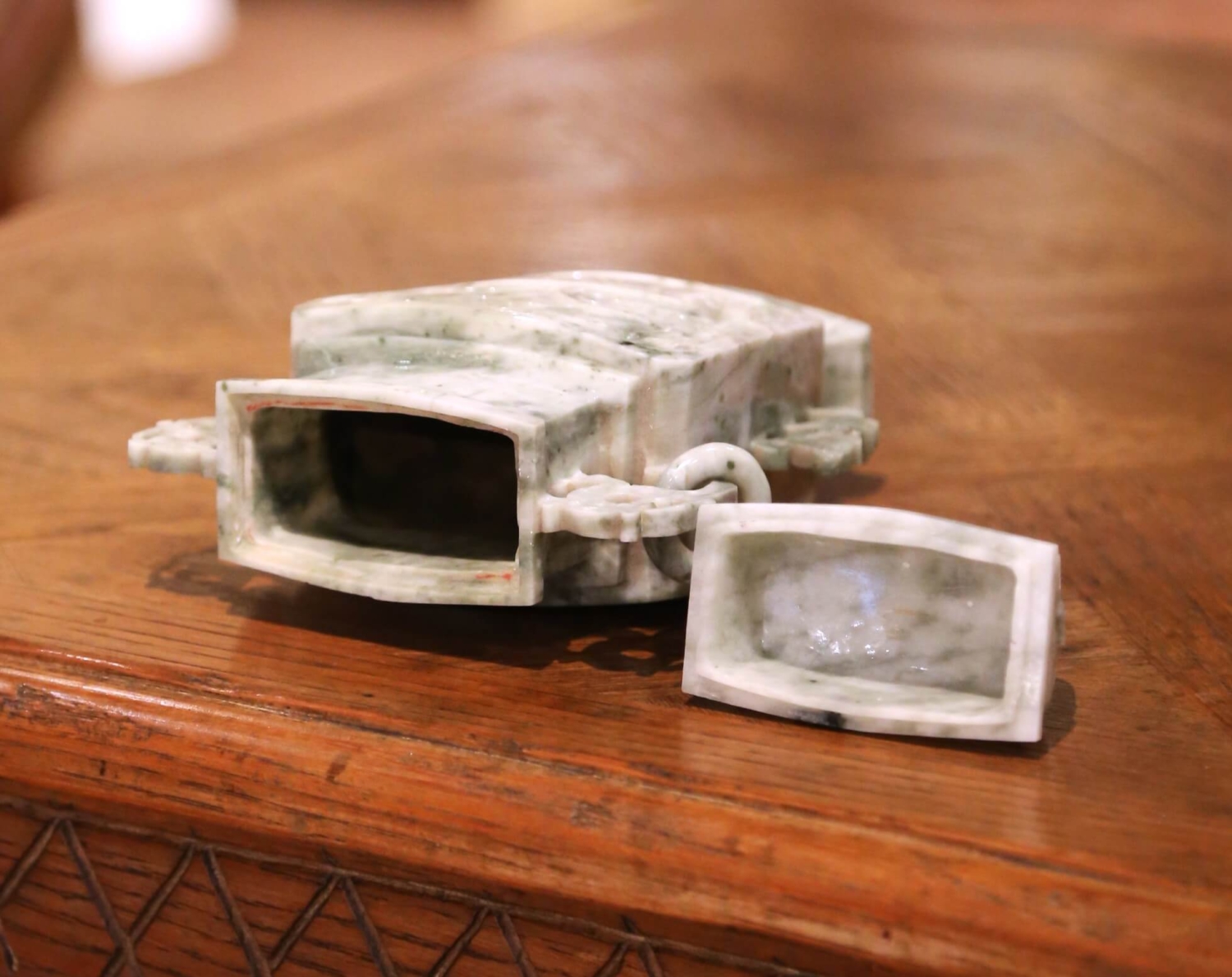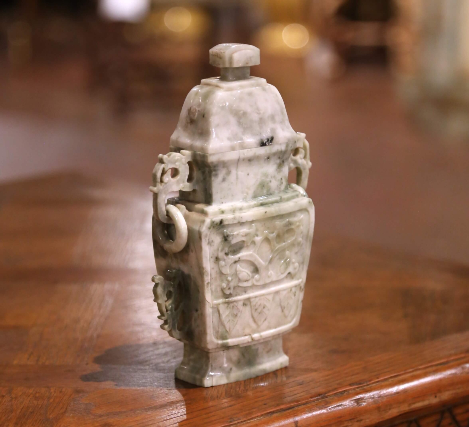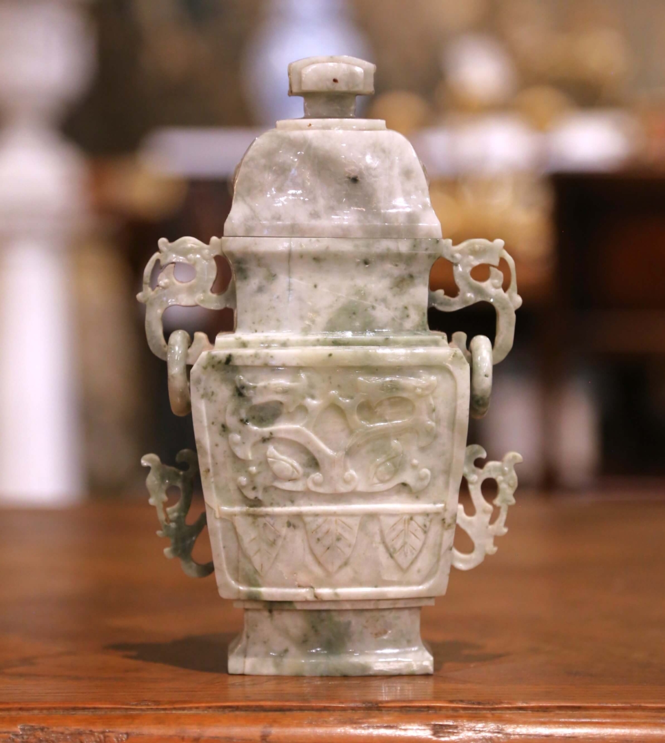 Bring refinement and sculptural elegance to a console, étagère, or writing desk with this beautifully carved vintage Chinese covered vase, crafted circa 1940–1960 from soft celadon-green jade. The vessel is fashioned in a traditional baluster form, rising from a stepped rectangular foot and topped with a fitted lid carved from the same stone. The translucent jade displays natural variegation throughout, with cloudlike swirls of pale green, grey, and white that accentuate the piece’s organic beauty. Both sides of the vase feature raised low-relief decoration, stylized mythical creatures above a band of carved leaf motifs, executed with graceful lines and gentle modeling. The sculptural side handles are particularly notable: each is carved with openwork scrolls terminating in loose rings, all meticulously carved from a single block of jade, a hallmark of skilled craftsmanship. The interior is hollowed cleanly, allowing the piece to function as both an ornamental object and a symbolic covered urn in the Chinese tradition. This elegant antique-inspired vessel is in very good condition commensurate with age and use, with natural inclusions and subtle surface irregularities characteristic of hand-carved stone. An exquisite decorative accent, it brings serene tone, symmetry, and timeless Asian artistry to any interior. Dimensions: 5.5″ W x 2.25″ D x 8.5″ H.