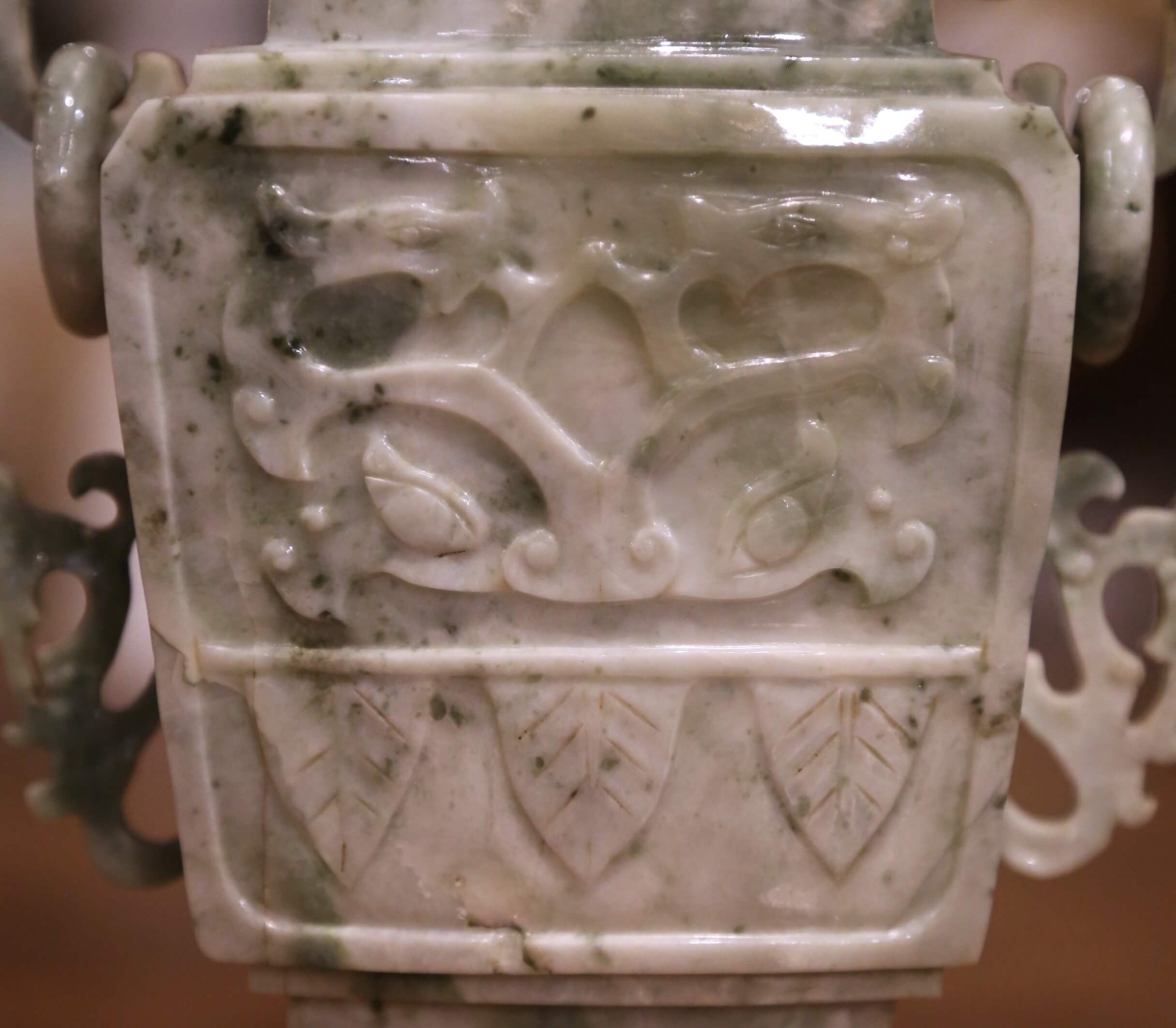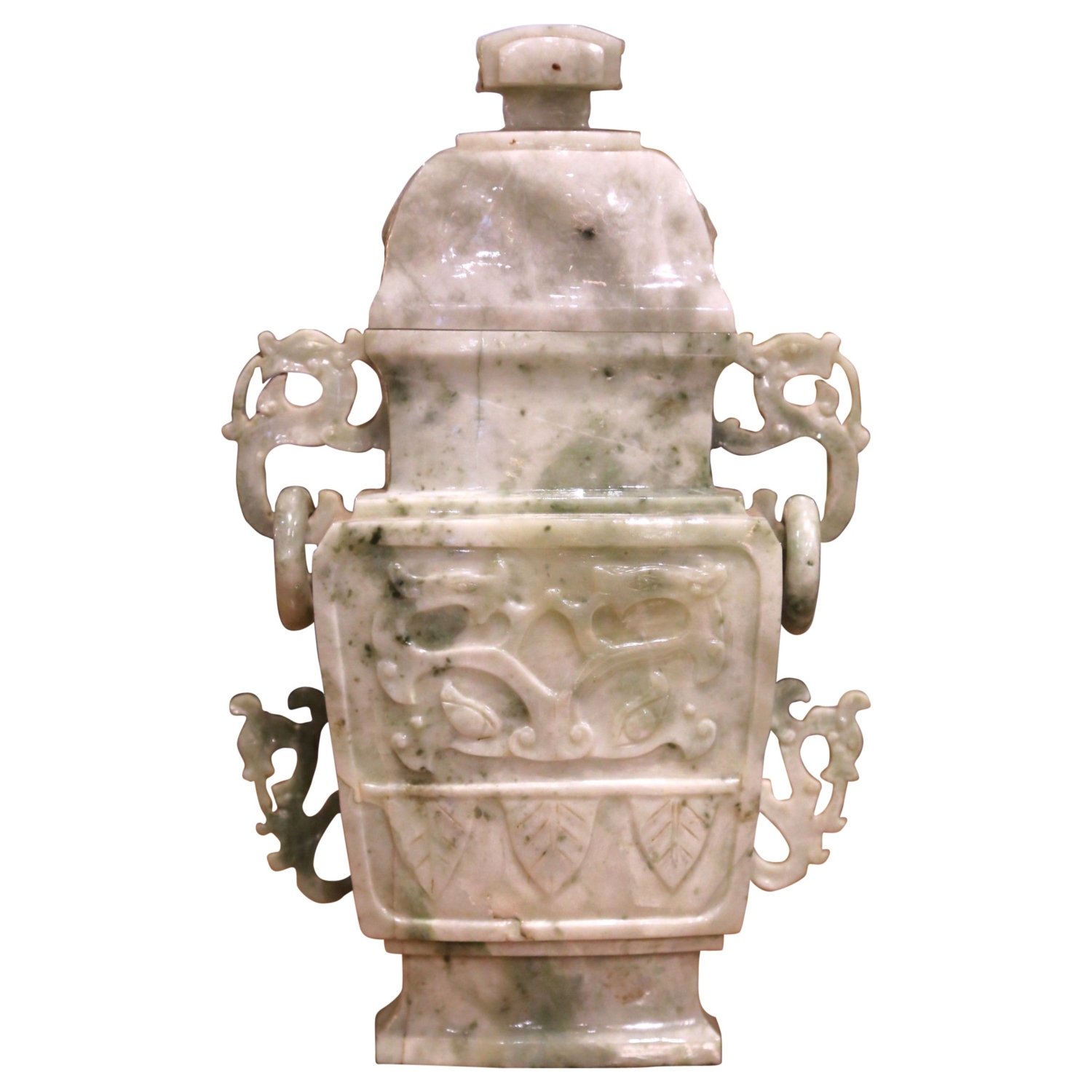 20th Century Chinese Carved Jade Covered Vase with Pierced Handles