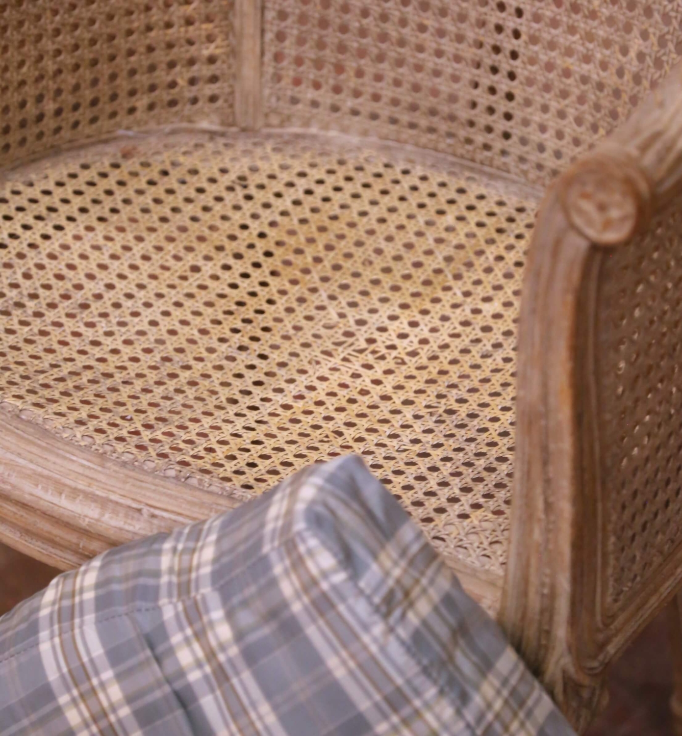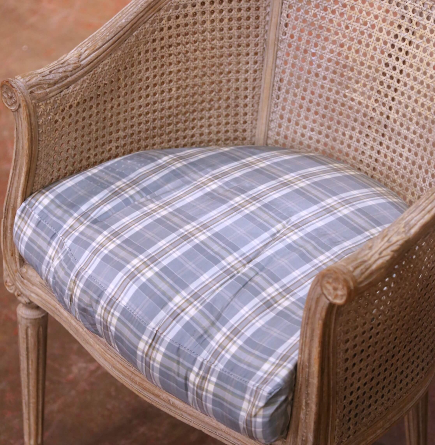 This elegant Louis XVI–style vanity chair dates to the late 20th century and is inspired by classic antique French seating models of the 18th century. The carved wood frame features refined neoclassical lines with a gently curved barrel back, fluted legs, and subtle carved detailing at the joints, all hallmarks of the Louis XVI aesthetic. The chair retains a softly painted finish with light tonal variation that enhances the crisp carving without overpowering the form. Cane panels wrap the back and sides, adding texture and visual lightness while maintaining an architectural silhouette. A custom loose seat cushion, tailored in a muted plaid fabric, provides comfort and contrast against the painted frame and woven cane. Graceful and well proportioned, this chair is ideal for use at a vanity, dressing table, or as an accent piece in a bedroom or bath, blending easily into traditional, European country, or transitional interiors. The chair is in excellent condition commensurate with age and use. Dimensions: 22.5″W x 21″D x 31″H Seat Height: 20″H