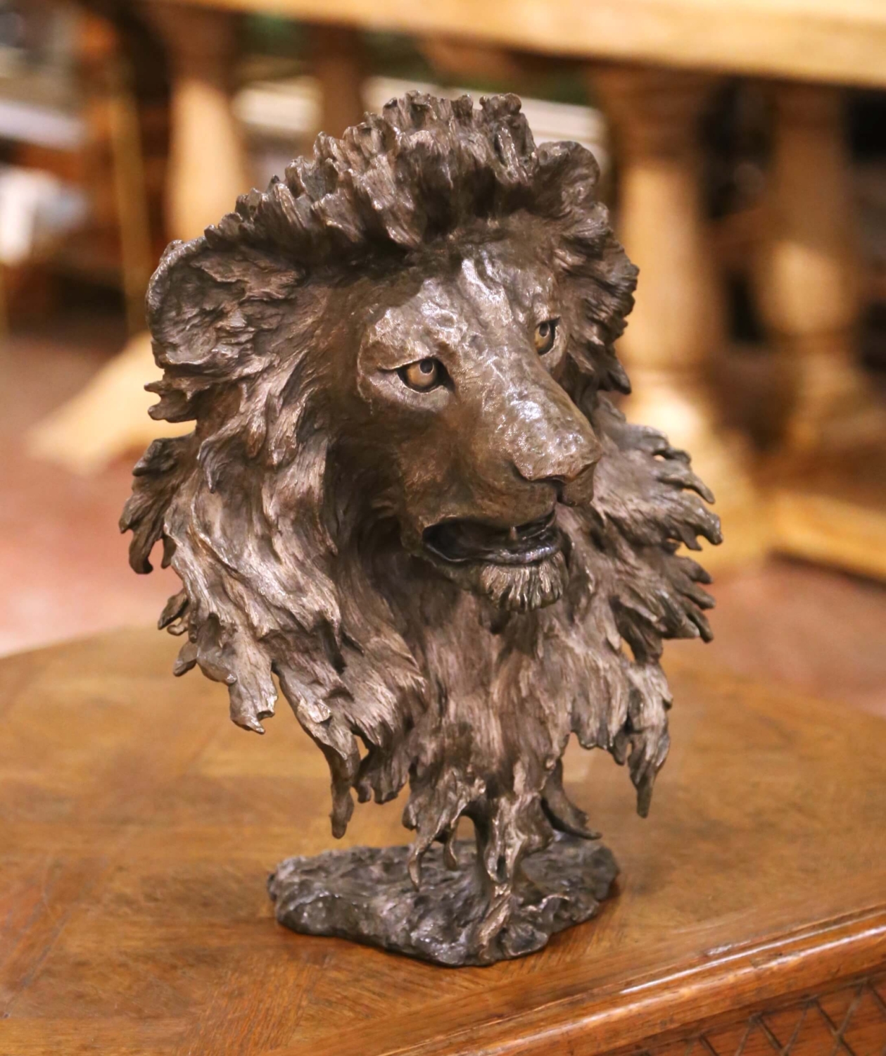 This powerful bronze lion sculpture by Mark Hopkins exemplifies the artist’s celebrated approach to animal sculpture, combining naturalistic observation with a strong sense of presence and quiet authority. The lion is depicted at rest yet alert, its muscular body grounded and compact, with carefully modeled anatomy and a finely textured mane that conveys both weight and vitality. The restrained pose emphasizes strength through stillness rather than movement, a hallmark of Hopkins’ work. Cast in bronze and finished with a rich, dark patina, the surface displays subtle tonal variations that enhance the sculptural depth and highlight the detailed modeling throughout. The piece is signed by the artist and numbered 228 from an edition of 750, and is dated 1994, placing it within Hopkins’ mature period, when his animal subjects achieved wide recognition among collectors of contemporary wildlife sculpture. The sculpture is in excellent condition commensurate with age and use. Elegant yet commanding, this bronze lion makes a striking decorative statement on a console, pedestal, or bookshelf, and appeals equally to collectors of modern bronze sculpture and those seeking a timeless animal form with classical resonance. Dimensions: 13″W x 7″D x 15.25″H Weight: 33 pounds