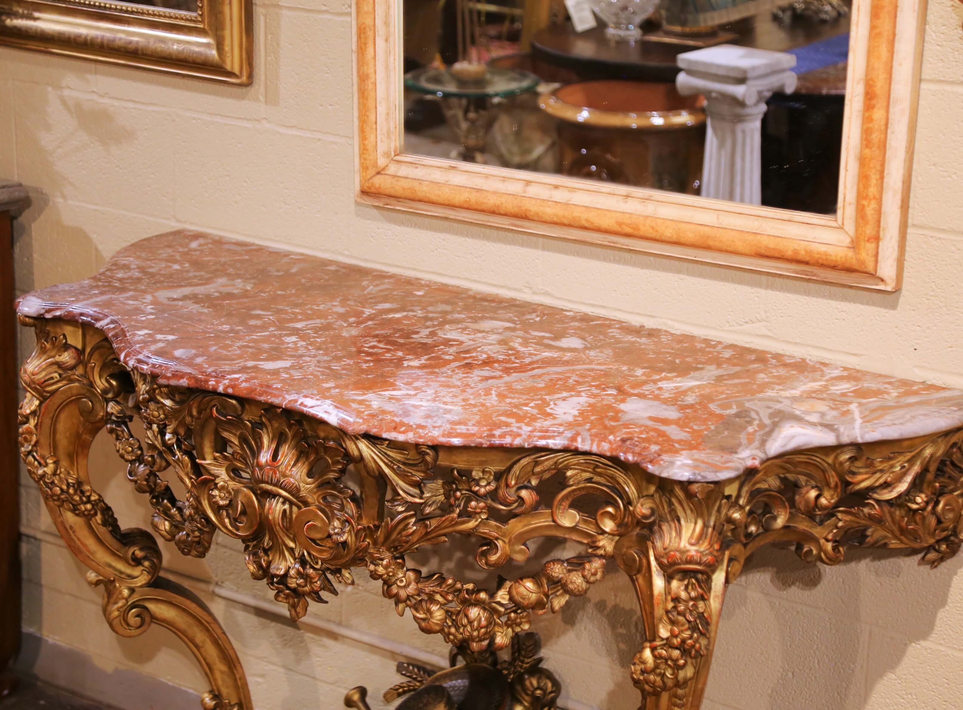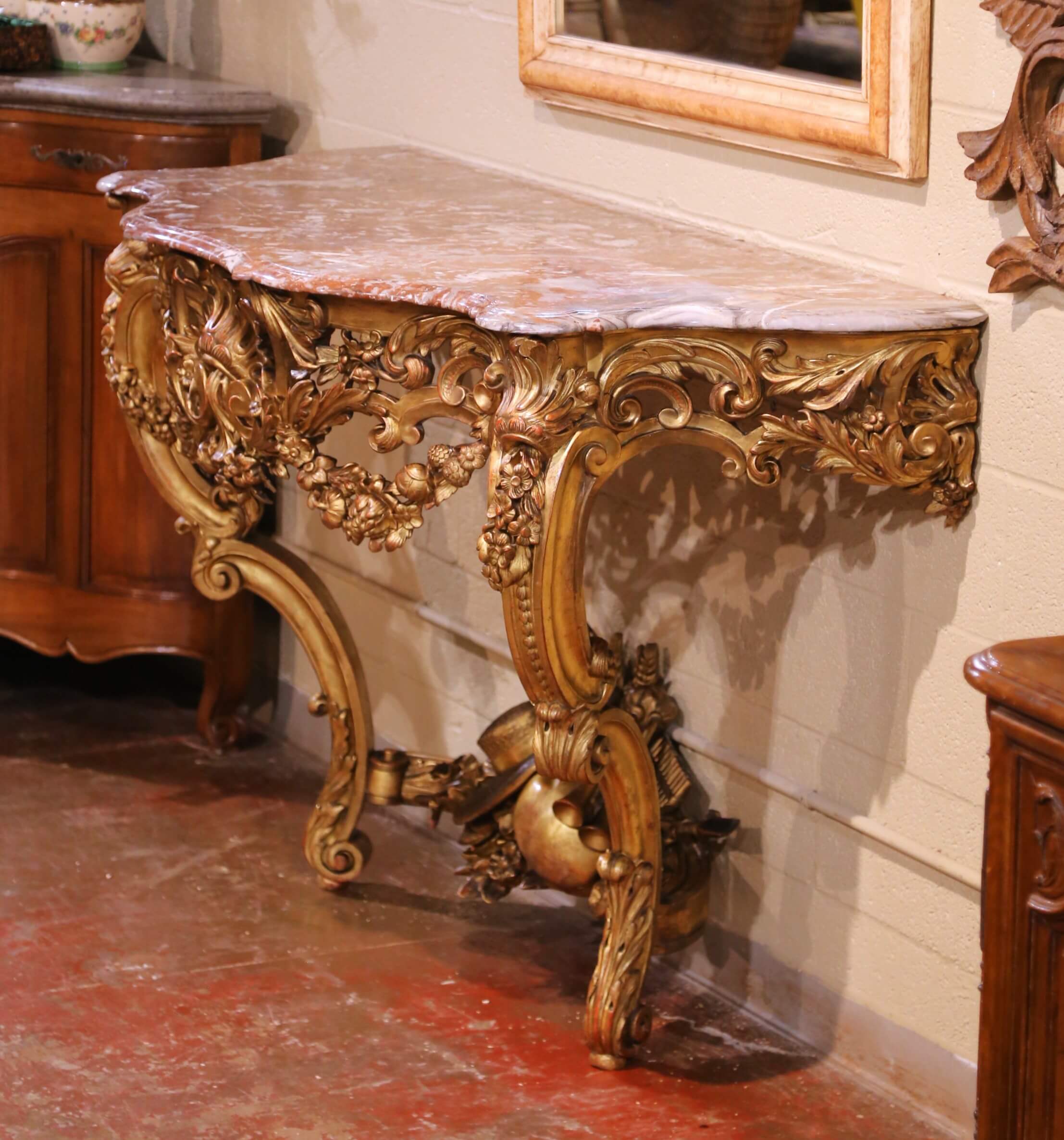 Early 19th Century French Louis XV Rococo Giltwood Console with Rouge Marble Top
