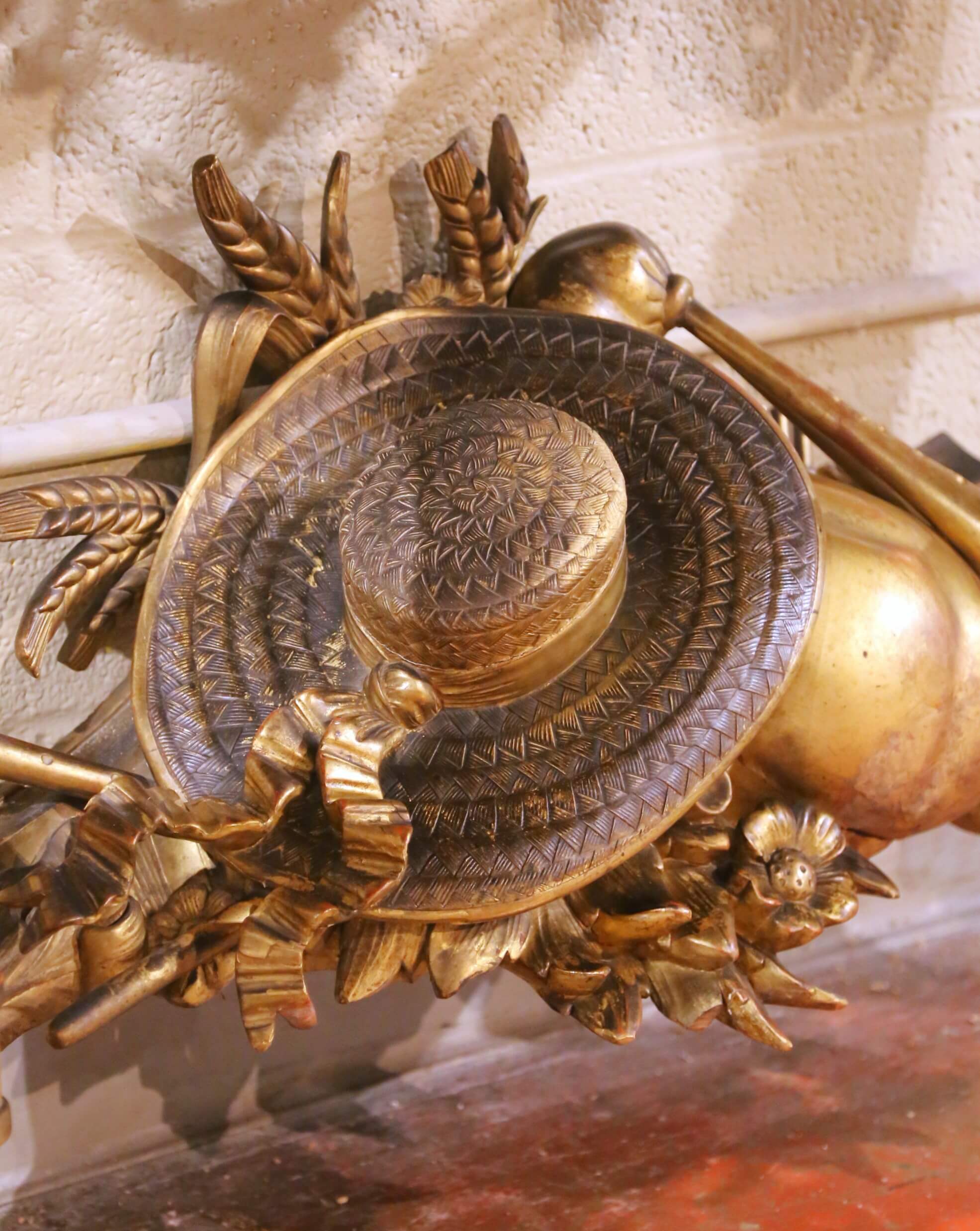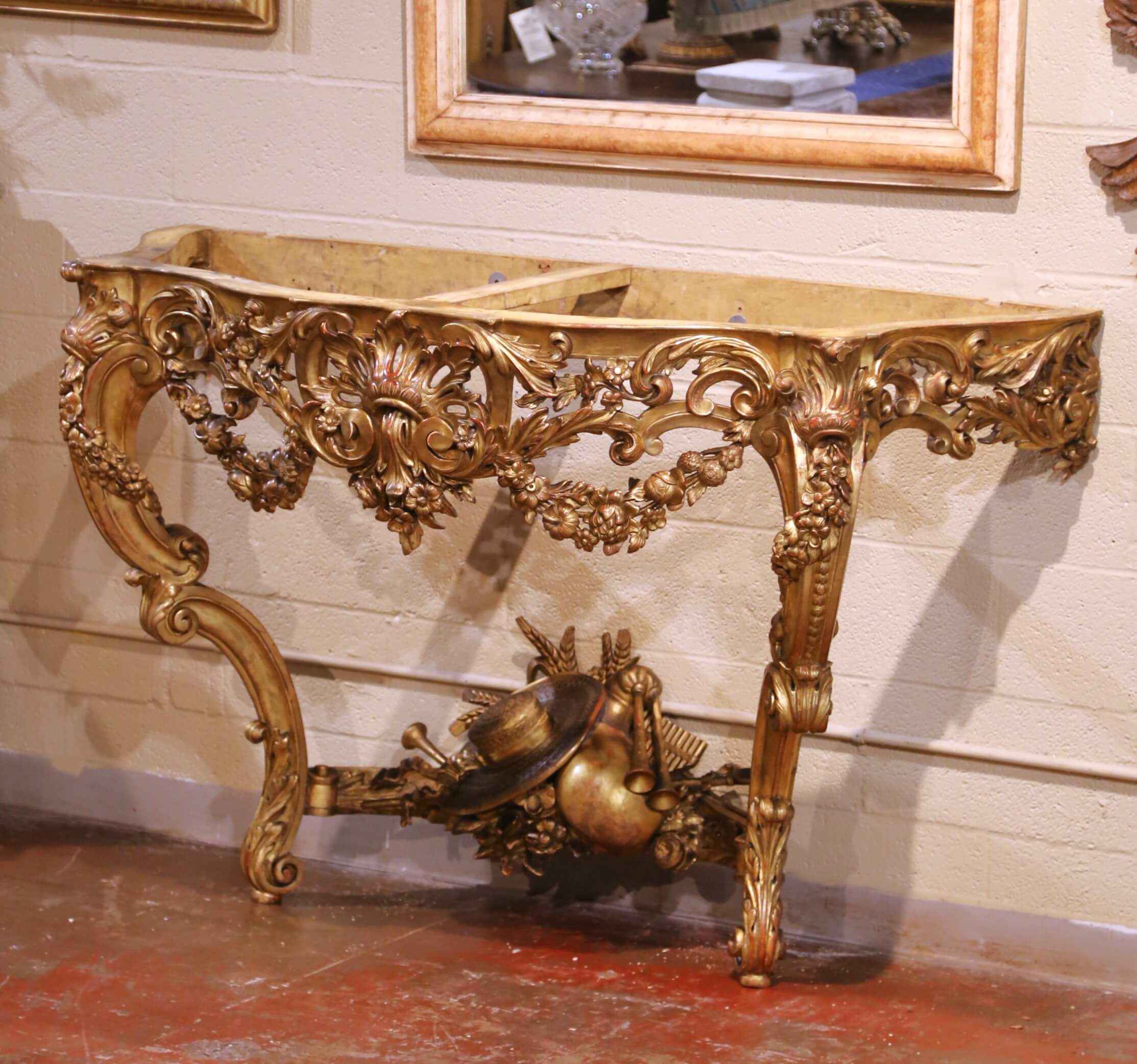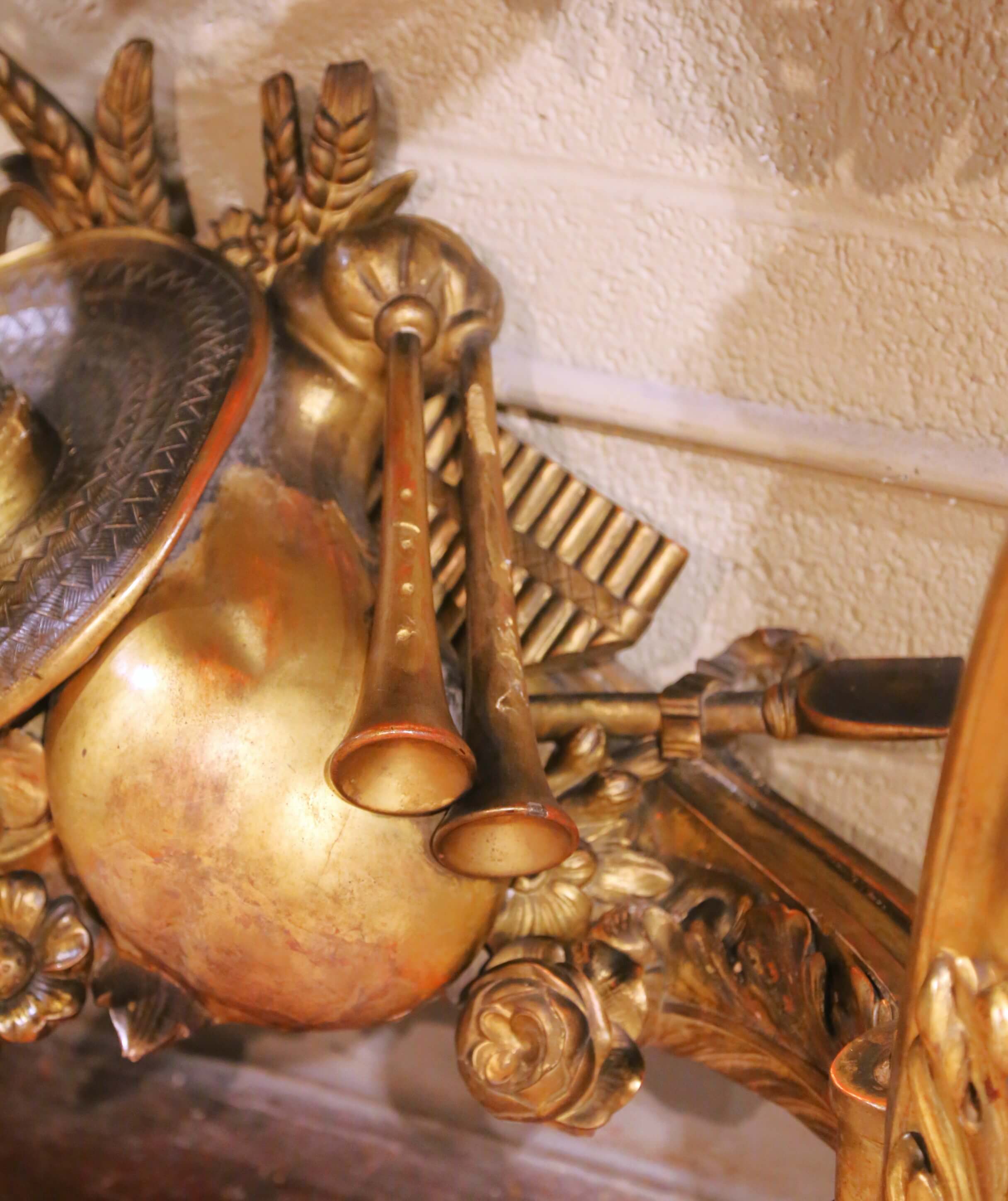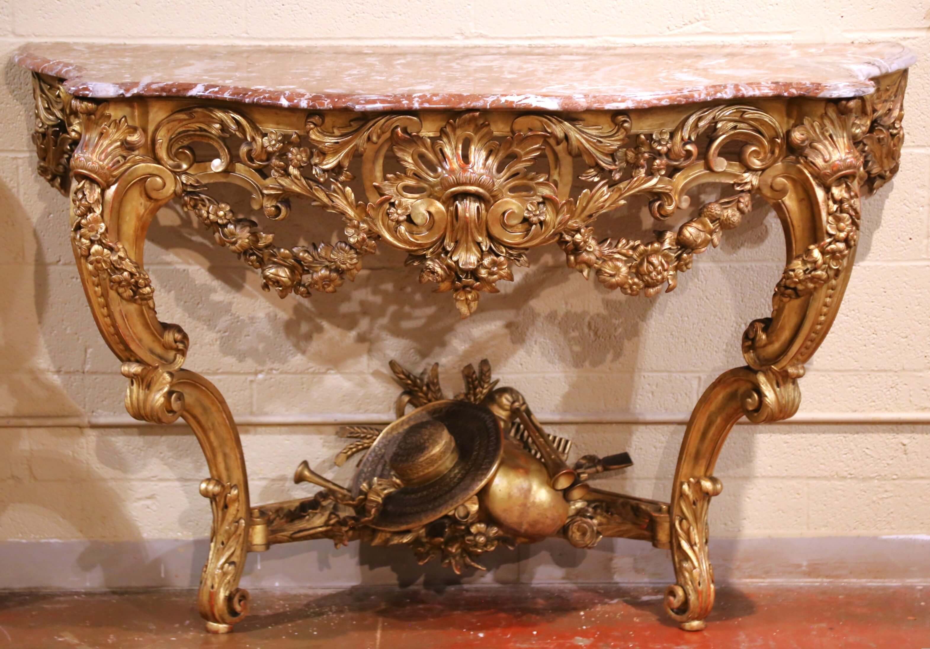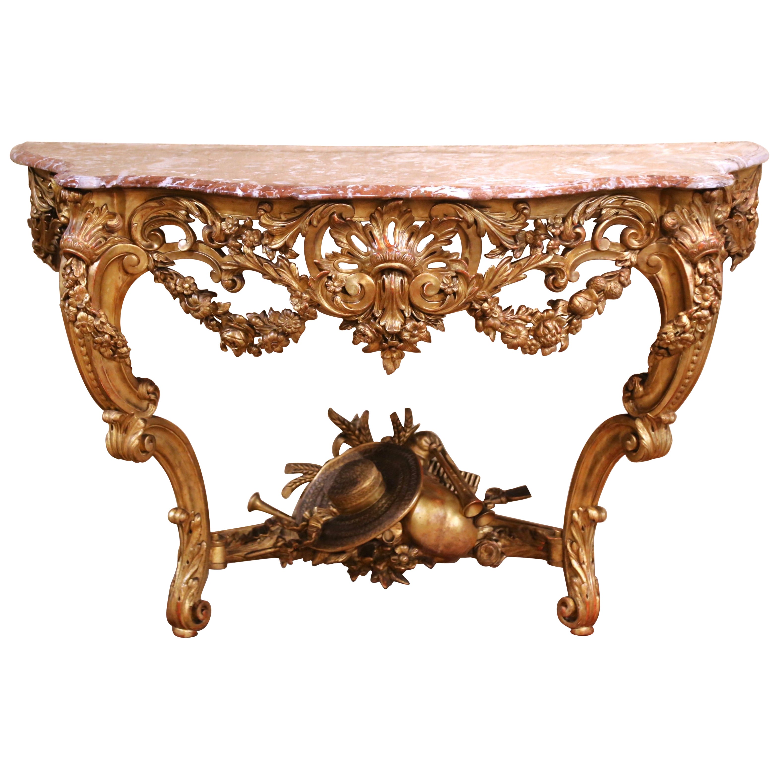 The console stands on cabriole legs joined by a shaped stretcher centered with a decorative trophy motif, composed of musical and pastoral attributes including a horn, sheaf of wheat, and a finely detailed hat, adding a romantic and allegorical touch. The carved elements retain a warm, timeworn gilt patina, highlighting the depth and artistry of the carving.
