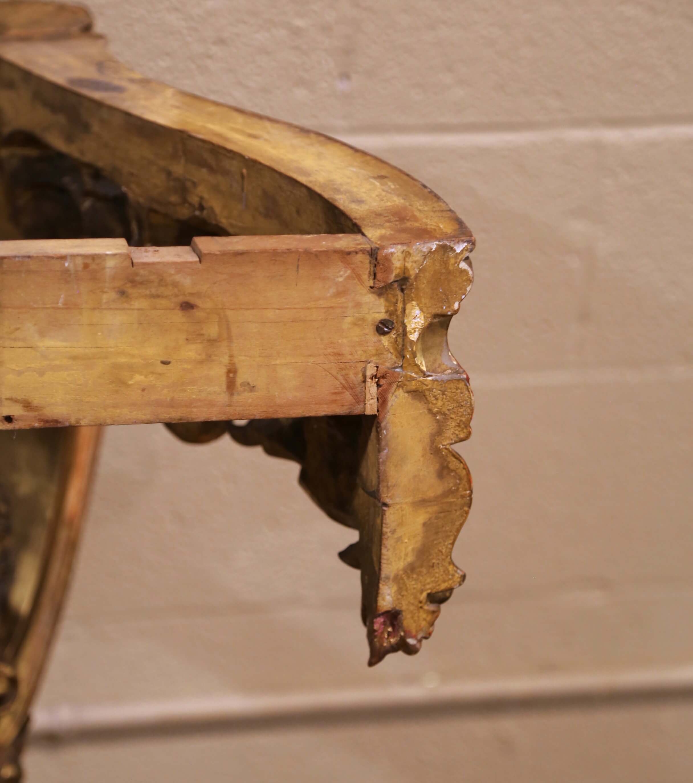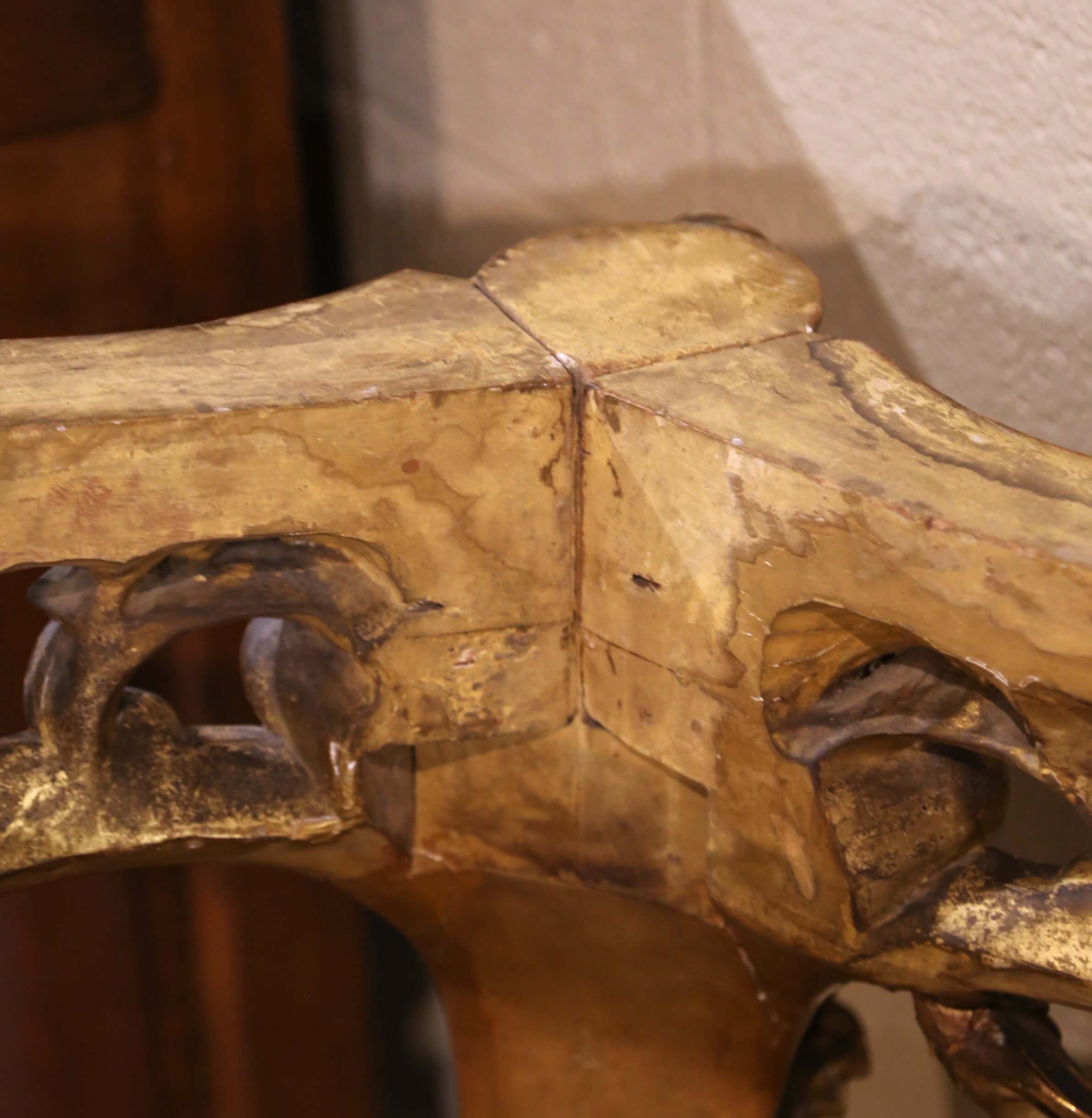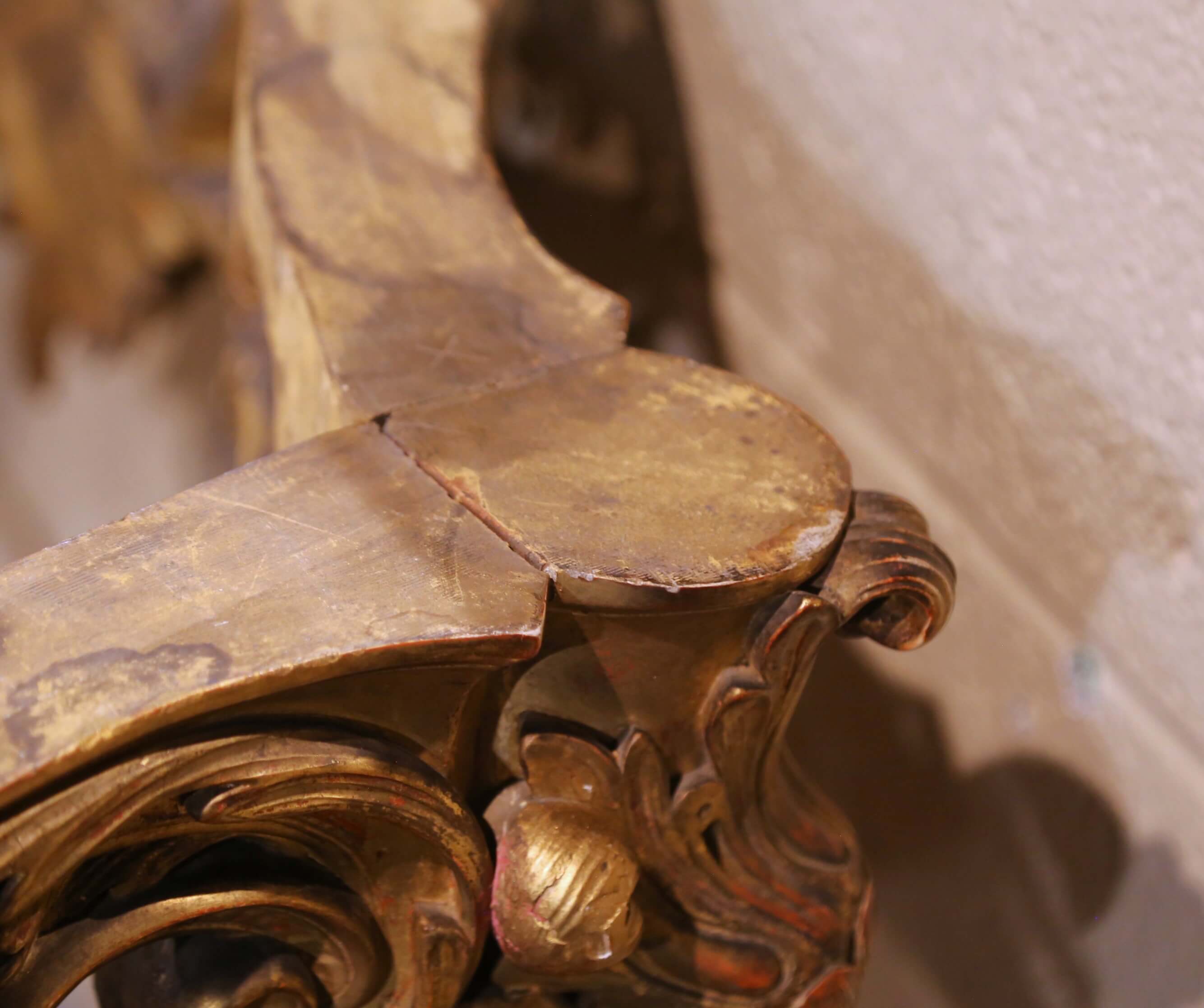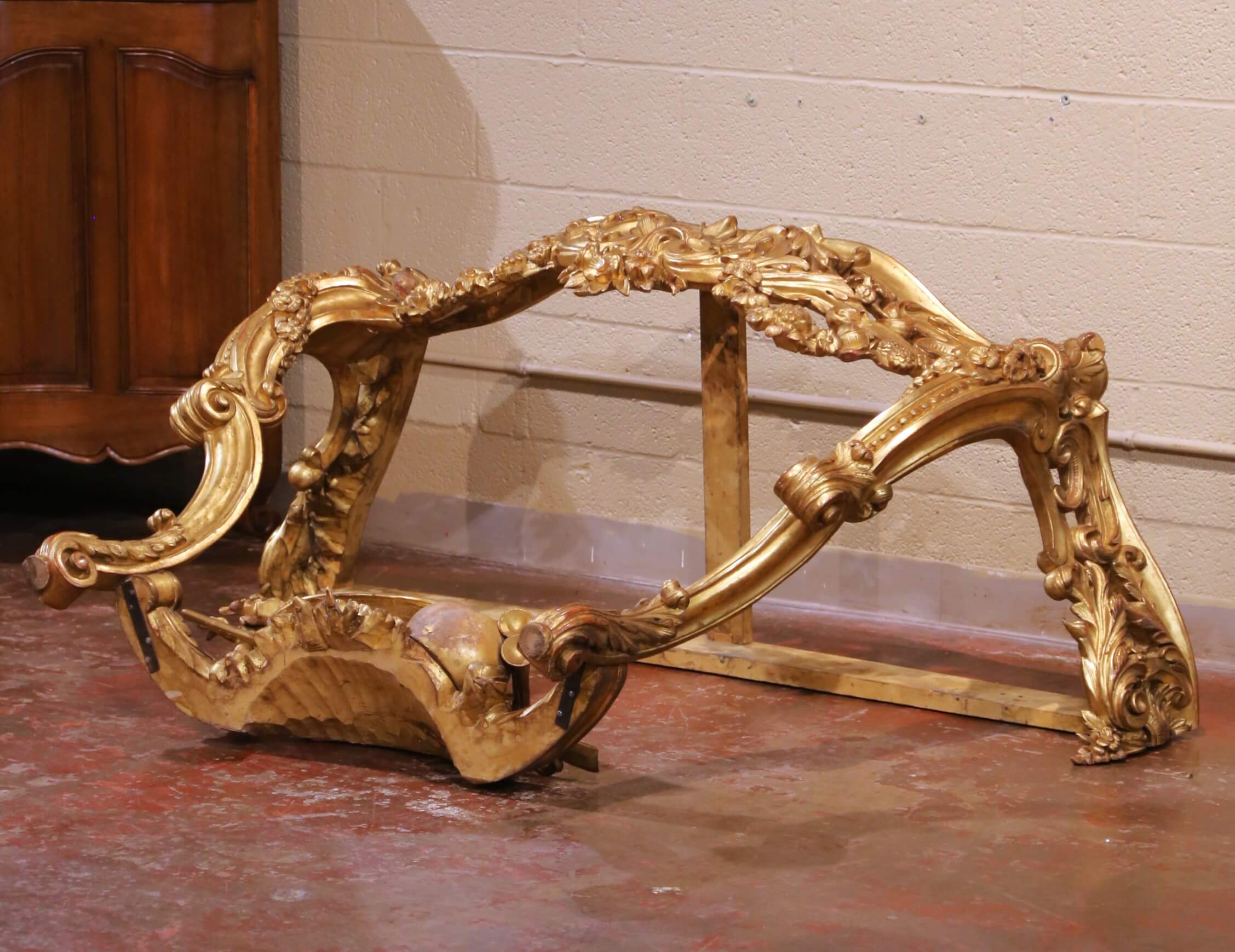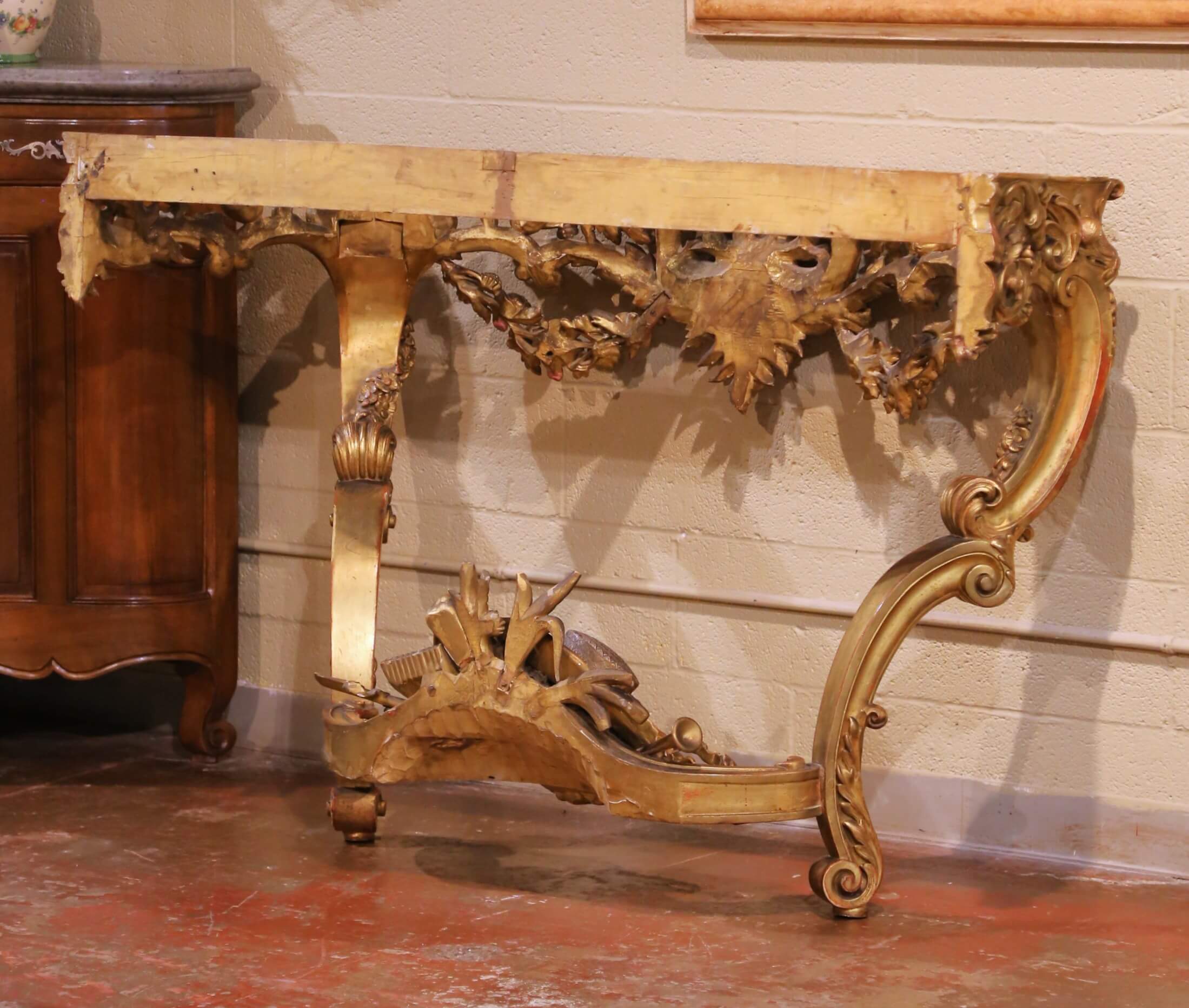 Place this elegant antique console table against a wall in an entry, hallway, or salon for a striking statement of early 19th century French craftsmanship. Crafted in France circa 1820, the demilune form features a richly carved giltwood base with exceptional openwork decoration. The apron is adorned with intricate Rococo-inspired scrolls, acanthus leaves, and floral garlands, all finely sculpted with deep relief and remarkable movement.