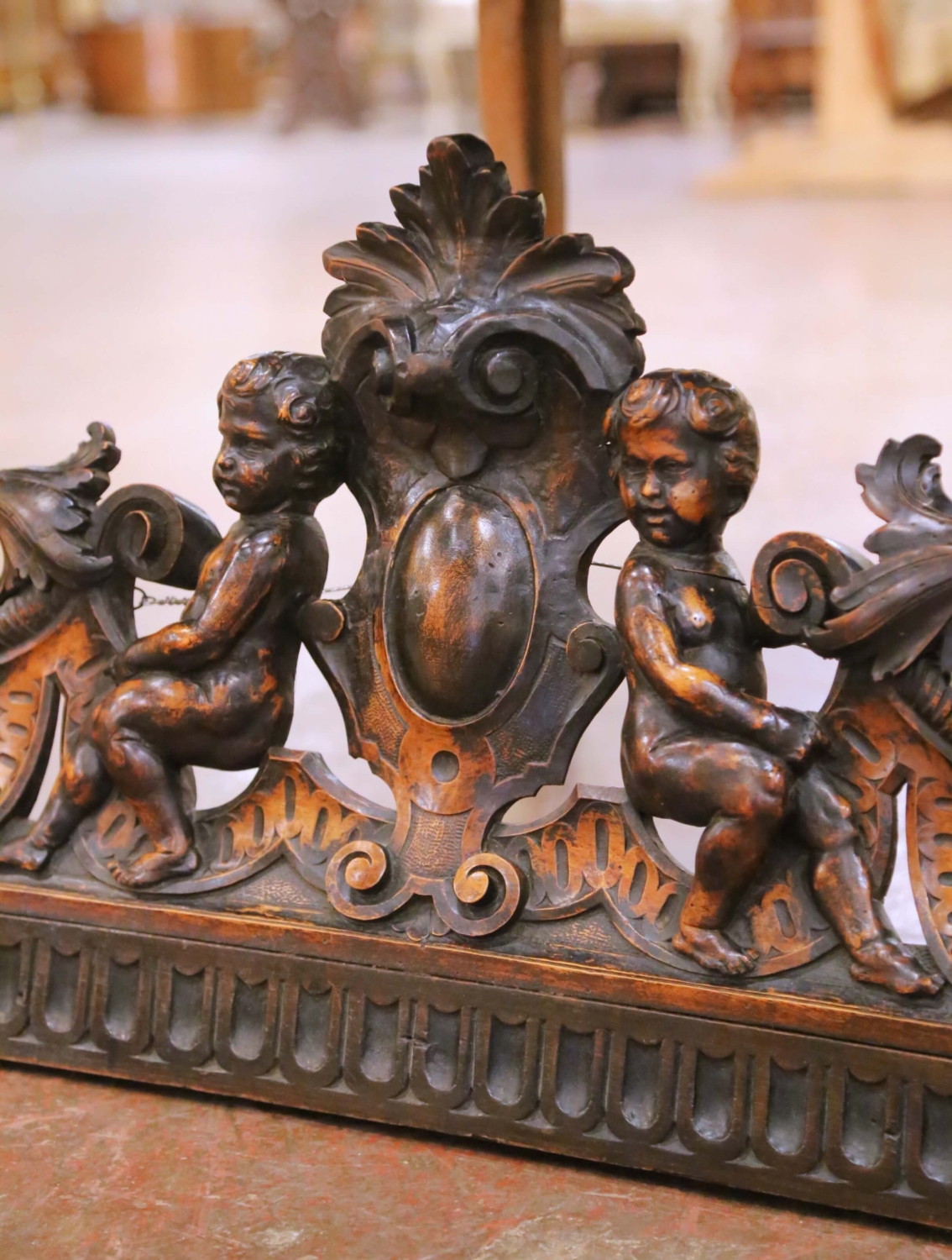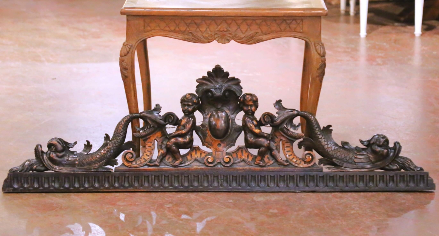 This impressive antique walnut architectural carving dates to the early 19th century, circa 1820, and reflects the transitional Louis XVI to early Restoration style in France. Carved from solid walnut, the composition is centered by a bold classical cartouche flanked by two finely modeled putti, each rendered with expressive facial features, rounded forms, and confident anatomical detail. Flowing acanthus scrolls and marine-inspired motifs extend outward in a balanced, symmetrical arrangement, creating a strong sense of movement while maintaining architectural discipline. The carving is deep and assured throughout, demonstrating the hand of a highly skilled artisan. Measuring nearly five feet in length, this substantial carving was originally intended as a decorative pediment for a cabinet or as part of integrated boiserie, and may also have been used as an overdoor in a finely paneled interior. The walnut surface retains a warm, time-softened patina with gentle wear and oxidation consistent with age, enhancing its authenticity and sculptural presence. Today, it offers striking decorative potential as a wall-mounted focal point, above a console or sideboard, or incorporated into an architectural vignette. Excellent condition commensurate with age and use. with a warm and rich patina. Dimensions: 58.75″ W x 17.25″ H
