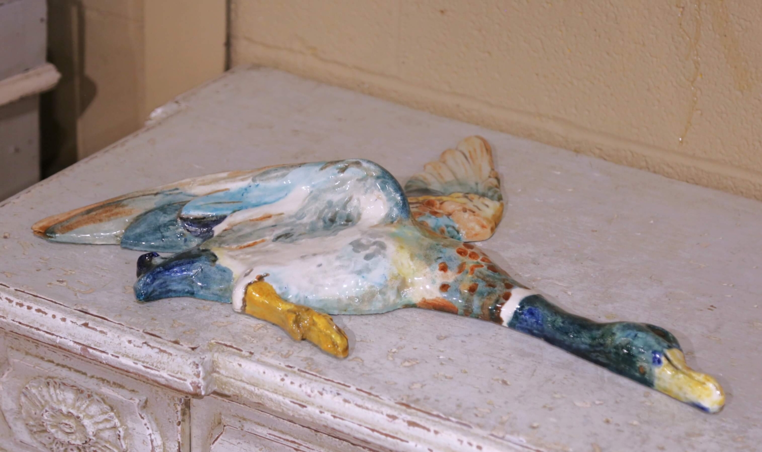 This striking antique French wall sculpture depicts a mallard duck in mid-flight, modeled in high relief with wings raised and neck fully extended. Crafted in France circa 1900, the dynamic composition reflects the fluid naturalism and movement characteristic of the Art Nouveau period. The elongated horizontal format and sculptural depth give the piece strong decorative presence while remaining ideal for wall display. Executed in glazed ceramic faience over a terracotta earthenware body and finished using the traditional barbotine slip technique, the surface displays vibrant painterly tones of cobalt blue, celadon green, ochre, cream, and earthy brown. The thick slip application creates richly dimensional feather detailing across the wings and breast, while natural glaze pooling, tonal variation, and kiln effects enhance its handcrafted character. The underside reveals a beautifully mottled glaze in blues and warm honey tones and retains the original hanging wire. The work is clearly impressed “Lachenal” along with a model number, confirming authenticity. Edmond Lachenal was a celebrated French ceramicist associated with the Art Nouveau movement. A former collaborator of Théodore Deck, he established his own Paris workshop where he became known for innovative art pottery, faience, barbotine ceramics, and naturalistic animal subjects. His work was exhibited internationally and remains highly sought after within early 20th century French decorative arts. This antique glazed faience and terracotta ceramic wall plaque is in excellent condition commensurate with age and use, with minor glaze variations inherent to the firing process. A rare and decorative sporting subject, ideal for a country house, hunting lodge, library, or curated collection of French Art Nouveau ceramics. Dimensions: 23.25″W x 3″D x 18″H
