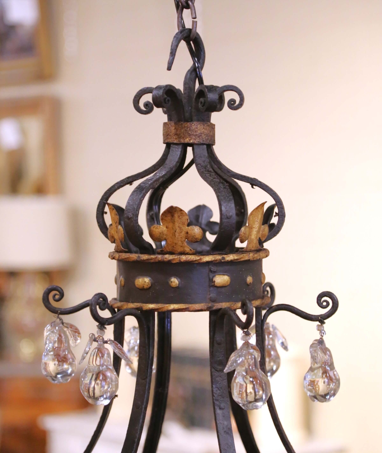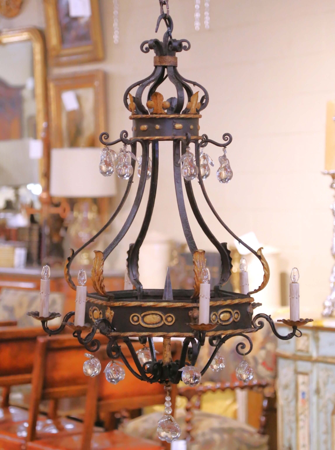 Bring a refined touch of Old-World charm to any room with this beautifully crafted French chandelier, forged in France circa 1920. Designed in the Louis XV taste, the fixture features a graceful cage-form silhouette composed of hand-wrought iron finished in a deep black patina. Gilt accents highlight the scrolling arms, foliate appliqués, and molded medallions along the octagonal center ring, giving the piece a warm, time-softened glow. The chandelier is fitted with four lights, each newly wired for modern use and set over scalloped bobeches with candle sleeve covers. Below, an array of hand-cut crystal pendants, charming pear-shaped drops with delicately sculpted leaves, catch and scatter the light beautifully. Additional crystal beads and a central finial lend even more sparkle and movement. A gilt crown-style top completes the composition, enhancing its regal, antique presence. This wonderfully decorative fixture is in excellent condition commensurate with age and use, and would complement an entryway, dining room, or living area seeking authentic French elegance. Measures: 29″ W × 43″ H.