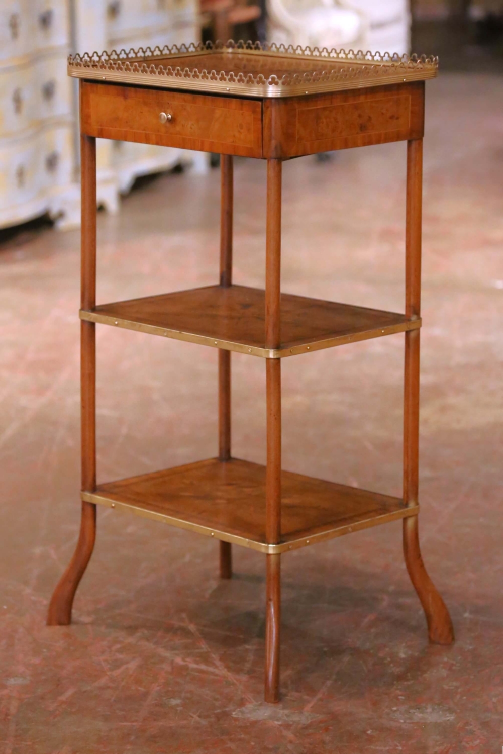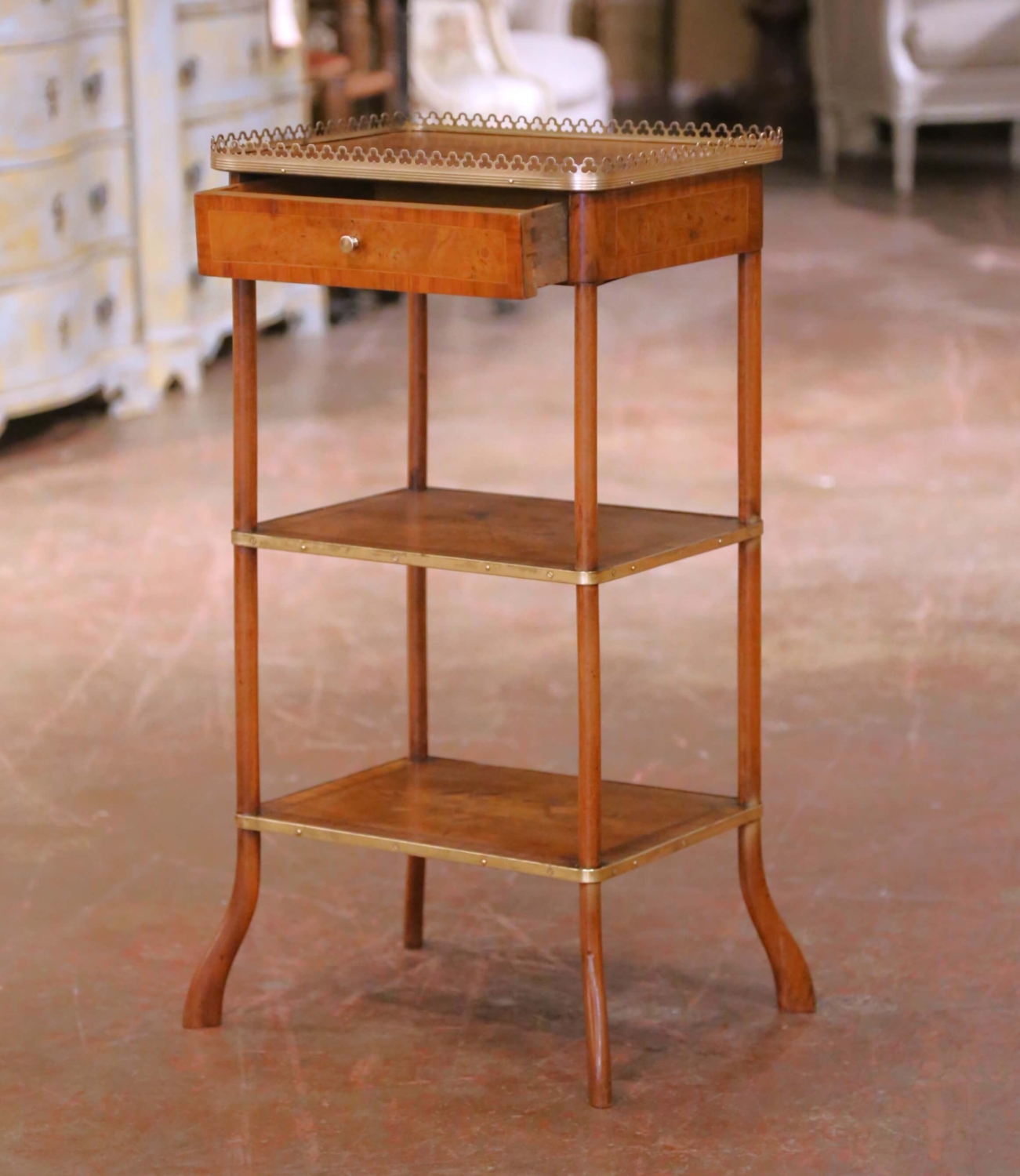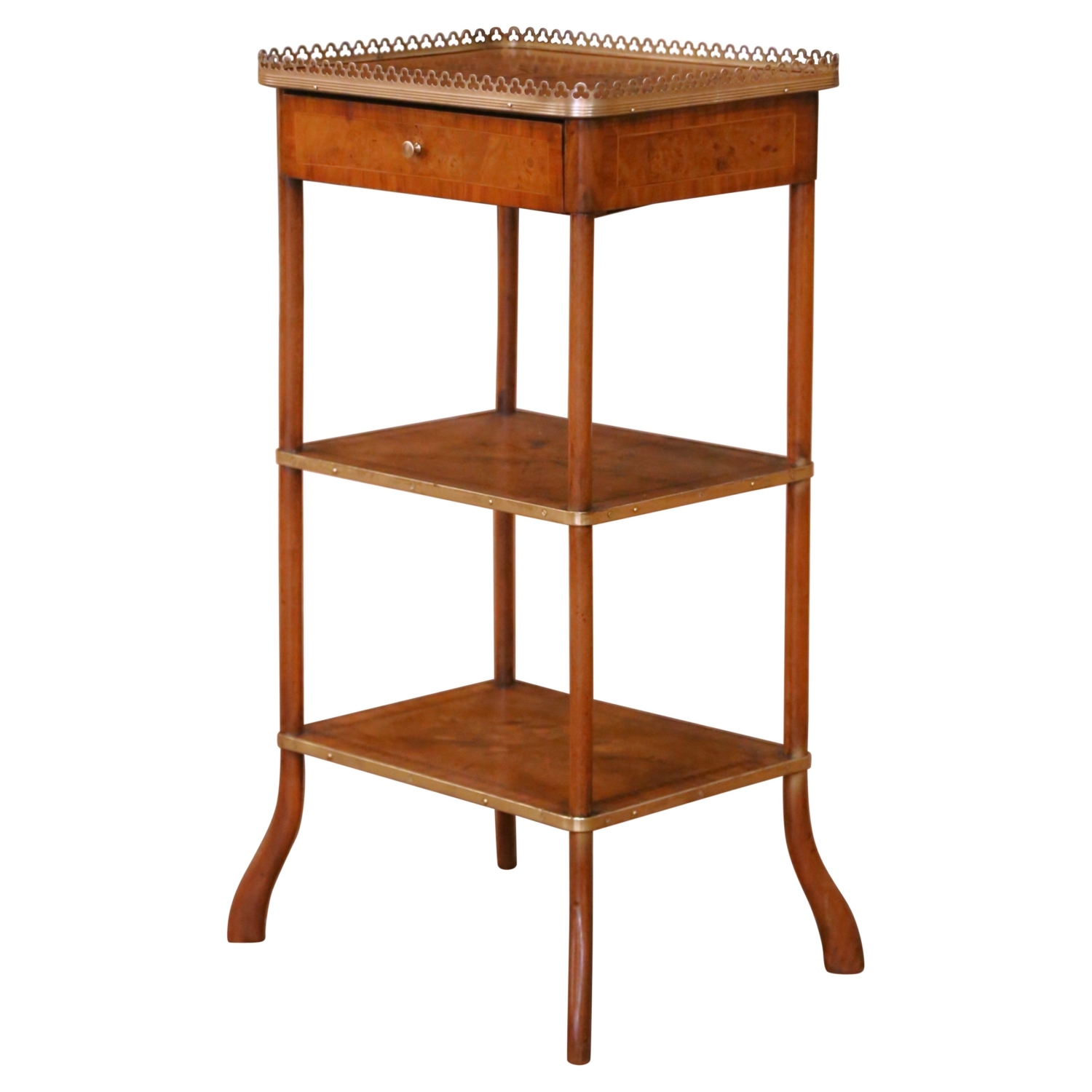 Crafted in France circa 1920, this refined antique side table or étagère reflects the enduring elegance of Louis XVI–inspired design, interpreted through early 20th-century French craftsmanship. The rectangular top is richly veneered in walnut and features delicate floral marquetry centered by a classical musical trophy motif, framed within fine inlaid borders. A pierced brass gallery surrounds the top, adding both visual definition and functional protection. Below the top, a single drawer with original turned pull provides discreet storage, while two graduated lower shelves offer practical display space. The table is raised on slender, gently tapering legs that terminate in subtle sabre curves, reinforcing the light, architectural proportions characteristic of the style. Brass banding accents the shelf edges and structural junctions, lending a refined contrast to the warm walnut tones. This antique French table is in excellent condition commensurate with age and use, with a beautifully preserved walnut patina and light surface wear consistent with careful handling over time. Elegant yet versatile, it is ideal as a bedside table, lamp stand, or accent piece in a living room, hallway, or study. Dimensions 16.25″ W x 12.25″ D x 30.75″ H