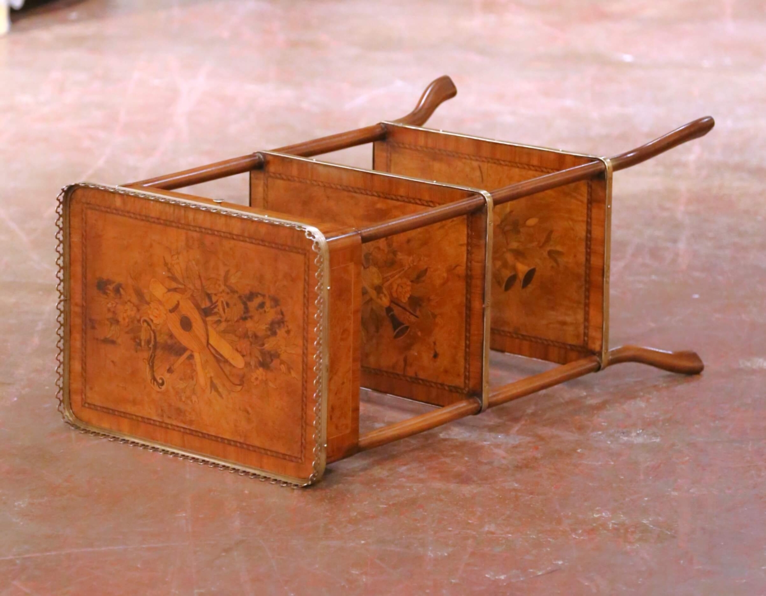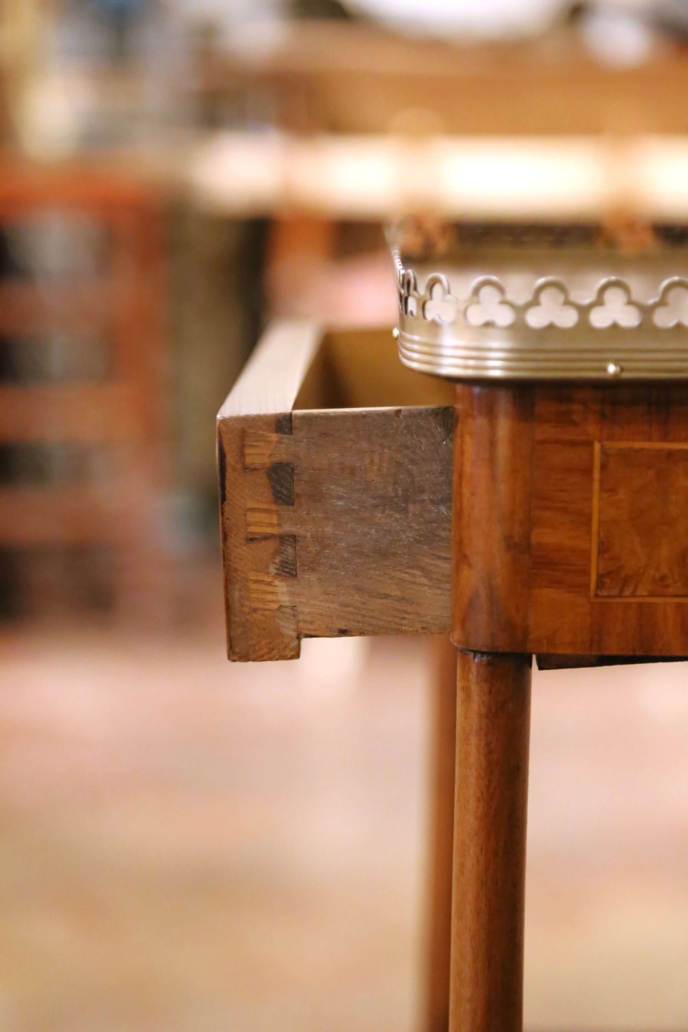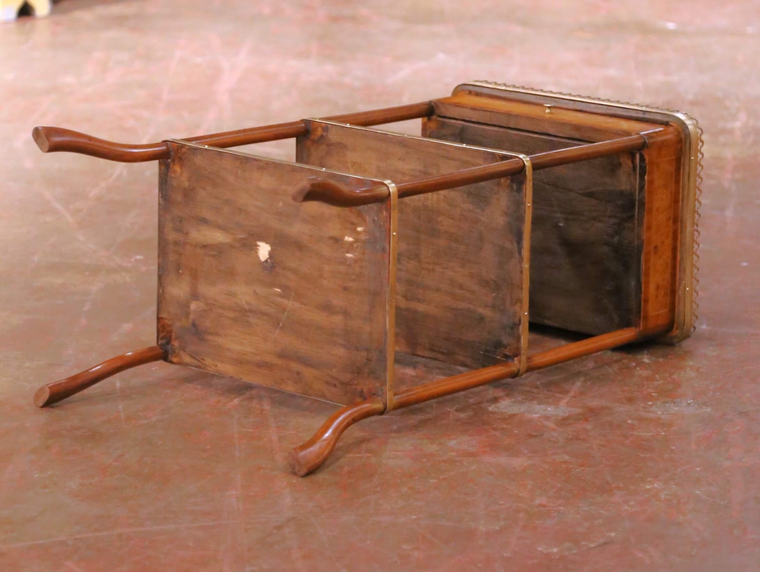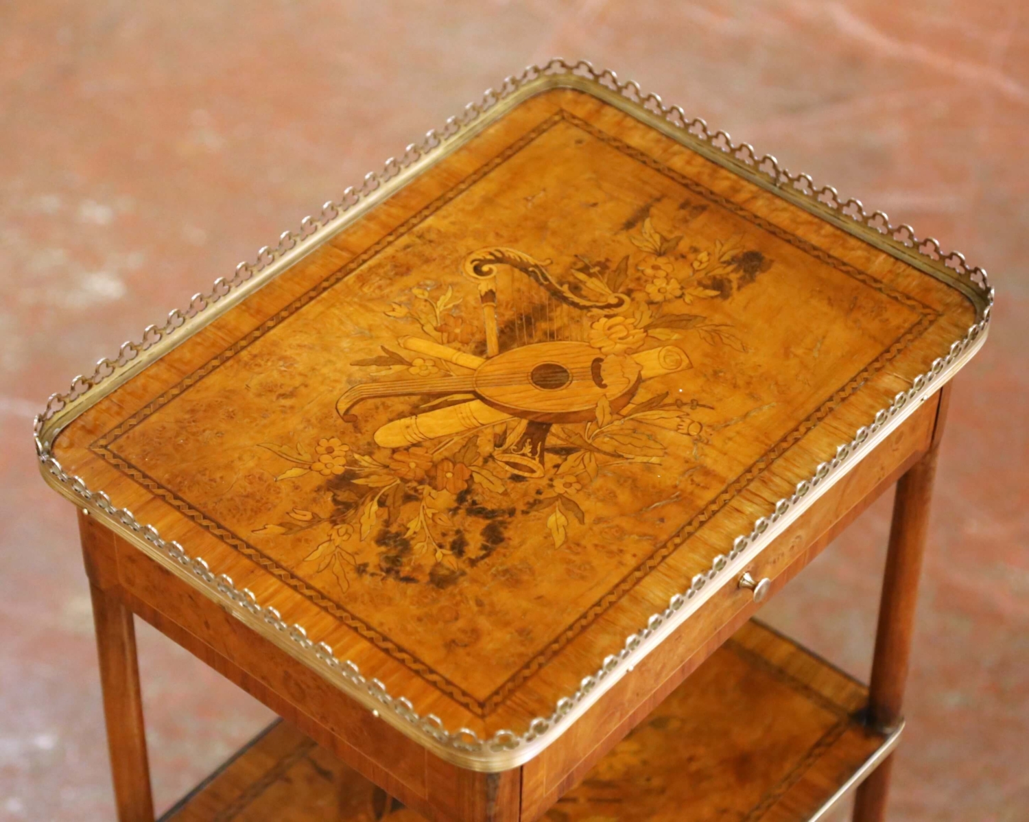 Crafted in France circa 1920, this refined antique side table or étagère reflects the enduring elegance of Louis XVI–inspired design, interpreted through early 20th-century French craftsmanship. The rectangular top is richly veneered in walnut and features delicate floral marquetry centered by a classical musical trophy motif, framed within fine inlaid borders. A pierced brass gallery surrounds the top, adding both visual definition and functional protection. Below the top, a single drawer with original turned pull provides discreet storage, while two graduated lower shelves offer practical display space. The table is raised on slender, gently tapering legs that terminate in subtle sabre curves, reinforcing the light, architectural proportions characteristic of the style. Brass banding accents the shelf edges and structural junctions, lending a refined contrast to the warm walnut tones. This antique French table is in excellent condition commensurate with age and use, with a beautifully preserved walnut patina and light surface wear consistent with careful handling over time. Elegant yet versatile, it is ideal as a bedside table, lamp stand, or accent piece in a living room, hallway, or study. Dimensions 16.25″ W x 12.25″ D x 30.75″ H