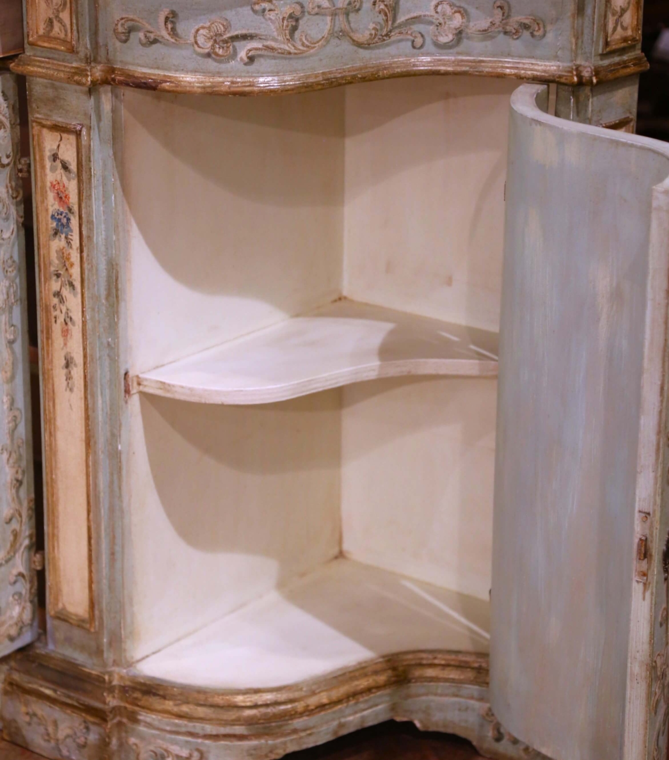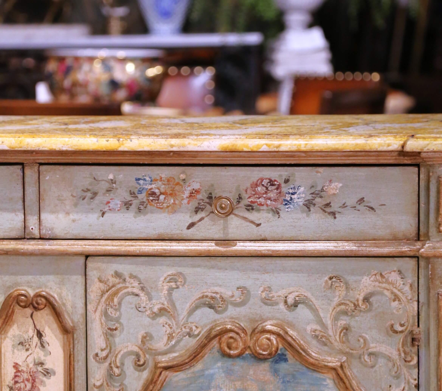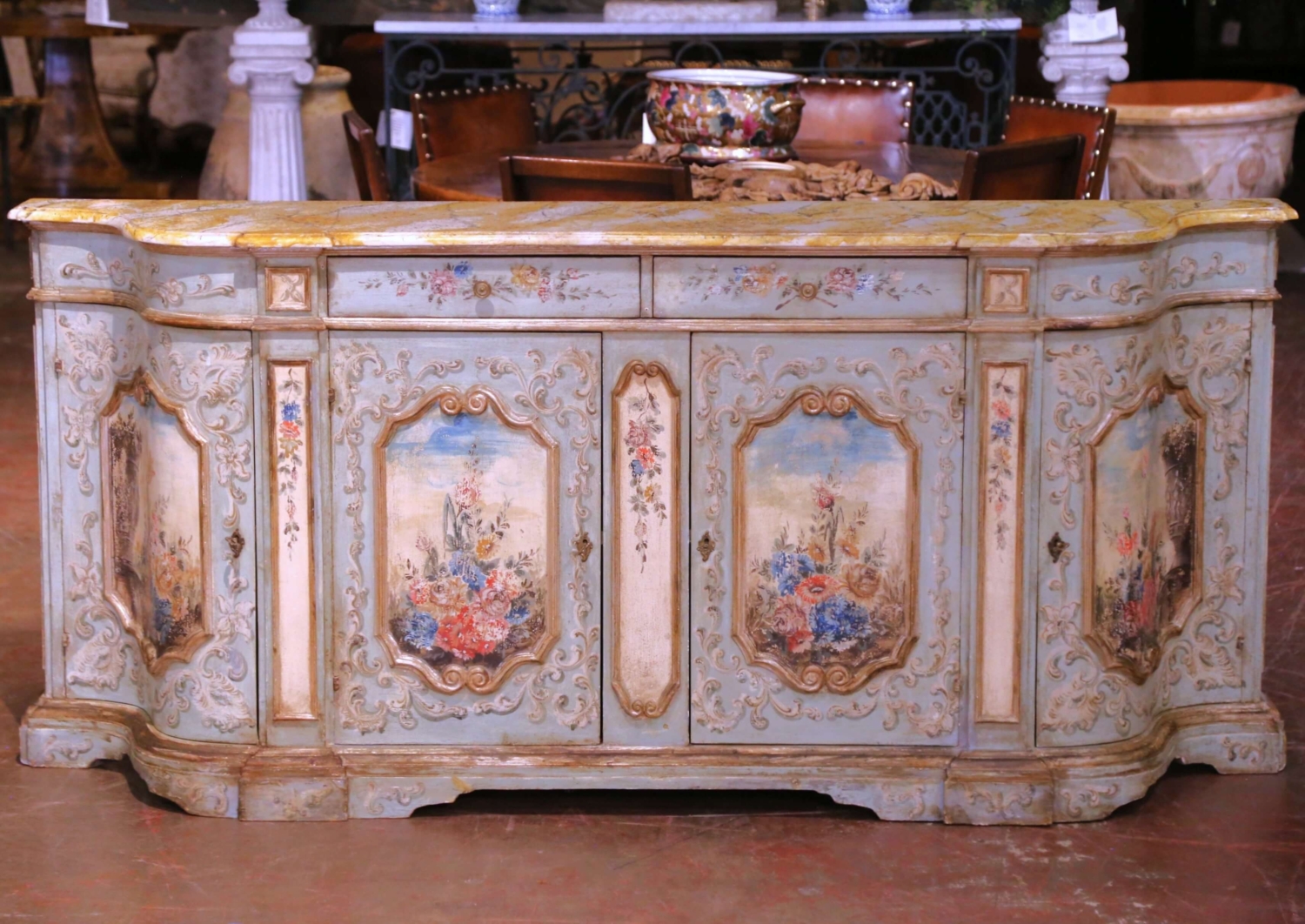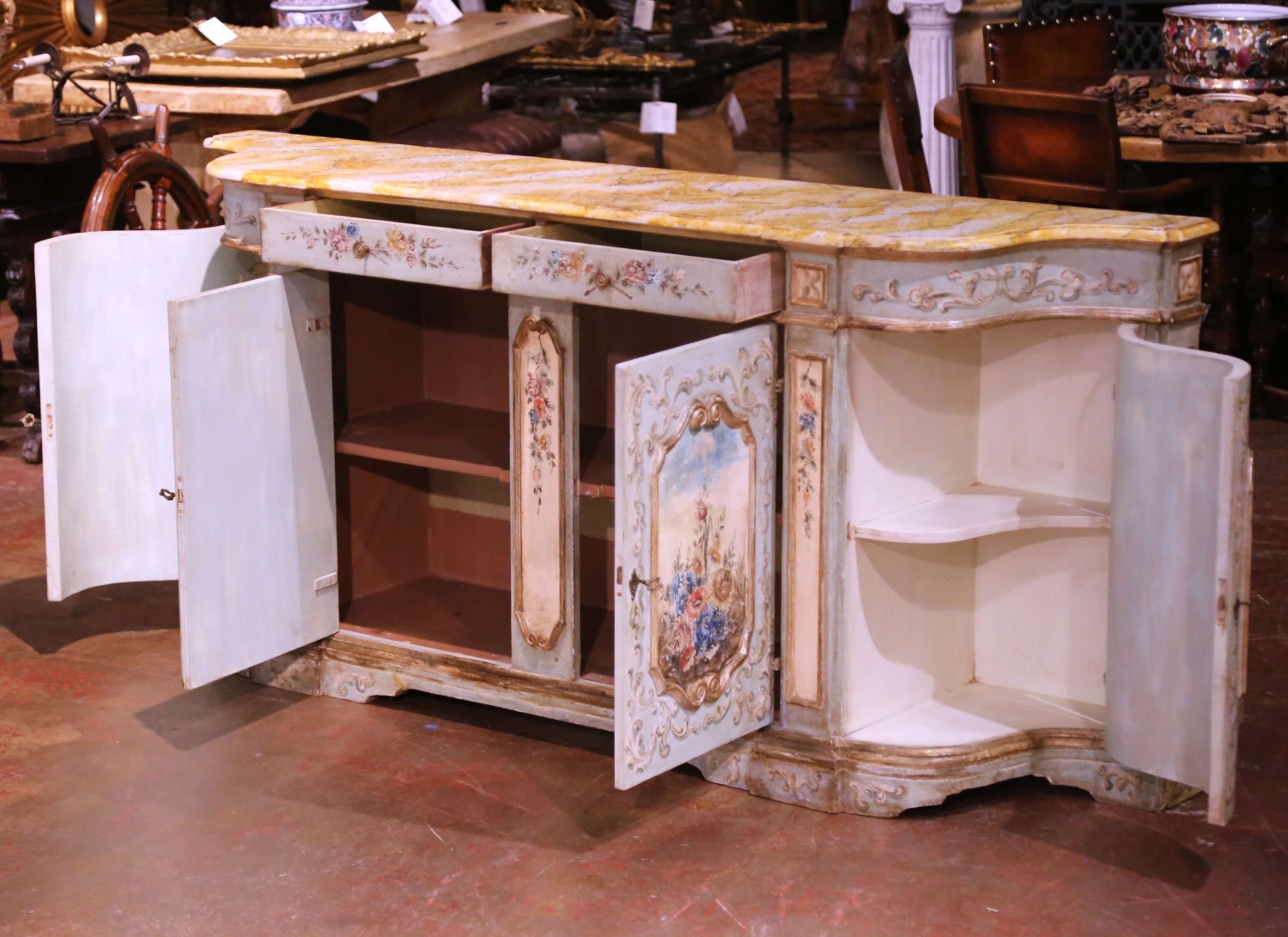 Bring timeless Venetian charm to an entryway or dining room with this exquisite painted sideboard from Italy, circa early 20th century. The serpentine-front cabinet features two frieze drawers above paneled doors, each beautifully hand-painted with romantic floral bouquets framed by raised rocaille scrollwork. Additional sprays of flowers decorate the pilasters, drawer fronts, and sides, all rendered in soft tones of rose, blue, and gold over a pale celadon ground. The shaped wooden top is finished in a richly veined faux marble pattern in ochre and ivory, evoking the warmth of Sienna marble and adding sophistication to the pastel palette. Inside, the cabinet offers generous storage with a single fixed shelf and curved side compartments, ideal for linens, serveware, or barware. The conforming bracket base completes the graceful silhouette. Retaining its original, intentionally distressed patina, this Italian painted credenza exemplifies the artistry and craftsmanship long associated with Venetian furniture. Excellent condition commensurate with age and use. Measures: 88″ W × 19.5″ D × 40″ H.