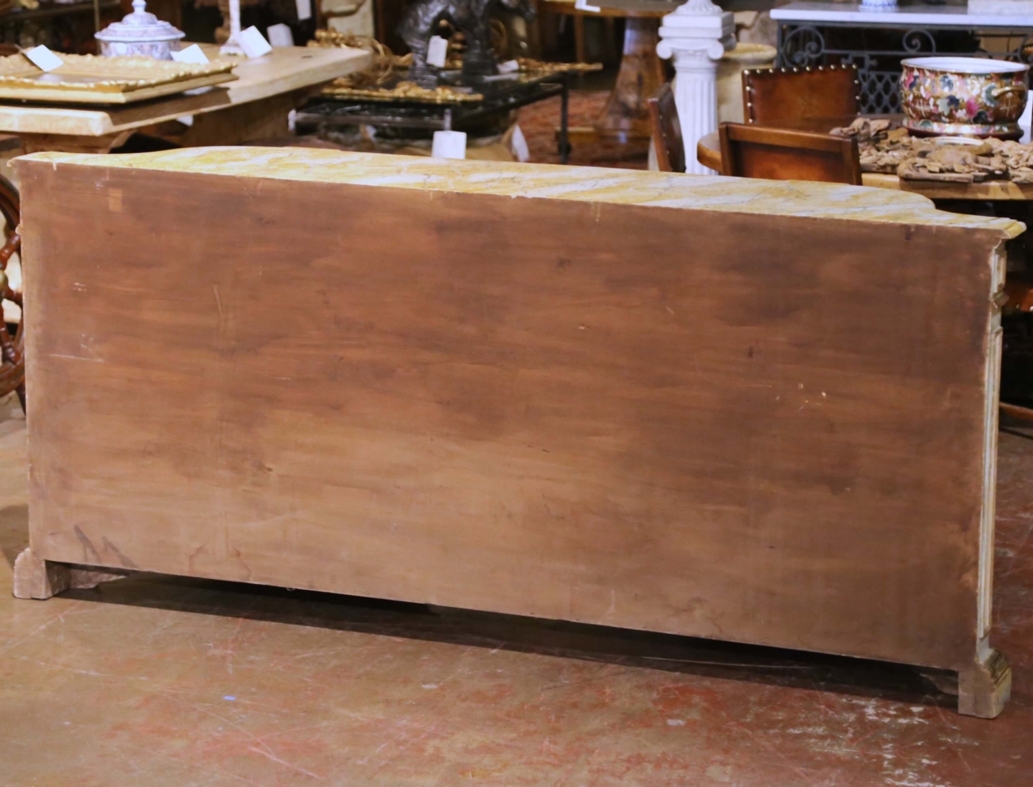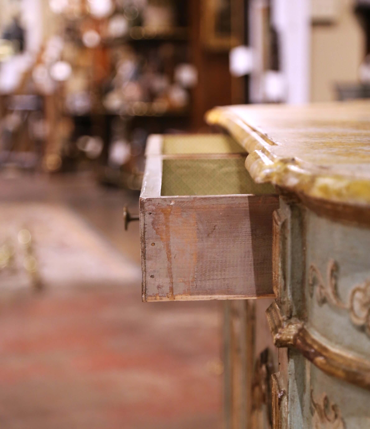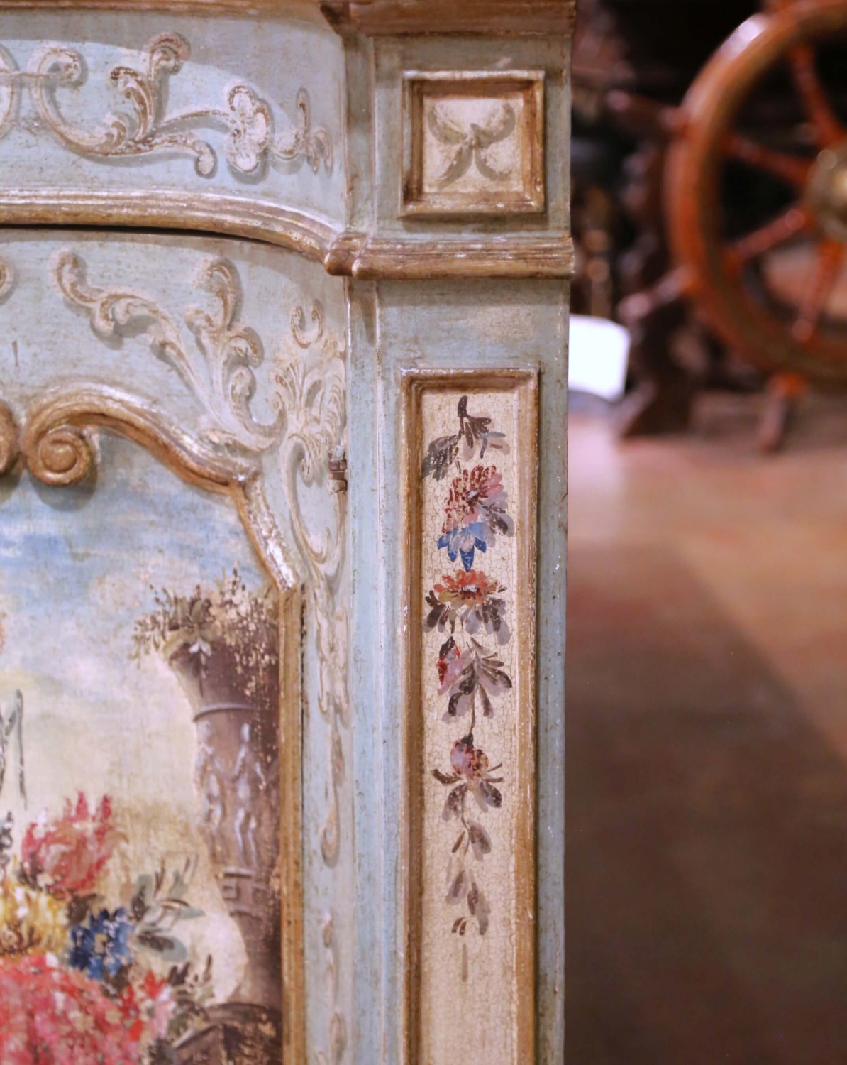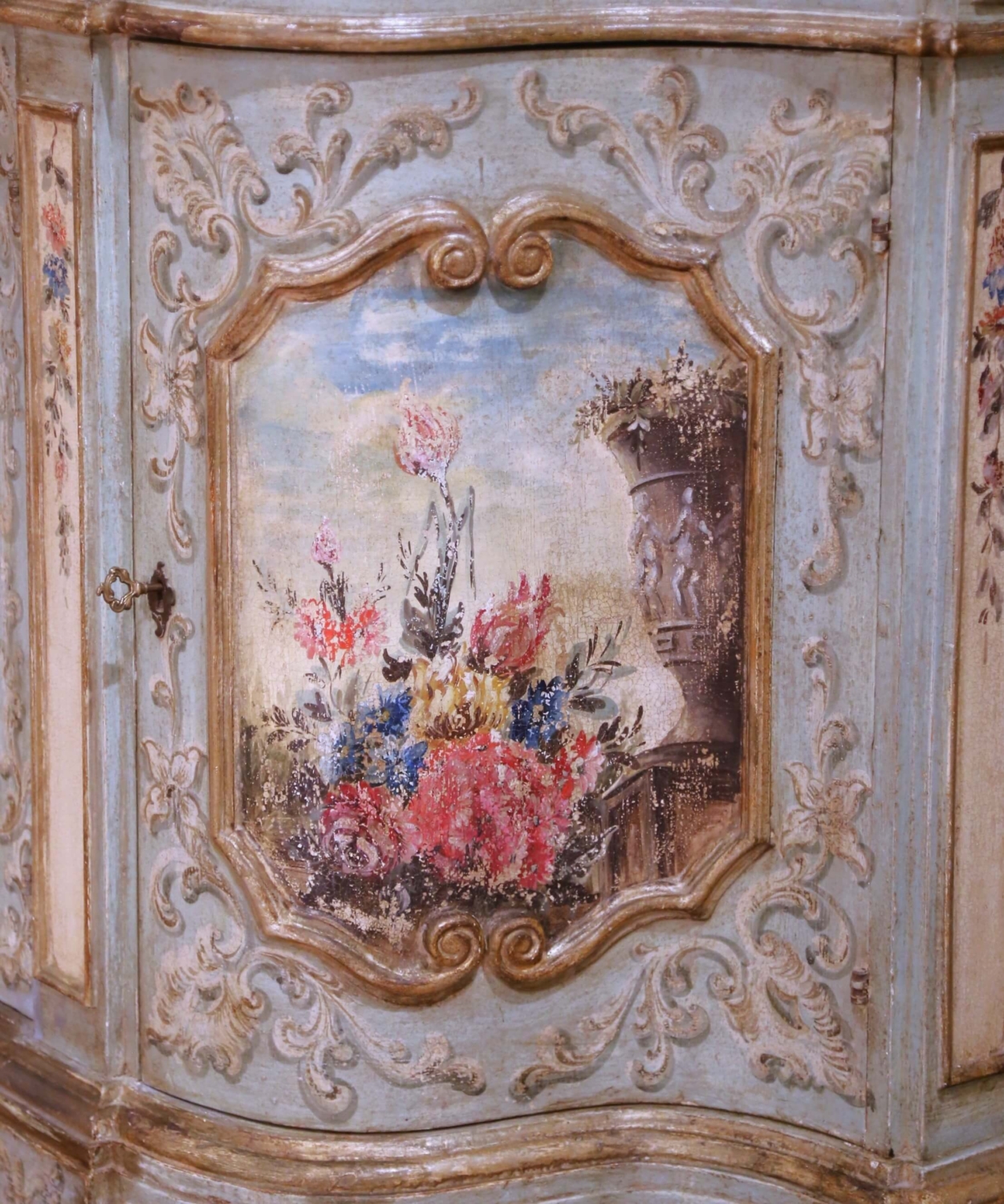 Bring timeless Venetian charm to an entryway or dining room with this exquisite painted sideboard from Italy, circa early 20th century. The serpentine-front cabinet features two frieze drawers above paneled doors, each beautifully hand-painted with romantic floral bouquets framed by raised rocaille scrollwork. Additional sprays of flowers decorate the pilasters, drawer fronts, and sides, all rendered in soft tones of rose, blue, and gold over a pale celadon ground. The shaped wooden top is finished in a richly veined faux marble pattern in ochre and ivory, evoking the warmth of Sienna marble and adding sophistication to the pastel palette. Inside, the cabinet offers generous storage with a single fixed shelf and curved side compartments, ideal for linens, serveware, or barware. The conforming bracket base completes the graceful silhouette. Retaining its original, intentionally distressed patina, this Italian painted credenza exemplifies the artistry and craftsmanship long associated with Venetian furniture. Excellent condition commensurate with age and use. Measures: 88″ W × 19.5″ D × 40″ H.